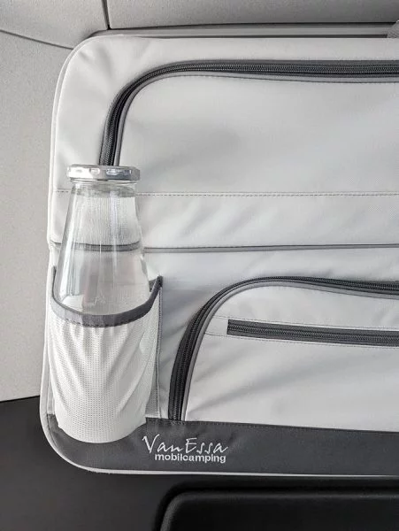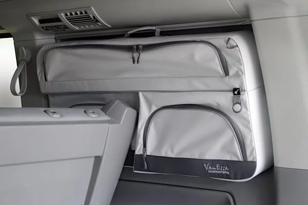 - Instalación sin complicaciones: Estas alforjas son autoportantes y no requieren tornillos, pegamento o velcro para mantenerse en su lugar. Se mantienen mediante un panel trasero fijo, lo que facilita su montaje y desmontaje en segundos. Por la parte de arriba, la pared trasera de la alforja se sujeta por sí sola entre la ventana y los soportes de la cortinilla parasol para T5/6/6.1 Multivan ó entre la ventana y la persiana oscurecedora para T5/6/6.1 California Ocean/Beach. En el caso de furgonetas T5/6/6.1 sin revestimiento en las ventanas traseras (a chapa vista), es necesario una soportes de fijación adicional que se suministran (ver manuales de instrucciones).