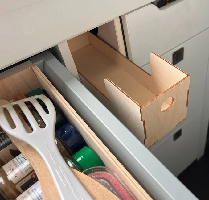 La ampliación del cajón de cubiertos soluciona este problema de forma sencilla y eficaz. Se integra perfectamente en el cajón original, permitiendo abrir y cerrar con total normalidad, mientras añade un compartimento adicional que incrementa la capacidad sin modificar el mueble ni afectar a su uso diario.