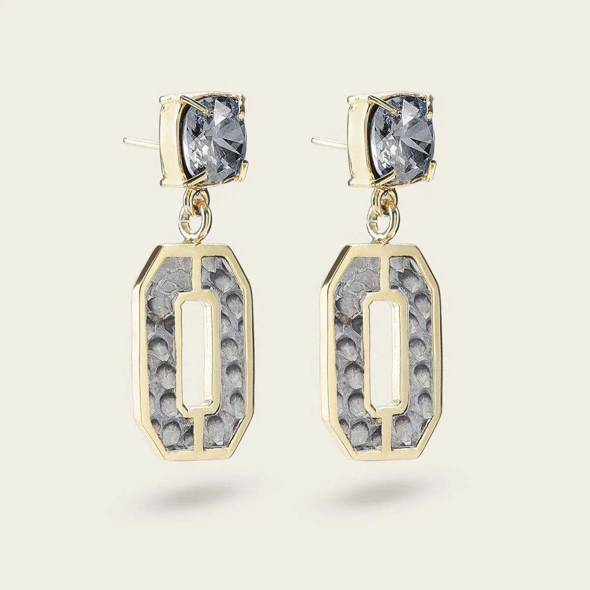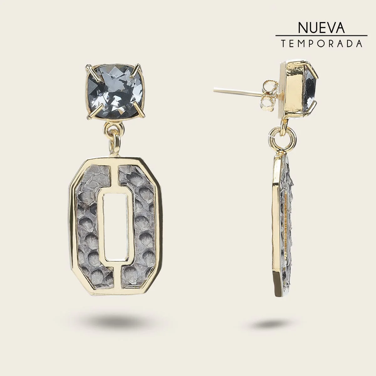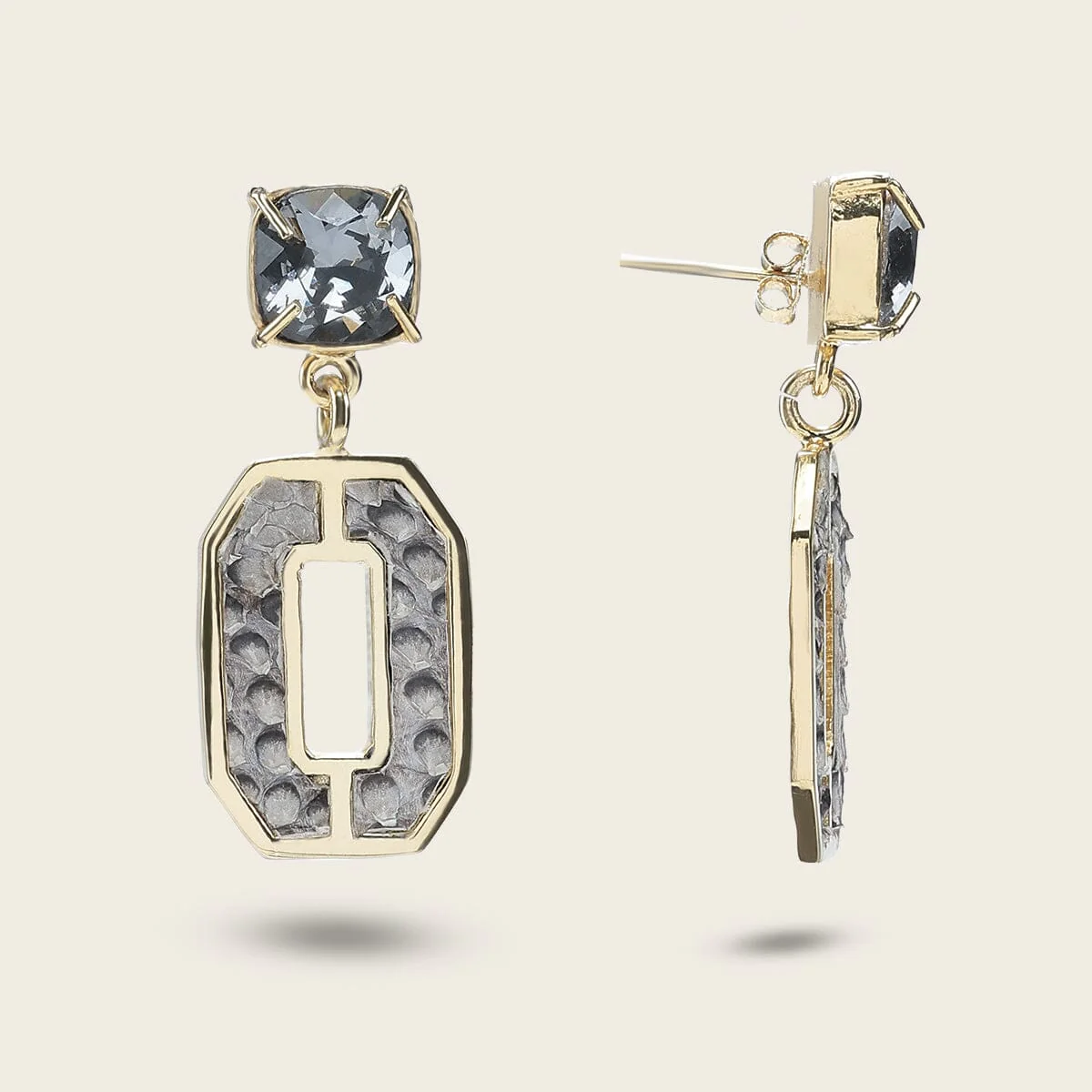 Aretes para dama en latón con baño de oro. Con aplicaciones en piel genuina de pitón y cristales auténticos swarovski. Altura aproximada del arete: 4.3 cm. Tamaño aproximado de los cristales: 1 cm.