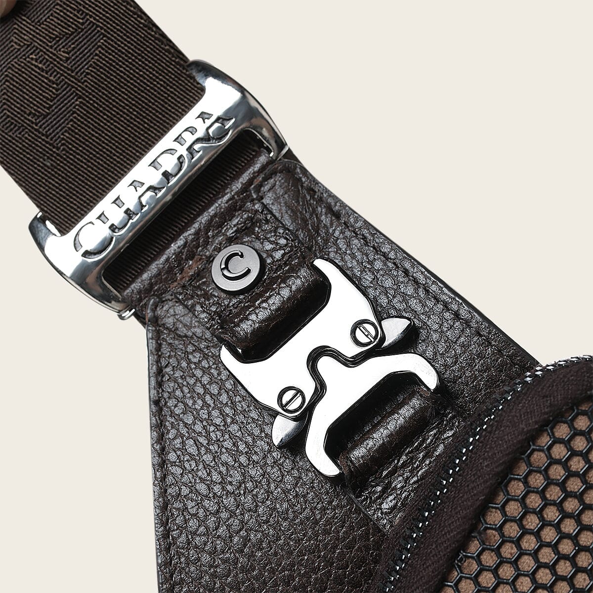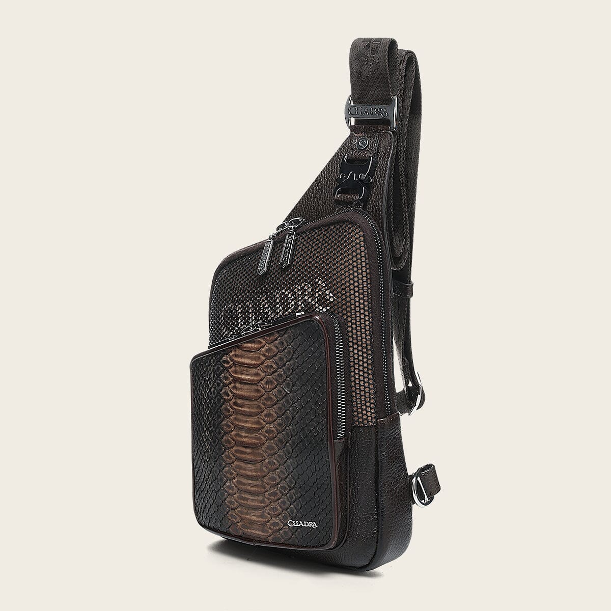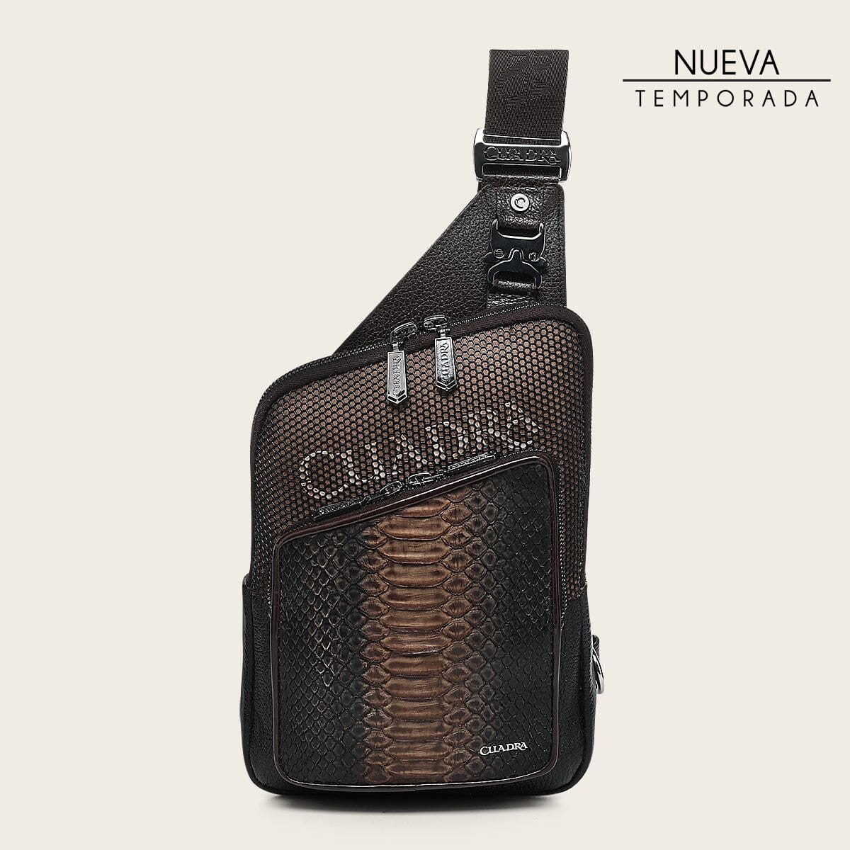 Bandolera para caballero en piel genuina de pitón y piel de bovino. Al frente presenta aplicación metálica del logotipo y logotipo Cuadra encapsulado bajo KPU micro inyectado en motivos geométricos. Cuenta con dos compartimentos asegurados con cierre, el compartimento de mayor tamaño cuenta con cuatro espacios para tarjetas. La parte trasera cuenta con malla textil transpirable y asa textil ajustable asegurada con broche.