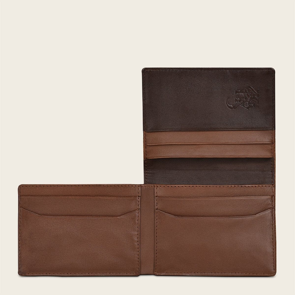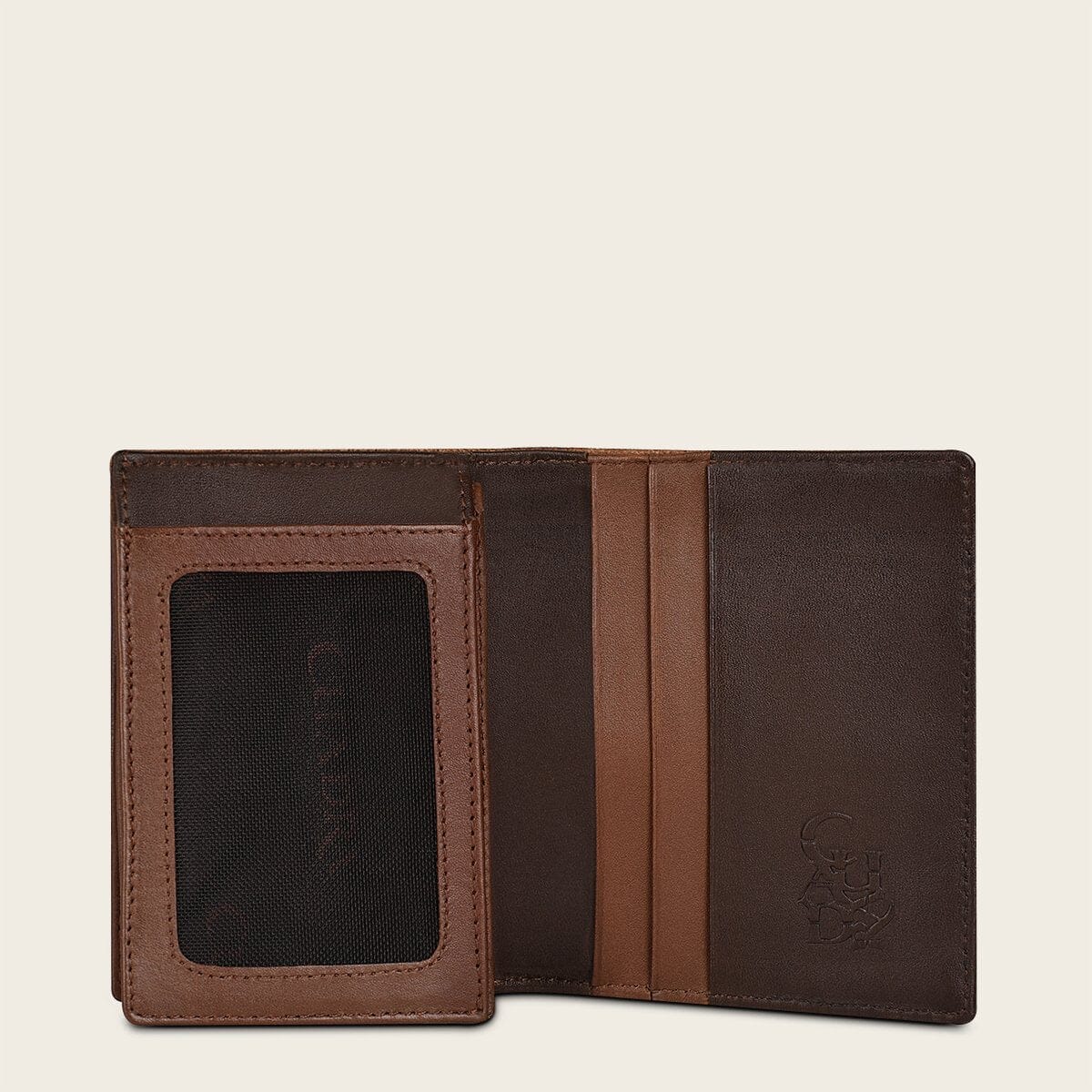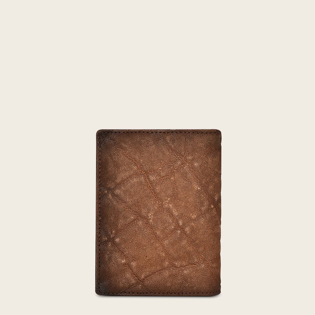 Billetera para caballero en piel genuina de elefante y piel de bovino. Al frente presenta una aplicación metálica de monograma Cuadra. En su interior cuenta con un espacio para efectivo y diez espacios para tarjetas.