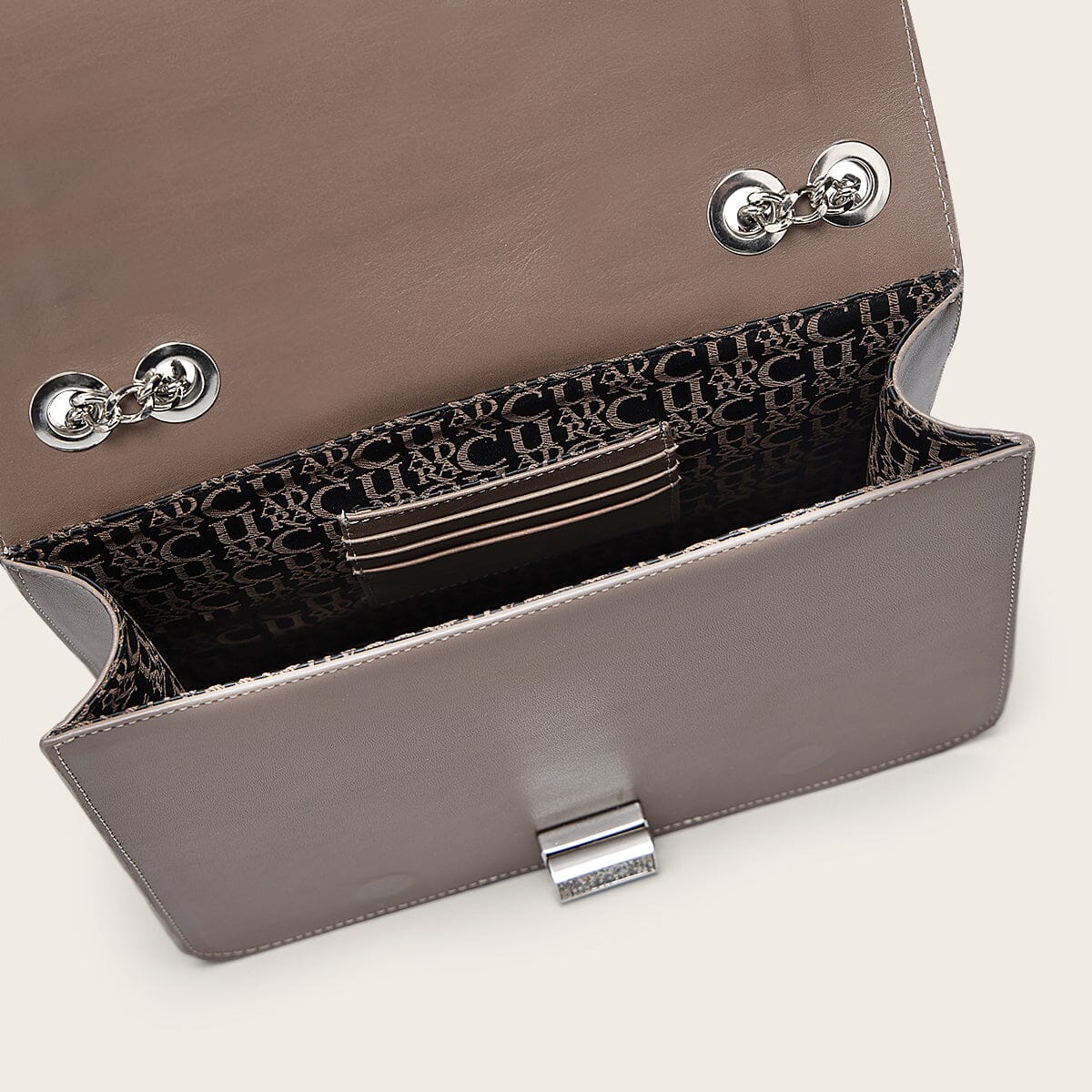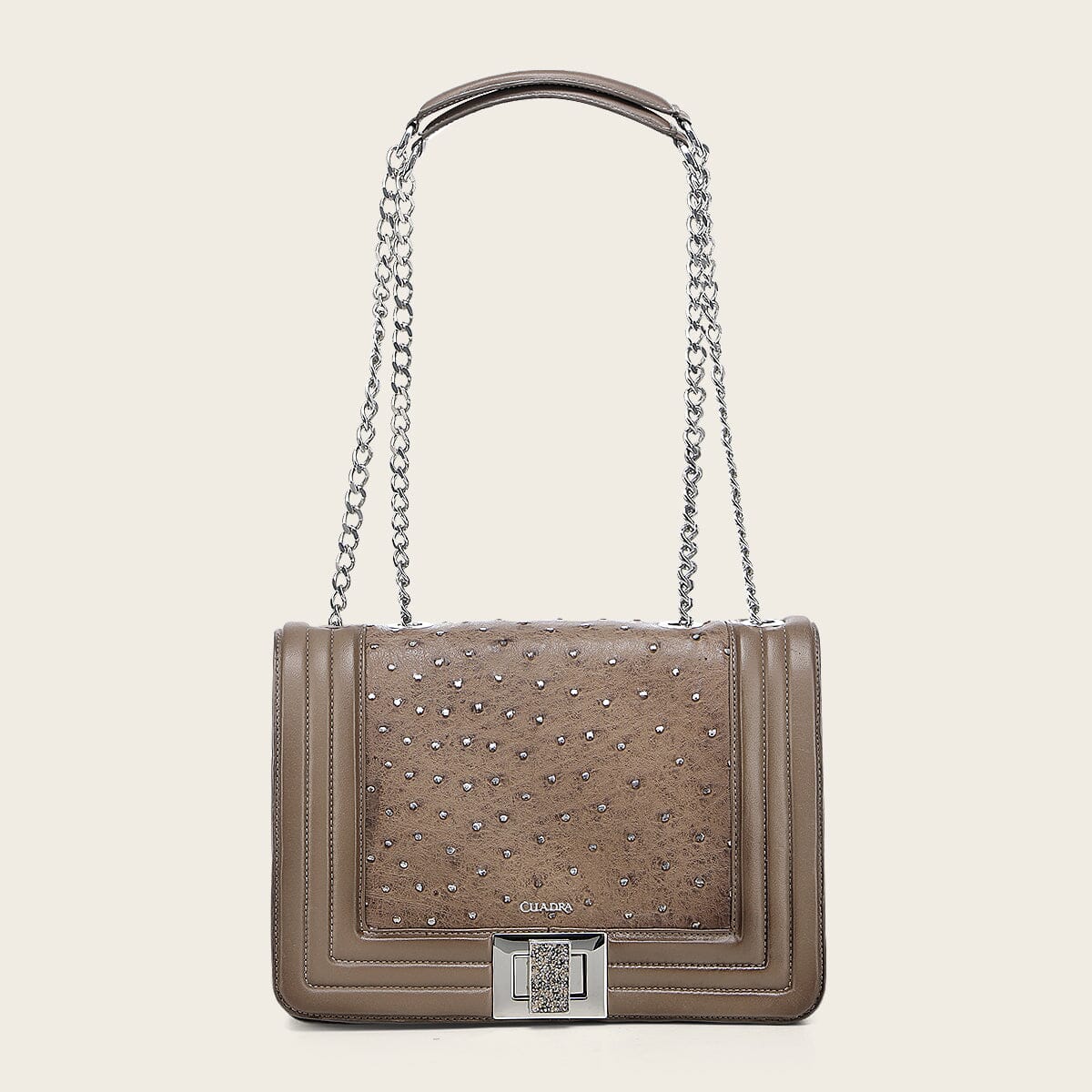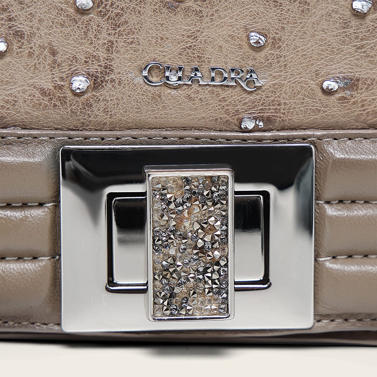 Bolso de hombro en piel genuina de avestruz y piel de bovino para dama. Al frente presenta capitonado, aplicación metálica del logotipo Cuadra, y piel genuina de avestruz. Con asa de cadena doble que puede alargase para usar como crossbody. La parte interna con un compartimento con cuatro tarjeteros y forro con grabado del logotipo. Asegurado con broche con aplicación de cristales.