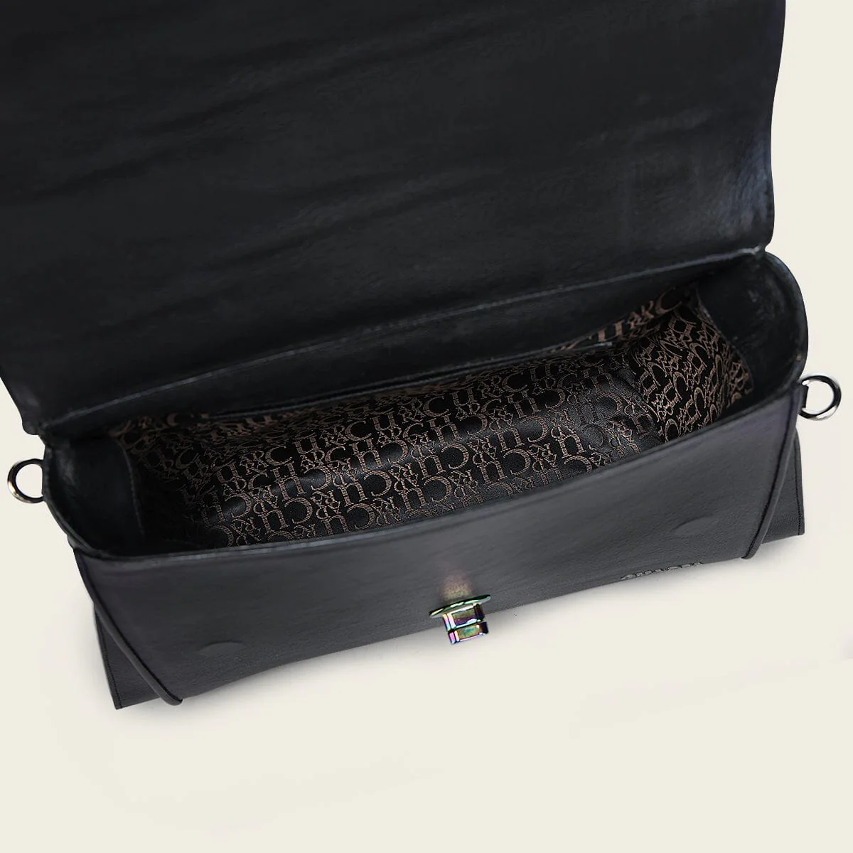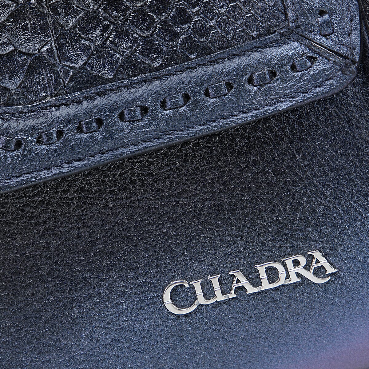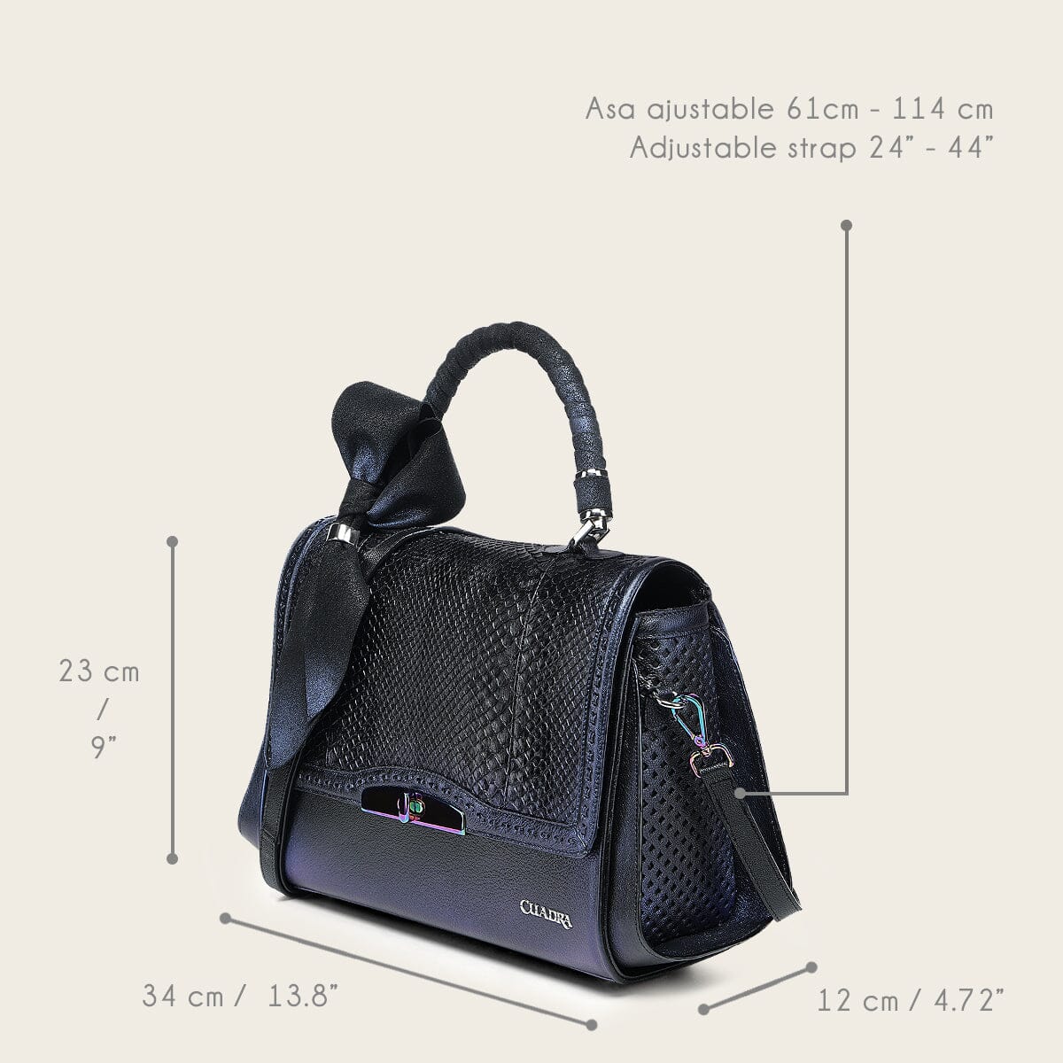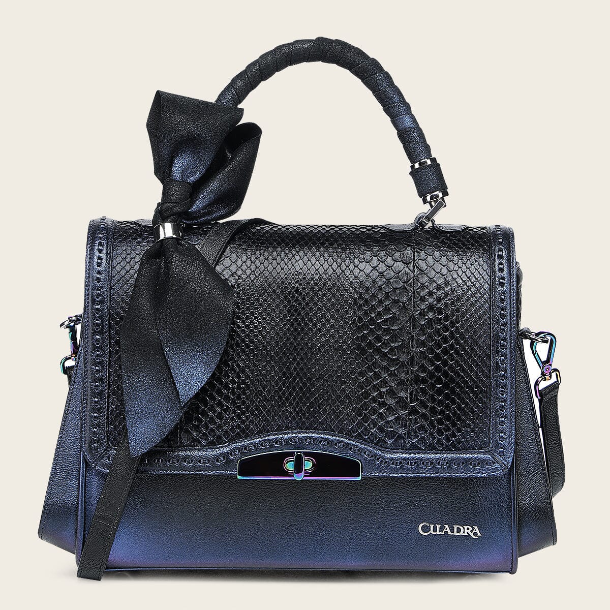 Bolso de mano para dama en piel genuina de pitón y piel de bovino con acabado tornasol. Al frente presenta aplicación metálica del logotipo Cuadra, con piel genuina de pitón enmarcada en un diseño de tejido artesanal. A los costados cuenta con perforaciones en motivos geométricos. Con asa larga ajustable y desmontable y asa corta envuelta con una mascada de piel que finaliza en un moño. Cuenta con un compartimento en la parte trasera asegurado con imán y uno interno. Asegurada con broche metálico e imanes.