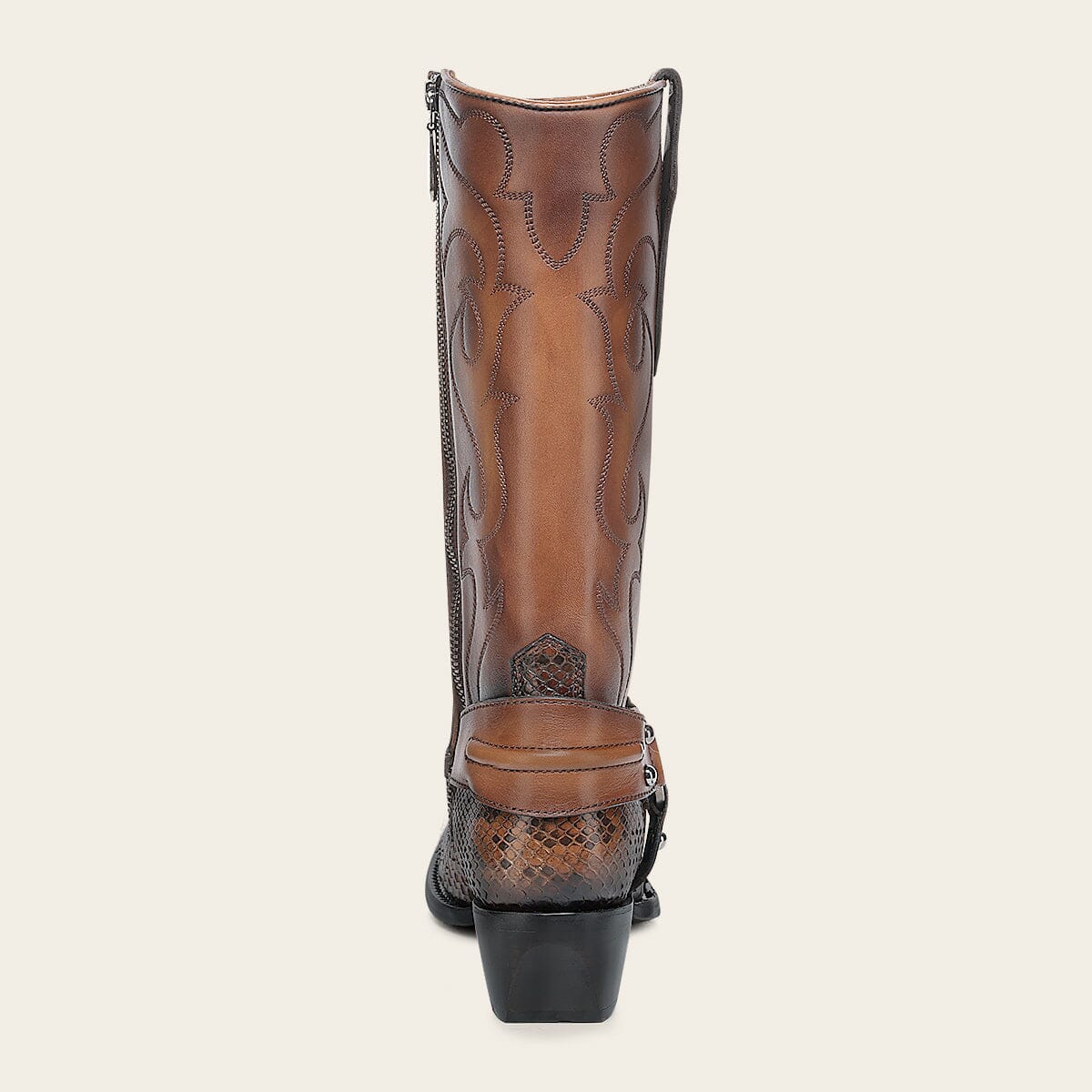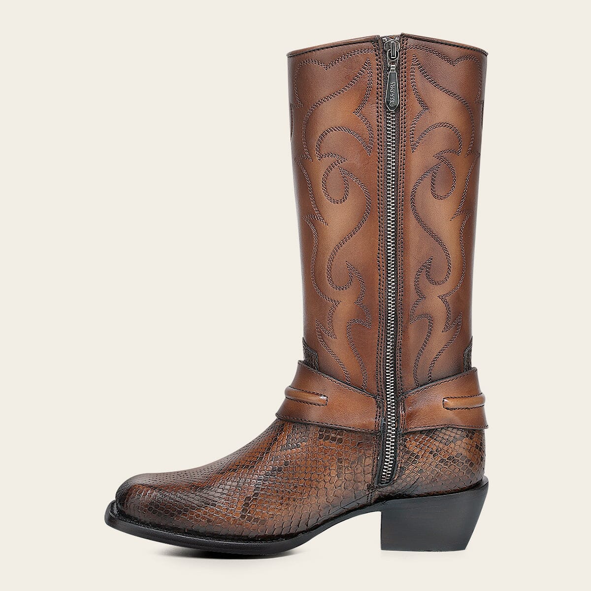 Bota biker para dama en piel genuina de pitón y piel de bovino. Presenta bordado en motivos orgánicos y correa decorativa alrededor del tobillo con aplicaciones metálicas y ajustada con hebilla. Oreja al costado con sutil bordado del logotipo Cuadra en alto relieve. Ajustada con cierre interno. Cuenta con las nuevas tecnologías: tubo con entretelas suaves, planta Ortholite y plantilla flex removible.