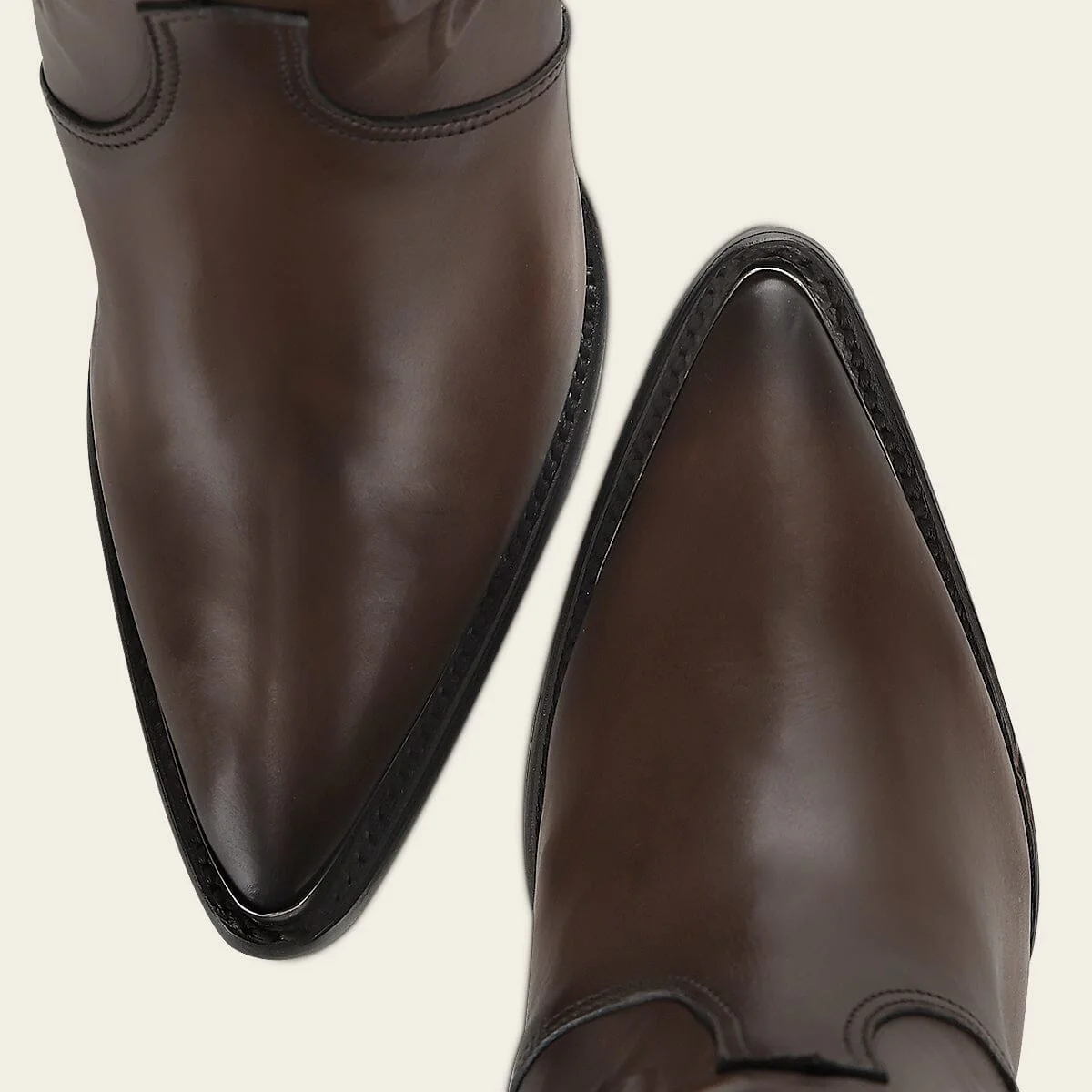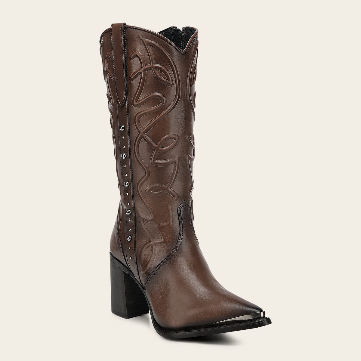 Bota para dama en piel genuina de becerro. Presenta diseño en motivos orgánicos con técnica de alta frecuencia, estoperoles al costado, grabado láser del logotipo Cuadra y punta metálica. Ajustada con cierre interno. Cuenta con las nuevas tecnologías: platilla flex removible, planta Ortholite, que le dan mayor ligereza, confort, transpirabilidad y amortiguación. Con suela de cuero con injerto de TPU.