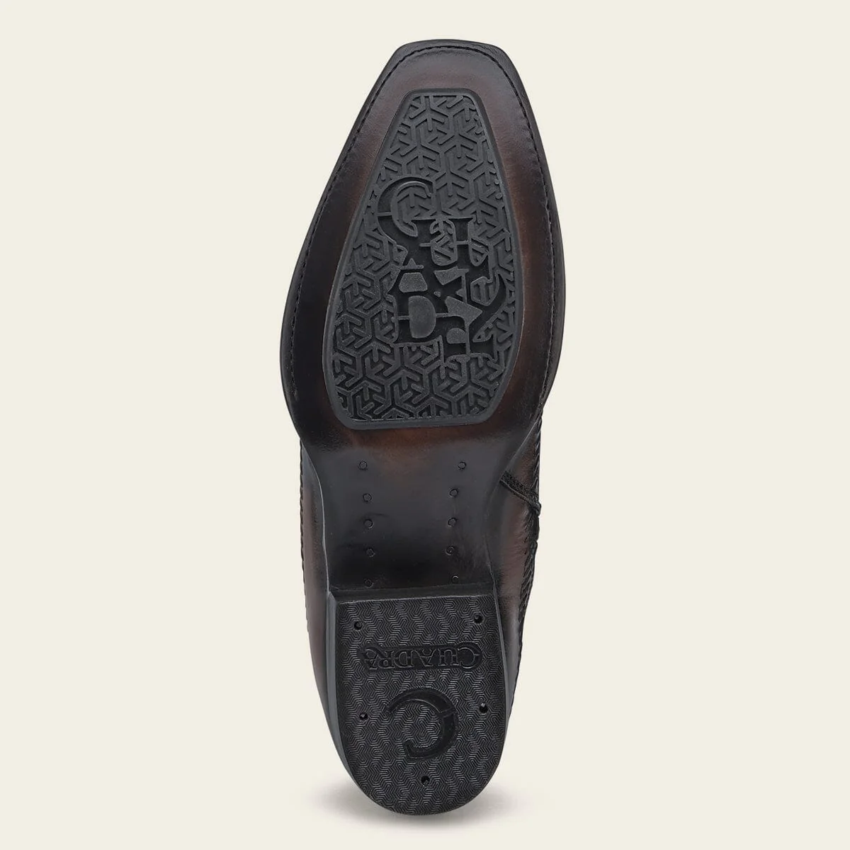 Bota casual para caballero en piel genuina de bovino. Presenta grabado y perforado láser, tejido artesanal y aplicación metálica del monograma Cuadra. Ajustada con cierre interno. Cuenta con las nuevas tecnologías: planta Ortholite, plantilla flex removible y tubo con entretelas suaves. Suela de hule con injerto de TPU antiderrapante.