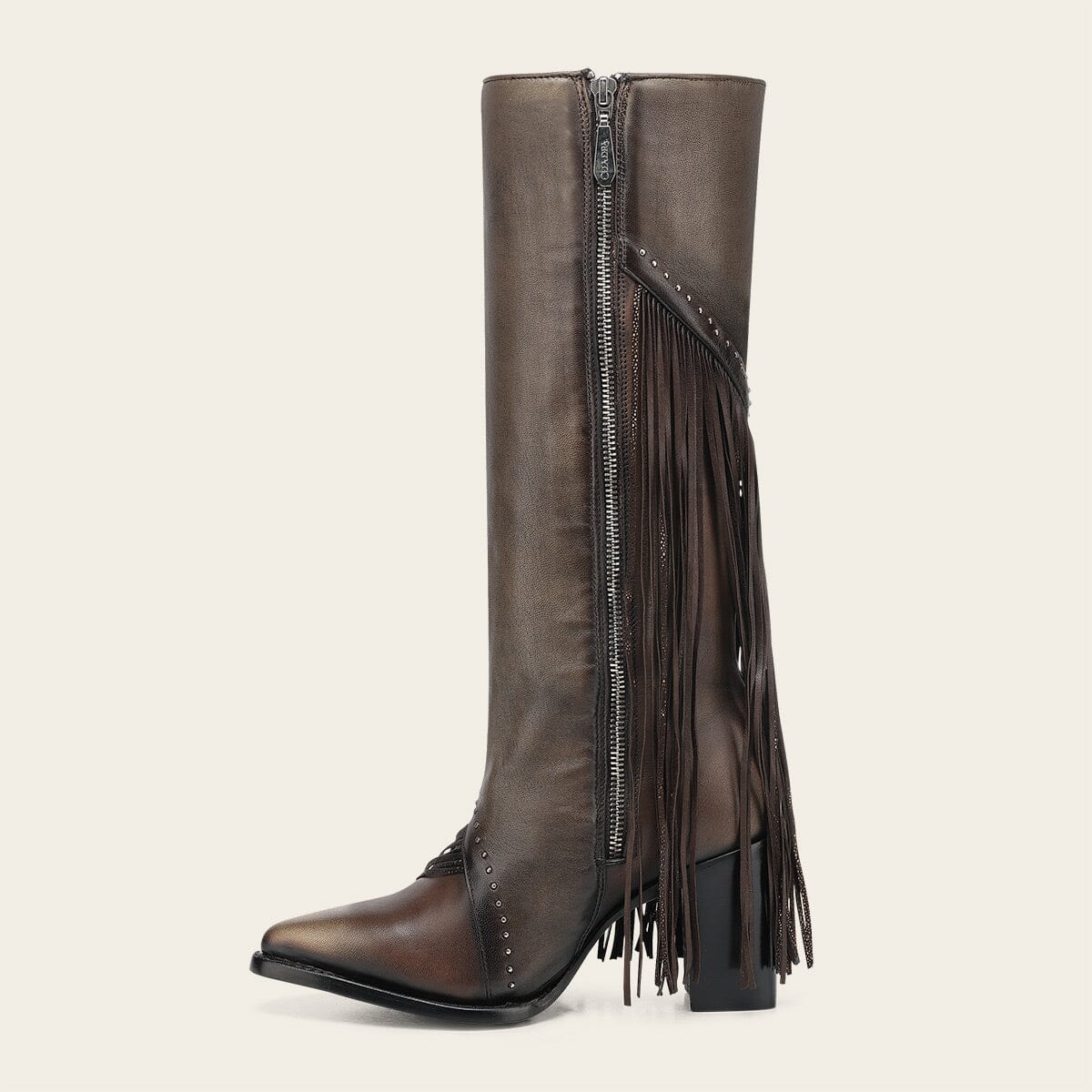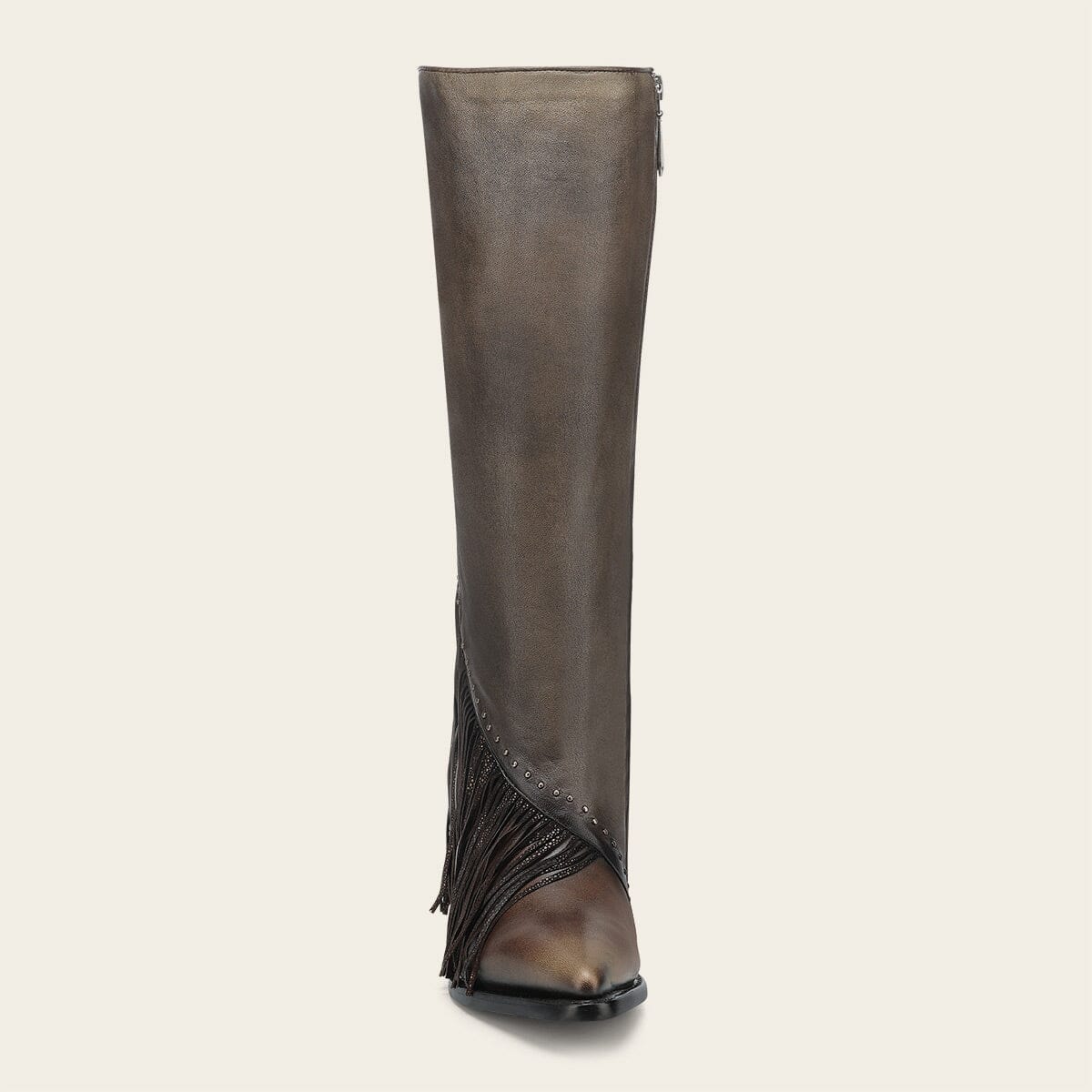 Bota alta para dama en piel genuina de bovino. Presenta aplicación de flecos con sutil estampado, estoperoles y acabado pintado a mano. Ajustada con cierre interno. Cuenta con las nuevas tecnologías: platilla flex removible, planta Ortholite, que le dan mayor ligereza, confort, transpirabilidad y amortiguación y un tubo suave diseñado con entretelas. Con suela de cuero con injerto de TPU.
