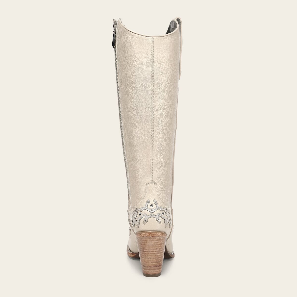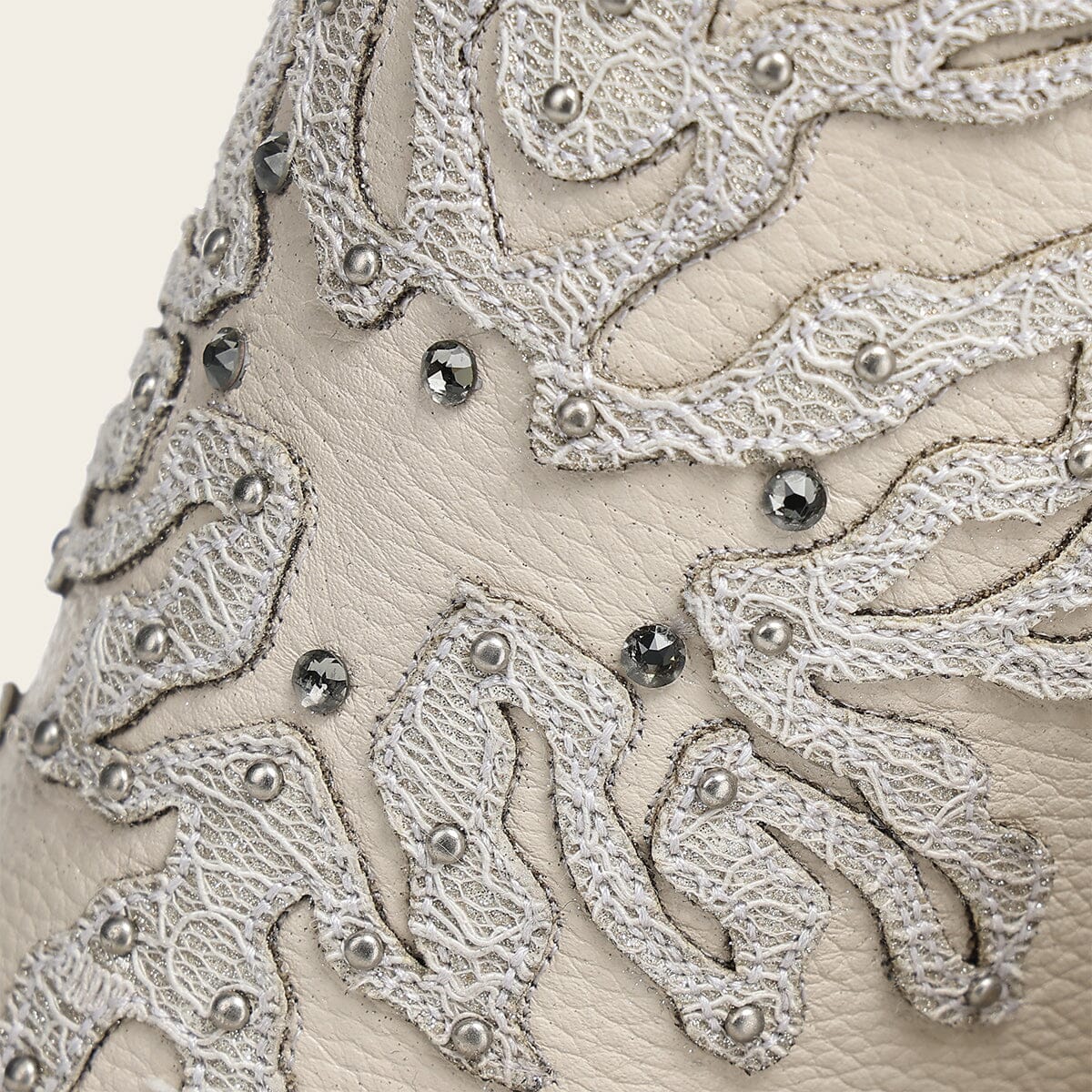Bota para dama en piel genuina de bovino. Presenta aplicaciones de textil en textura contrastante en motivos orgánicos, con aplicaciones metálicas y de cristales auténticos Swarovski® en tubo y sobre la oreja en un costado. Ajustada con cierre interno. Cuenta con las nuevas tecnologías: platilla flex removible, planta Ortholite, que le dan mayor ligereza, confort, transpirabilidad y amortiguación y un tubo suave diseñado con entretelas. Con suela de cuero con injerto de TPU.