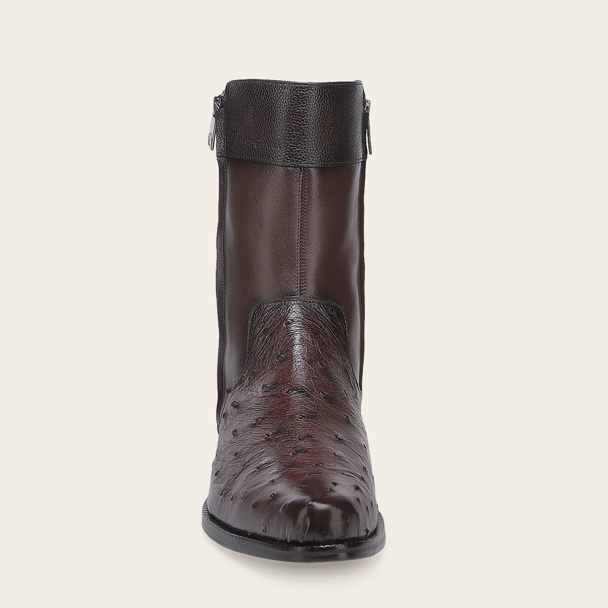 Bota de vestir para caballero en piel genuina de avestruz y piel de bovino. Presenta grabado del logotipo Franco Cuadra y sombreado a mano. Ajustado con doble cierre a los costados. Con suela de cuero con injerto de TPU.