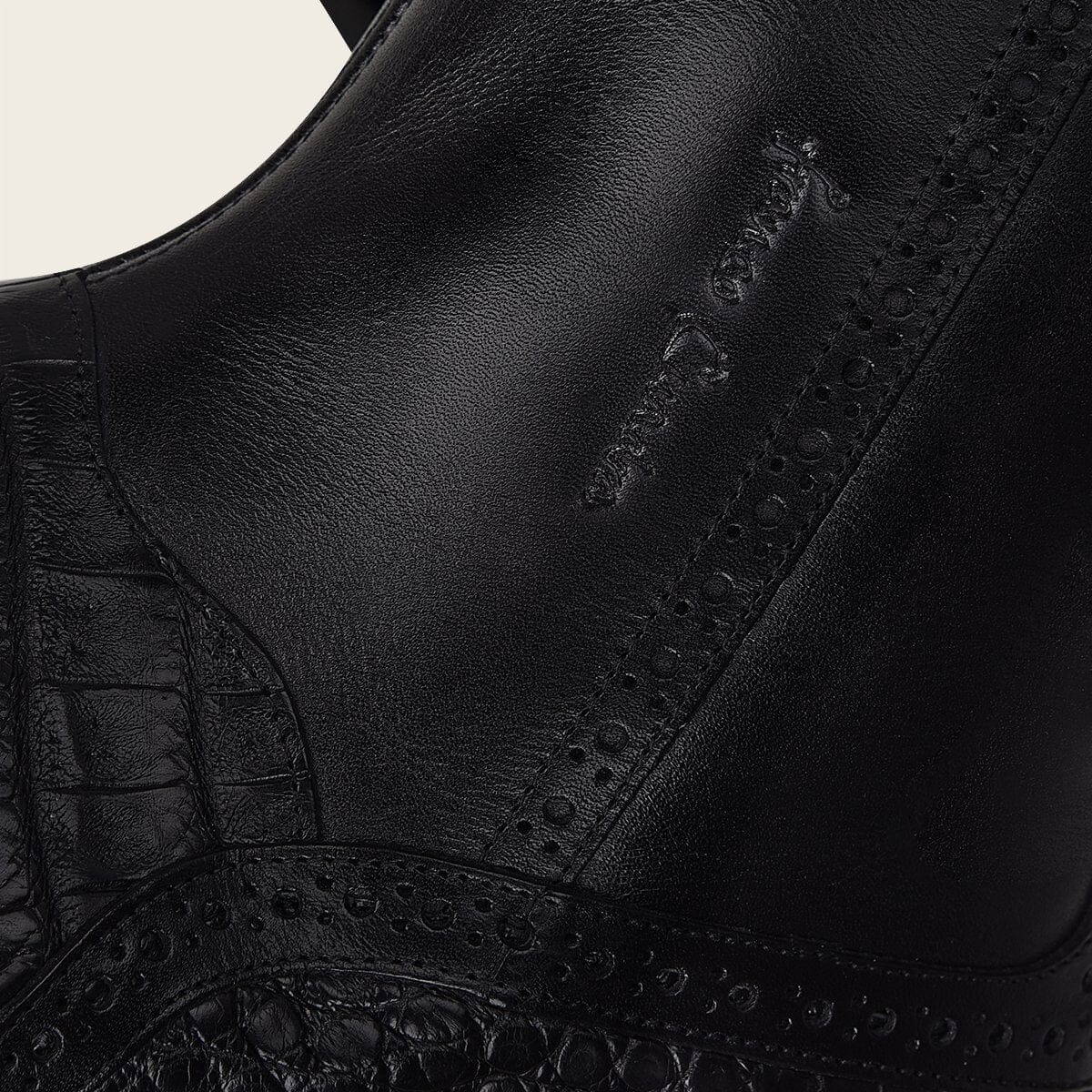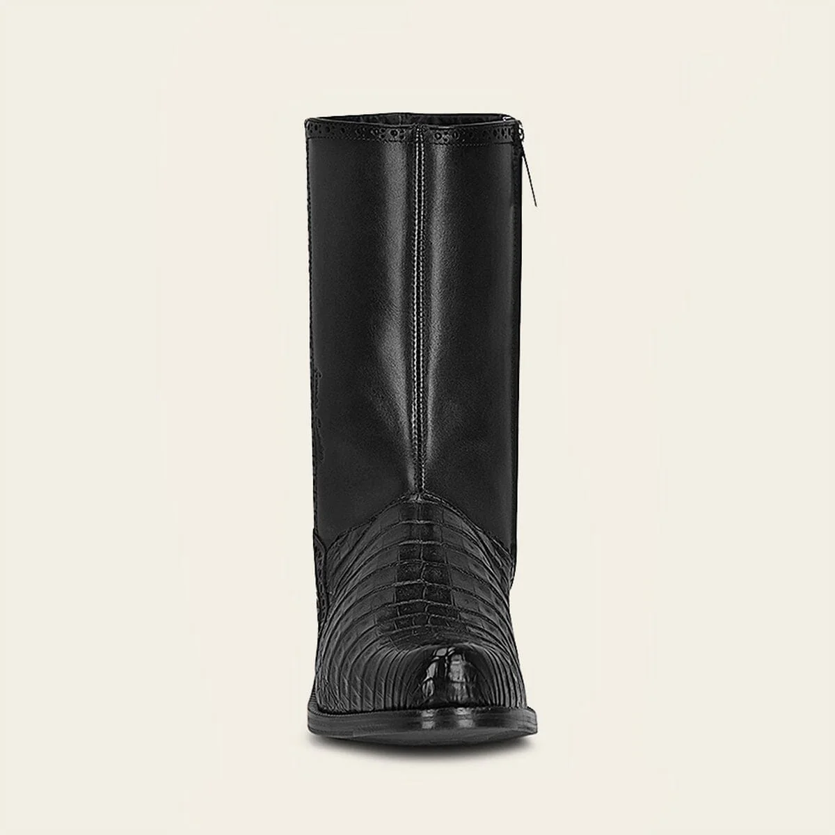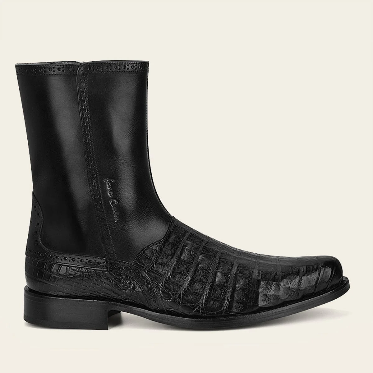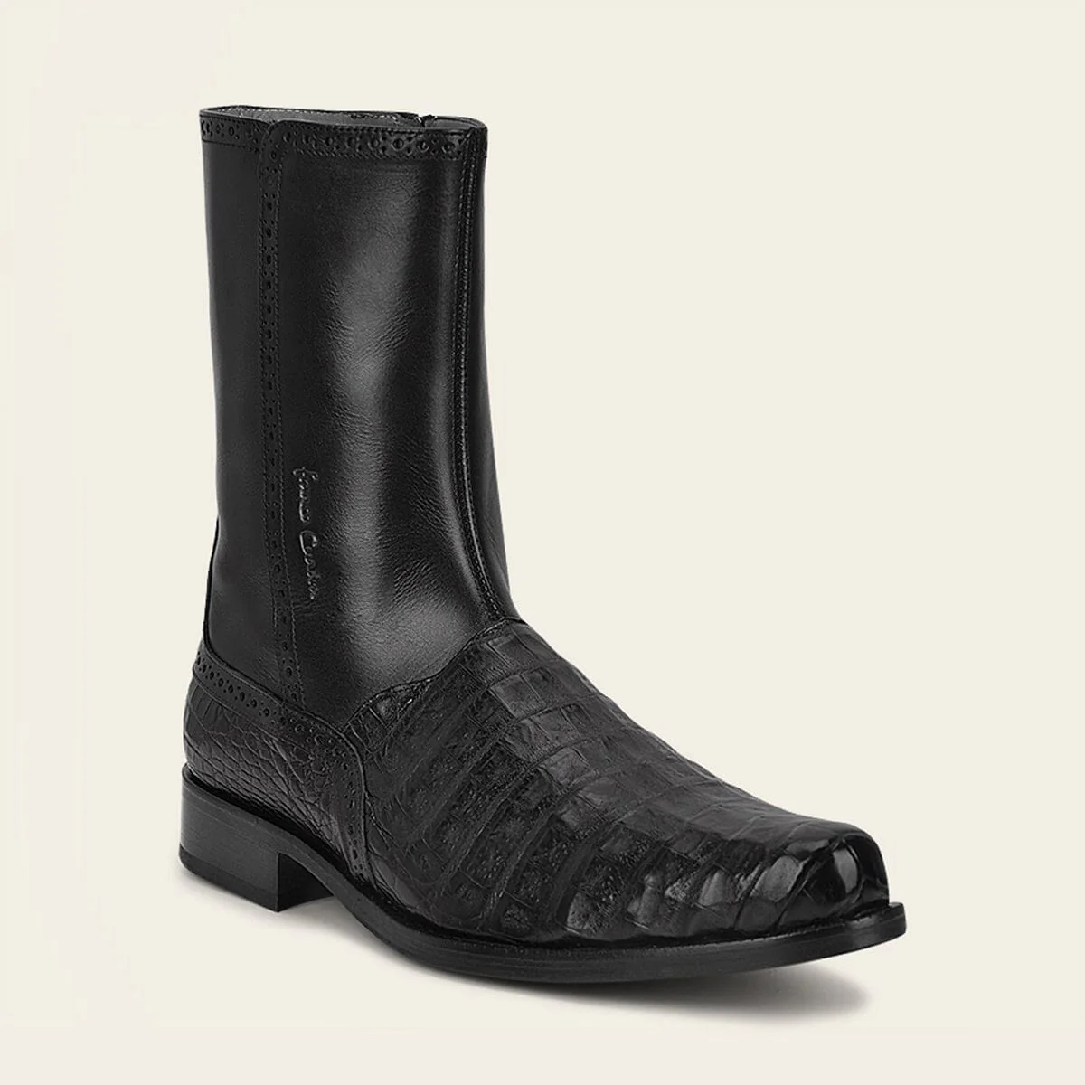 Bota para caballero en piel genuina de caimán y piel de bovino. Presenta sutiles detalles de brocado y grabado de logotipo Franco Cuadra. Ajustada con cierre interno. Con suela de cuero con injerto de TPU. Color negro.