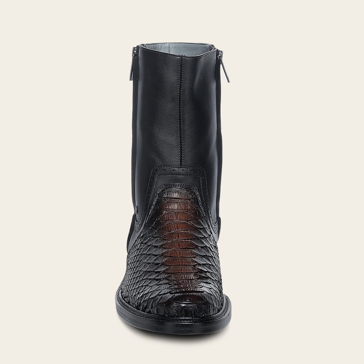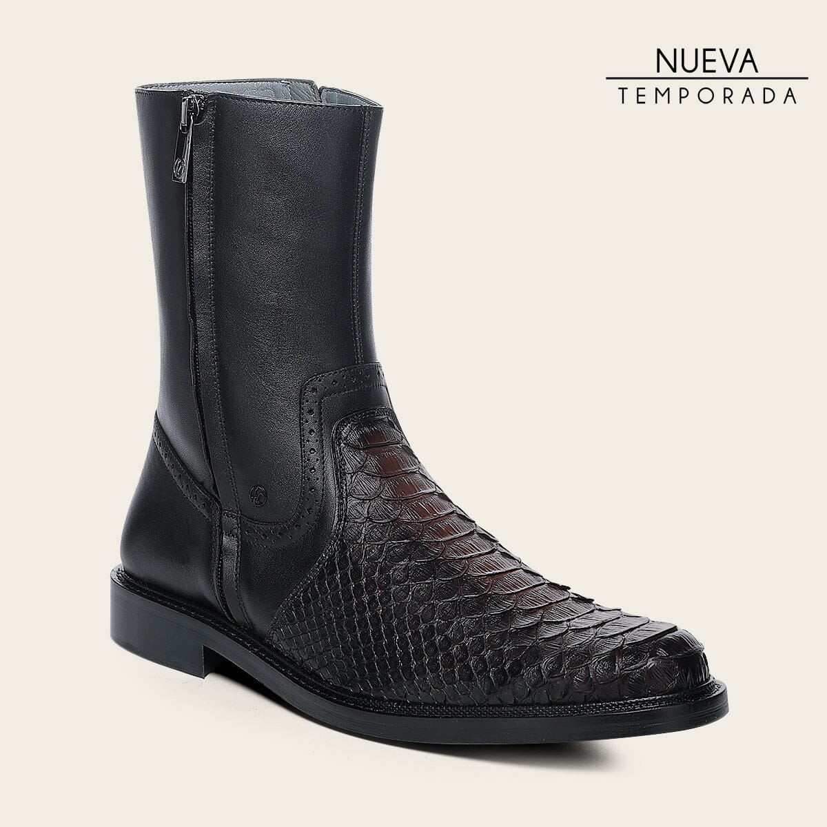 Bota de vestir para caballero en piel genuina de pitón y piel de bovino. Presenta brocado y aplicación metálica del monograma Franco Cuadra. Ajustada con doble cierre en los costados. Con suela de cuero con injerto de TPU.