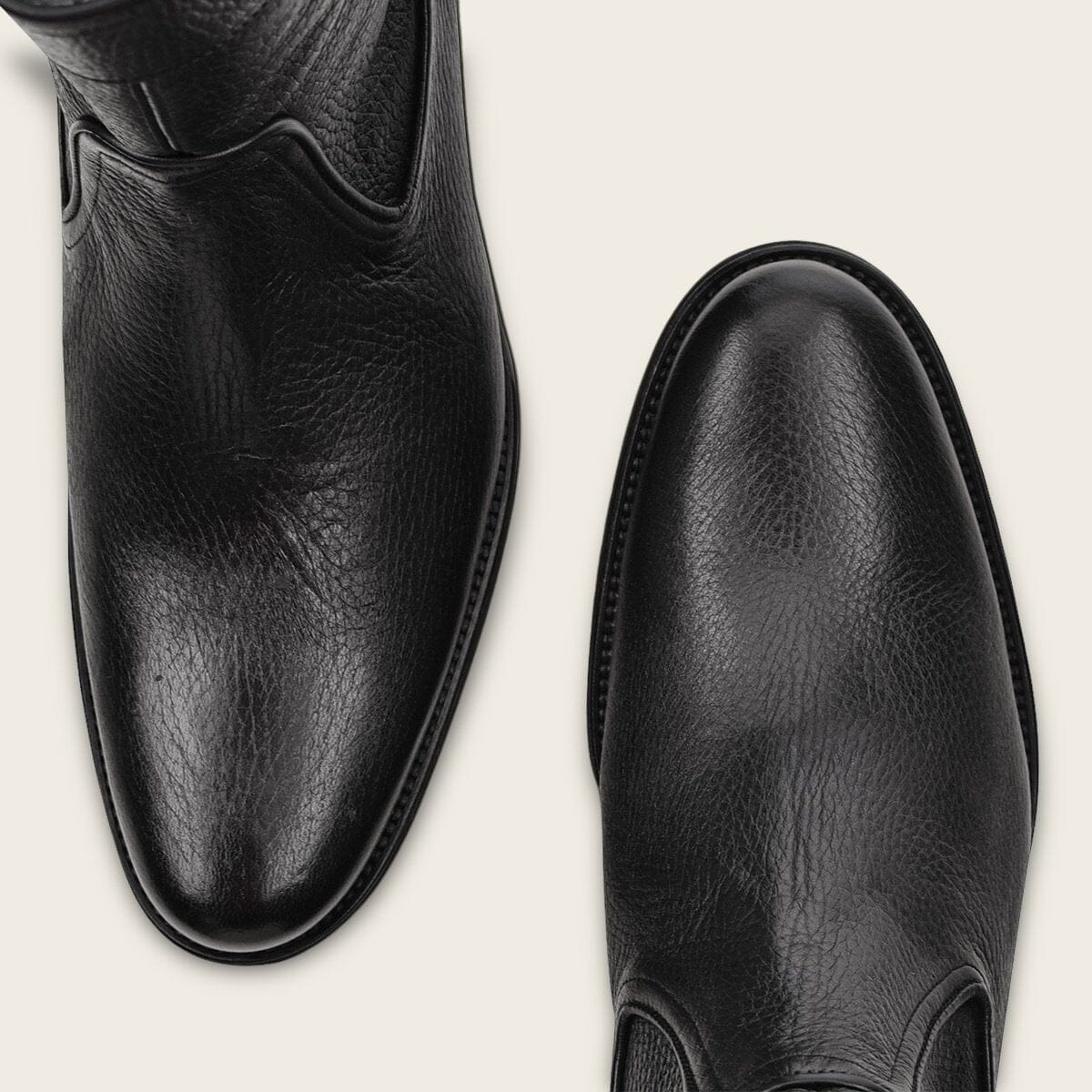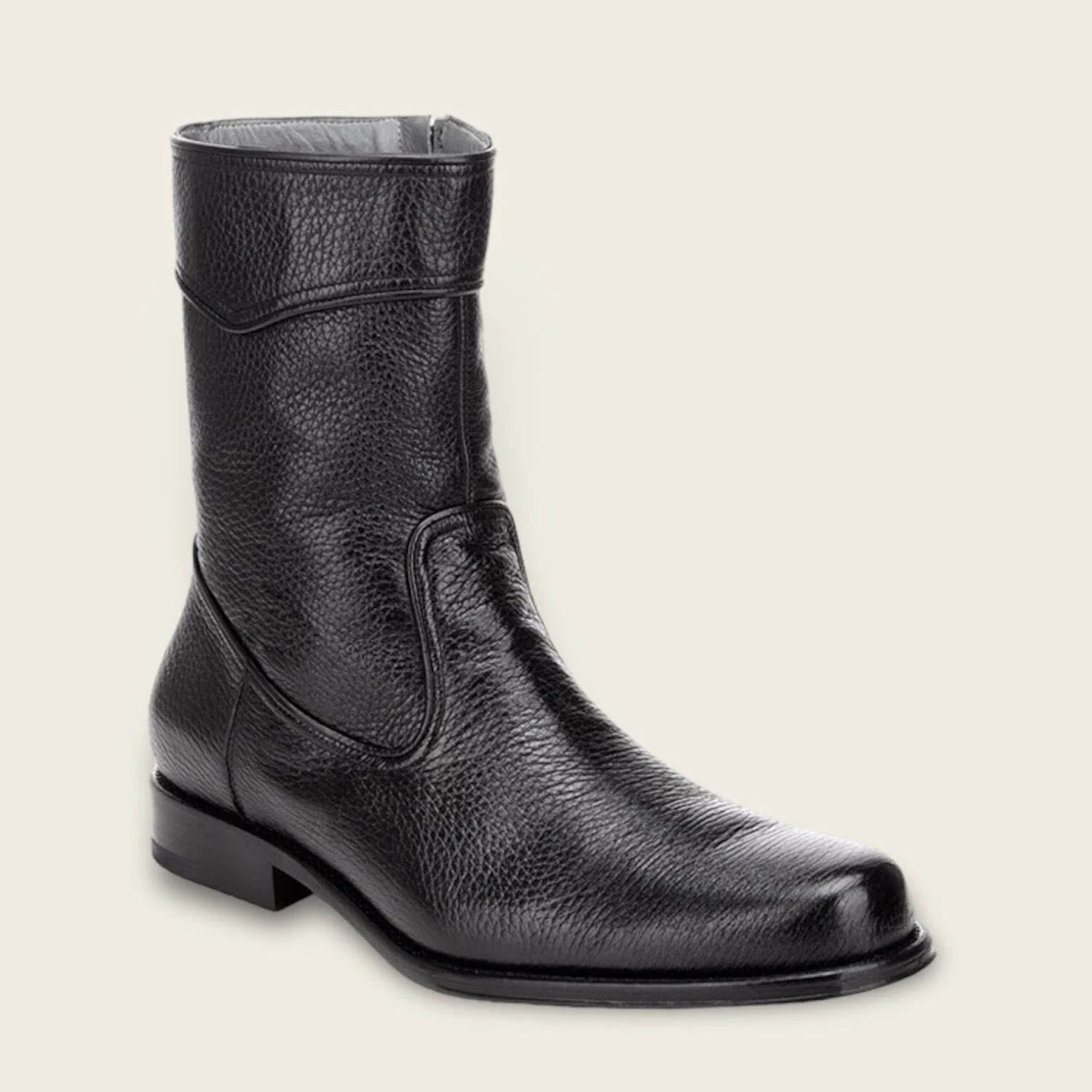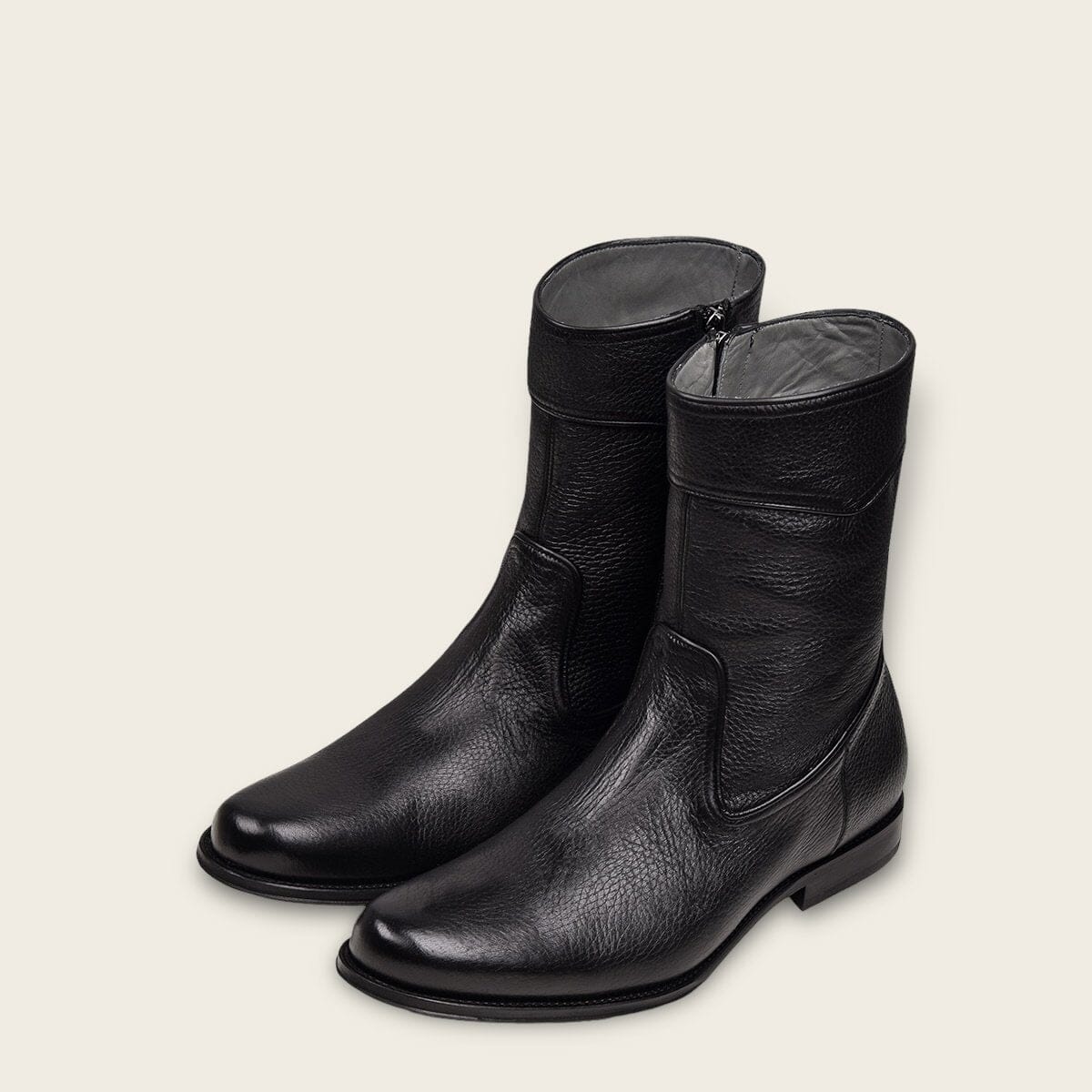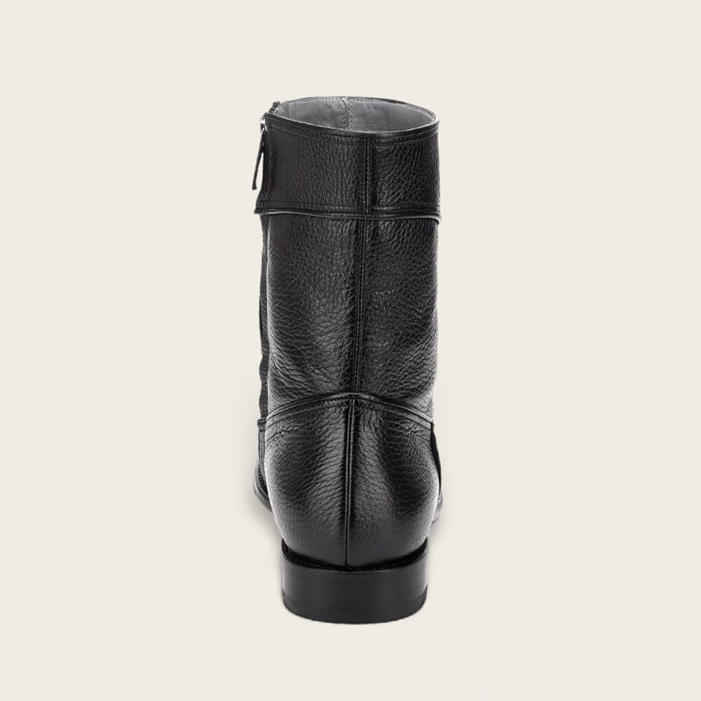 Botín de vestir para caballero en piel genuina de venado. Presenta sutil grabado de monograma Franco cuadra al costado. Ajuste mediante cierre interno. Suela de cuero con injerto de TPU. Color negro.