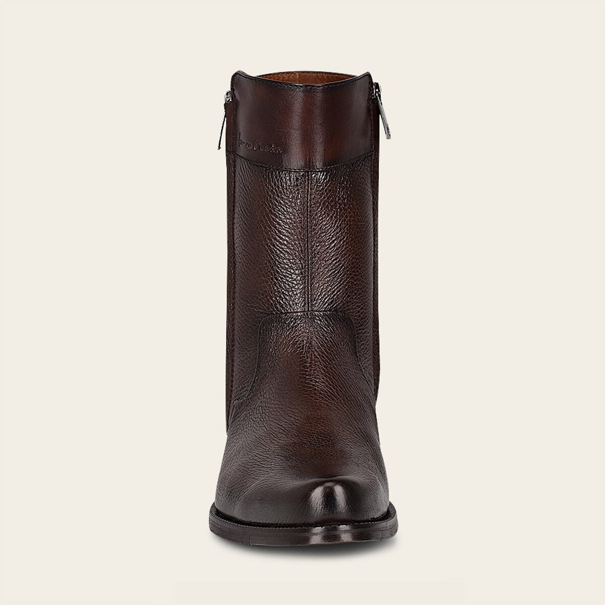 Bota para caballero en piel genuina de venado y piel de bovino. Presenta una pequeña aplicación metálica de monograma Franco Cuadra. Con doble cierre en los costados y suela de cuero con injerto de TPU.