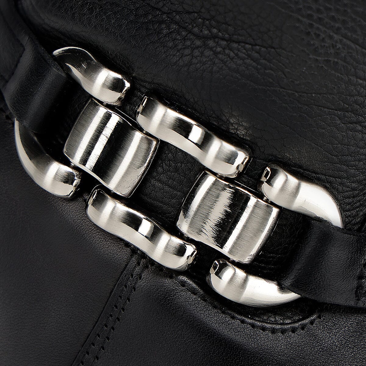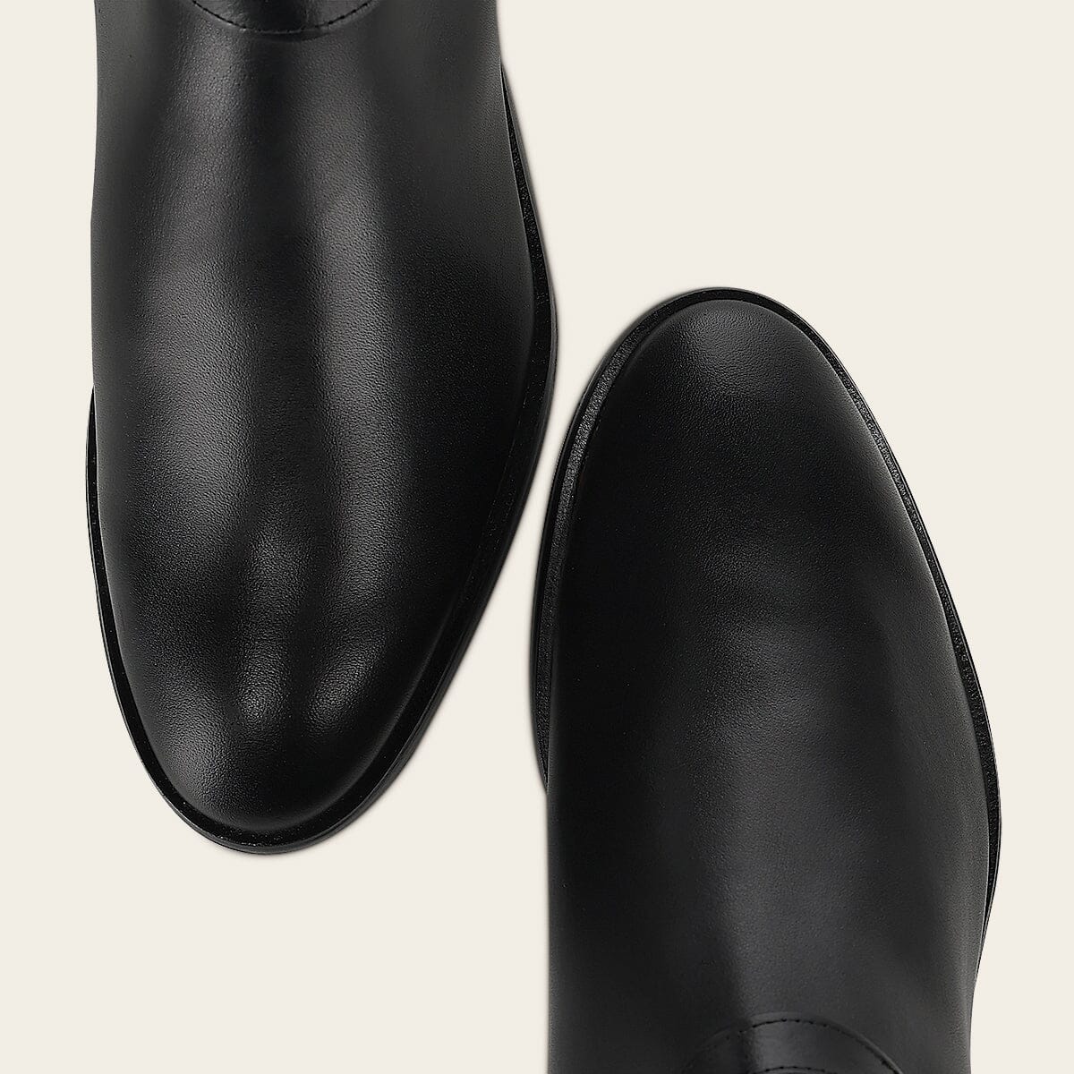 Bota alta estilo ecuestre para dama en piel genuina de bovino. Tubo con textura suave. Presenta correa decorativa alrededor del tobillo con hebilla dorada. Ajustada con cierre interno. Suela de cuero de doble densidad con injerto de TPU.