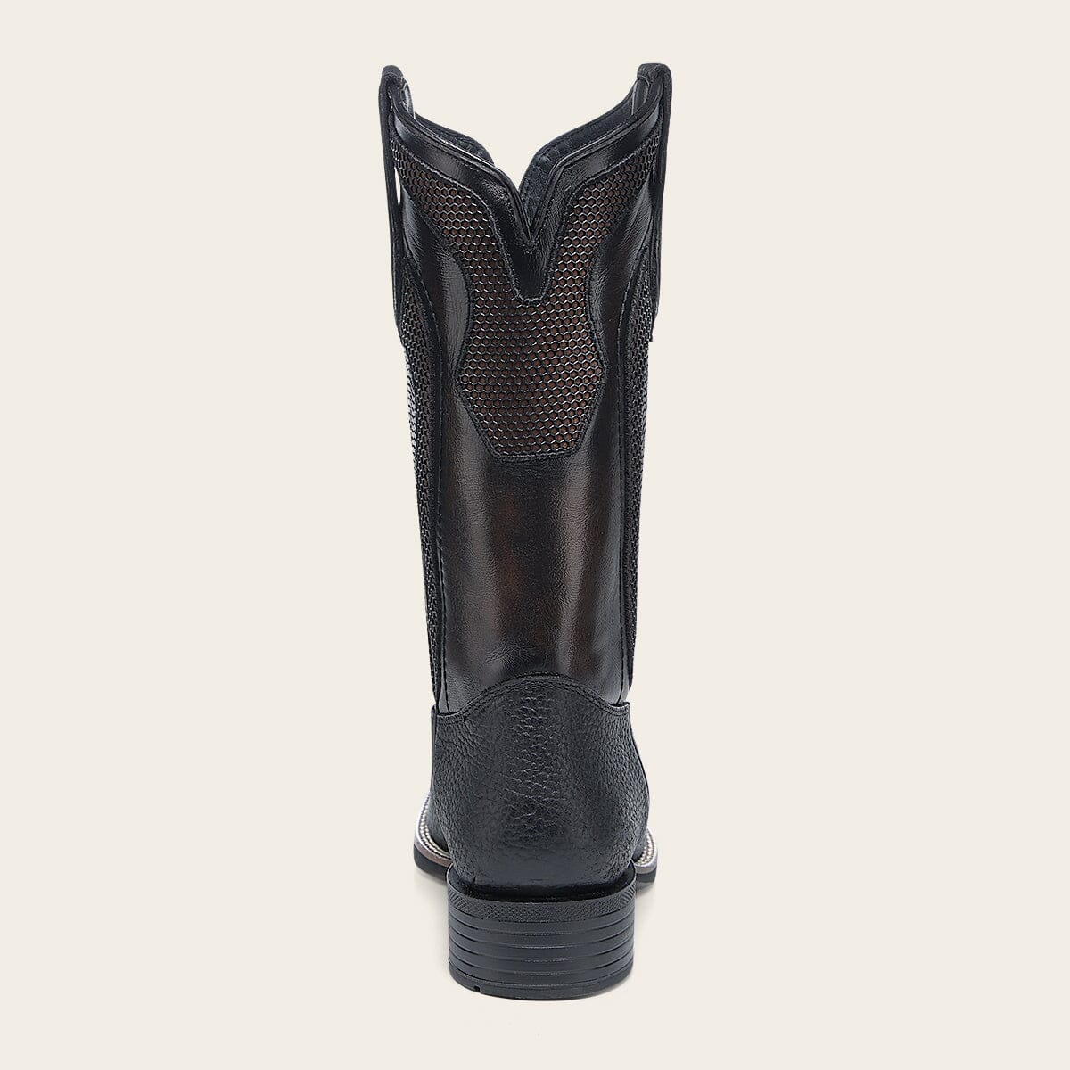 Bota rodeo en piel genuina de bisonte y piel de bovino para caballero. Presenta aplicaciones de KPU en motivos geométricos, tejido a modo artesanal en alto relieve, aplicación metálica doble del monograma Cuadra, aplicación del logotipo de la marca en alto relieve en orejas. Cuenta con las nuevas tecnologías: platilla flexrider, planta Ortholite y suela flexrider, que le dan mayor ligereza, confort, transpirabilidad y amortiguación. Tubo suave diseñado con entretelas.