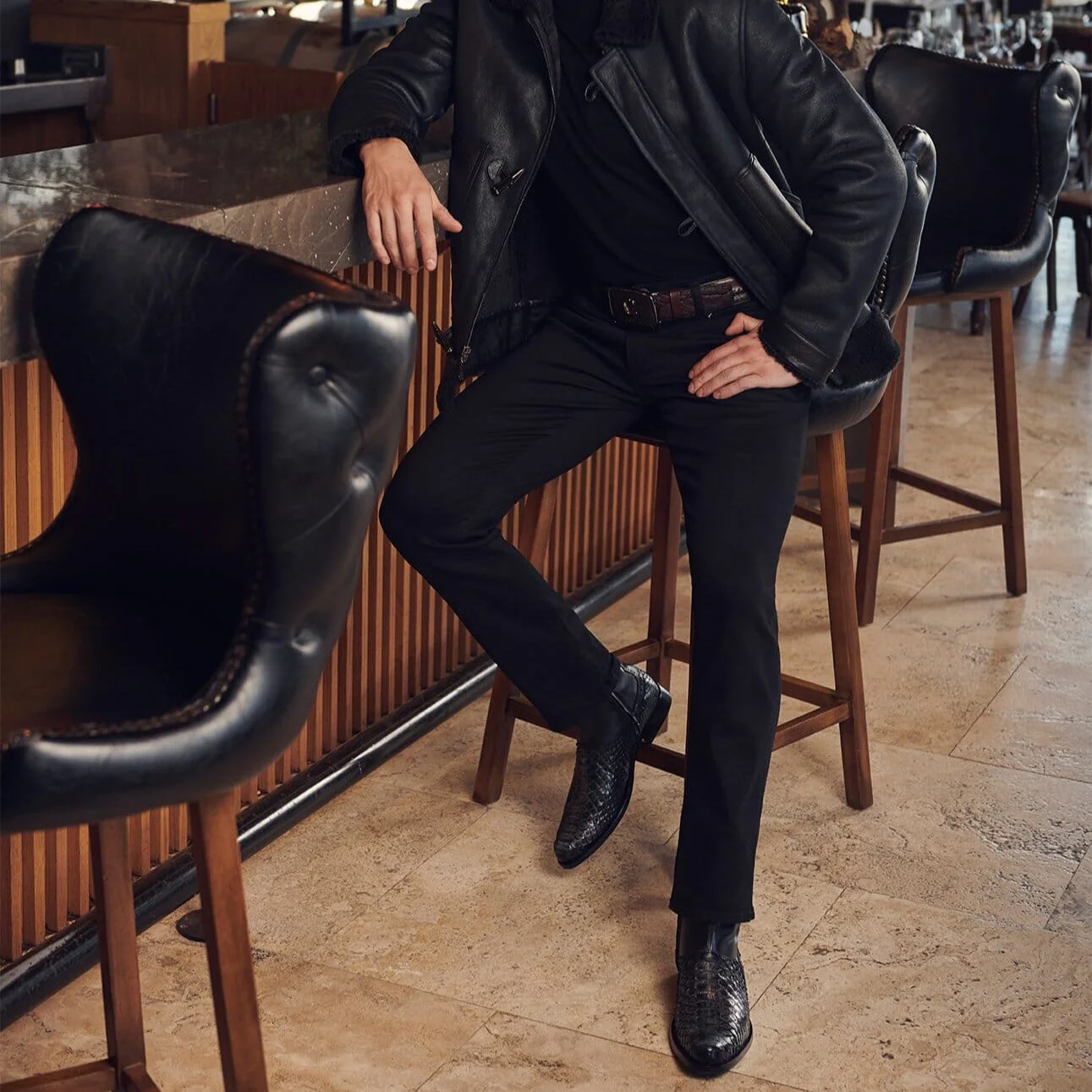 Botín para caballero en piel genuina de pitón y piel de bovino. Presenta detalles de perforaciones en piel a modo decorativo al costado y parte superior del tubo. Ajuste por medio de cierre interno. Suela de cuero con TPU. Color gris.