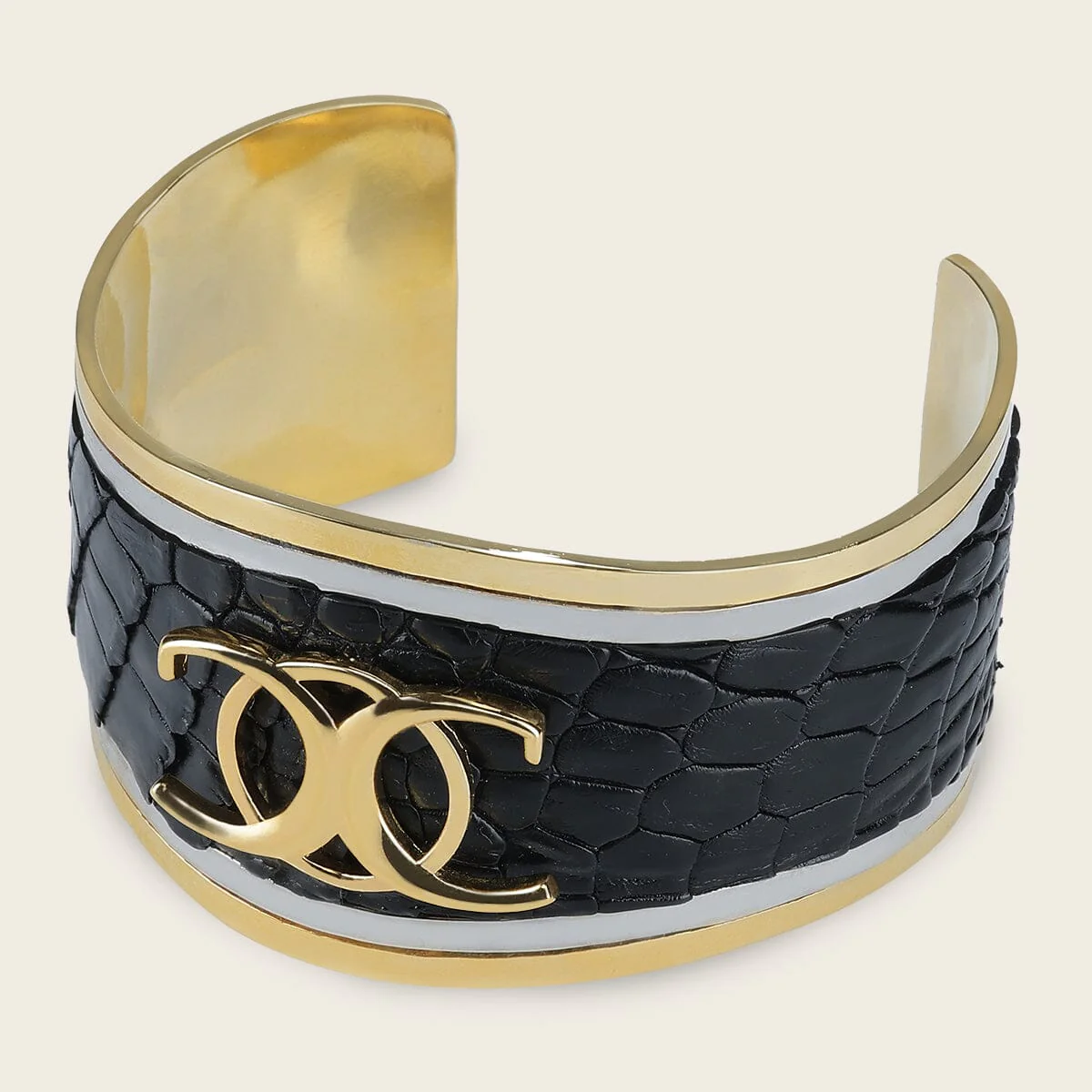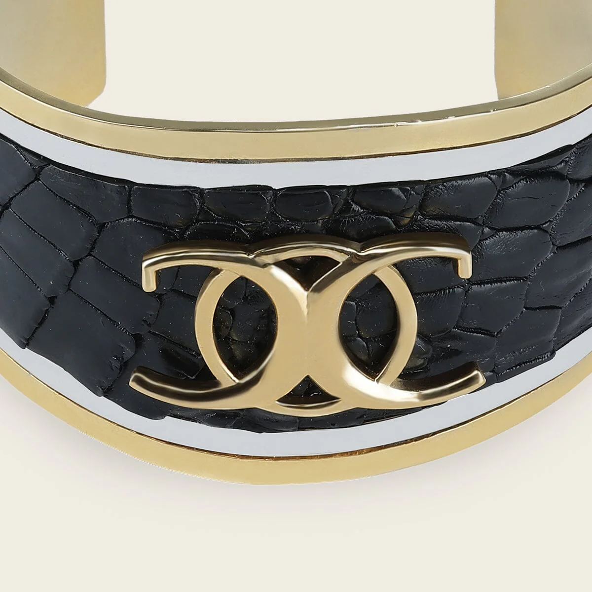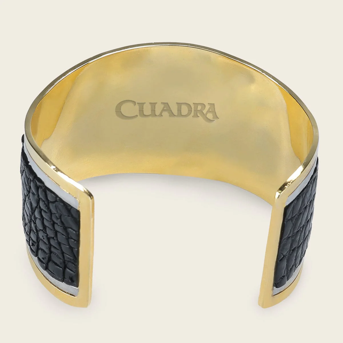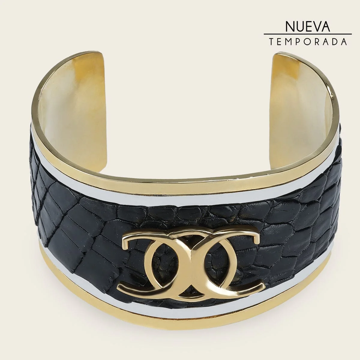 Brazalete ajustable para dama en latón con baño de oro y baño de plata con aplicación en piel genuina de cocodrilo. Al centro componente Cuadra en acabado oro. Altura aproximada: 3.6 cm.