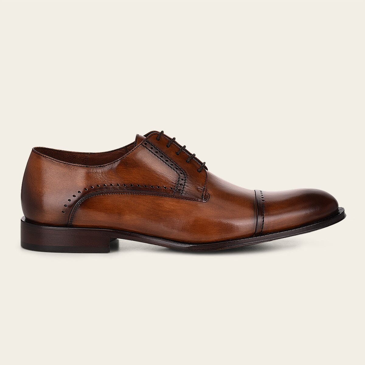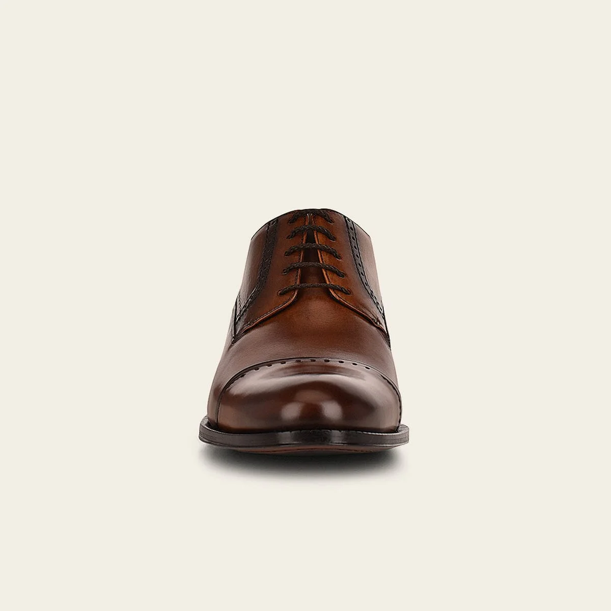 Calzado oxford para caballero en piel de bovino. Diseño minimalista con sutiles detalles de brocado al frente y en los costados. Ajustado con agujetas.