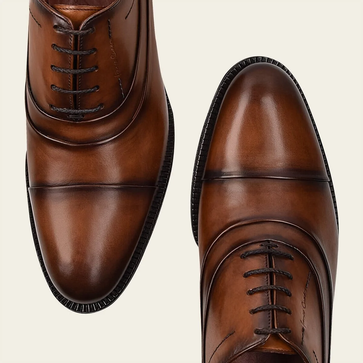 Calzado oxford para caballero en piel genuina de bovino. Cuenta con sombreado que da un contraste de color. Ajuste por medio de agujetas. Suela de hule.