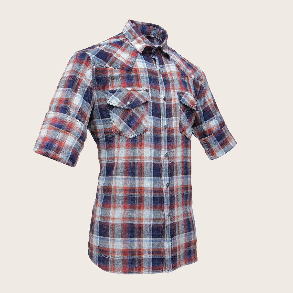 Camisa Cuadra para caballero. Presenta estampado de cuadros en contraste de color y dos bolsillos en pecho asegurados con broche. Ajuste con broches al frente y en mangas.