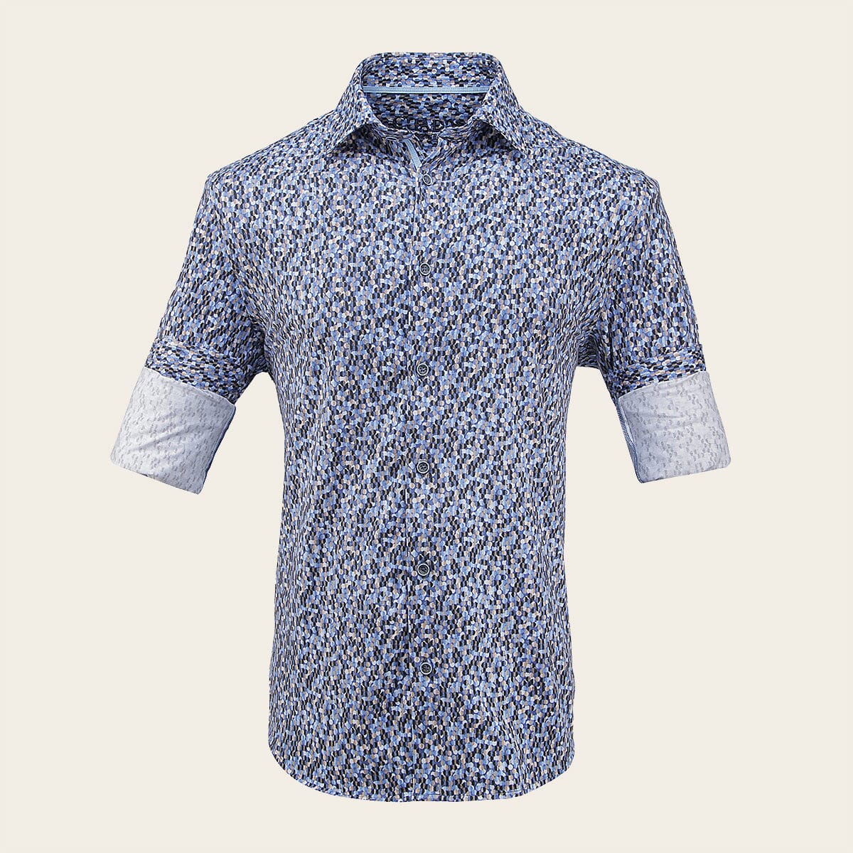 Camisa Cuadra para caballero. Presenta estampado en motivos geométricos y colores contrastantes. Ajustada por medio de botones en mangas y al frente.