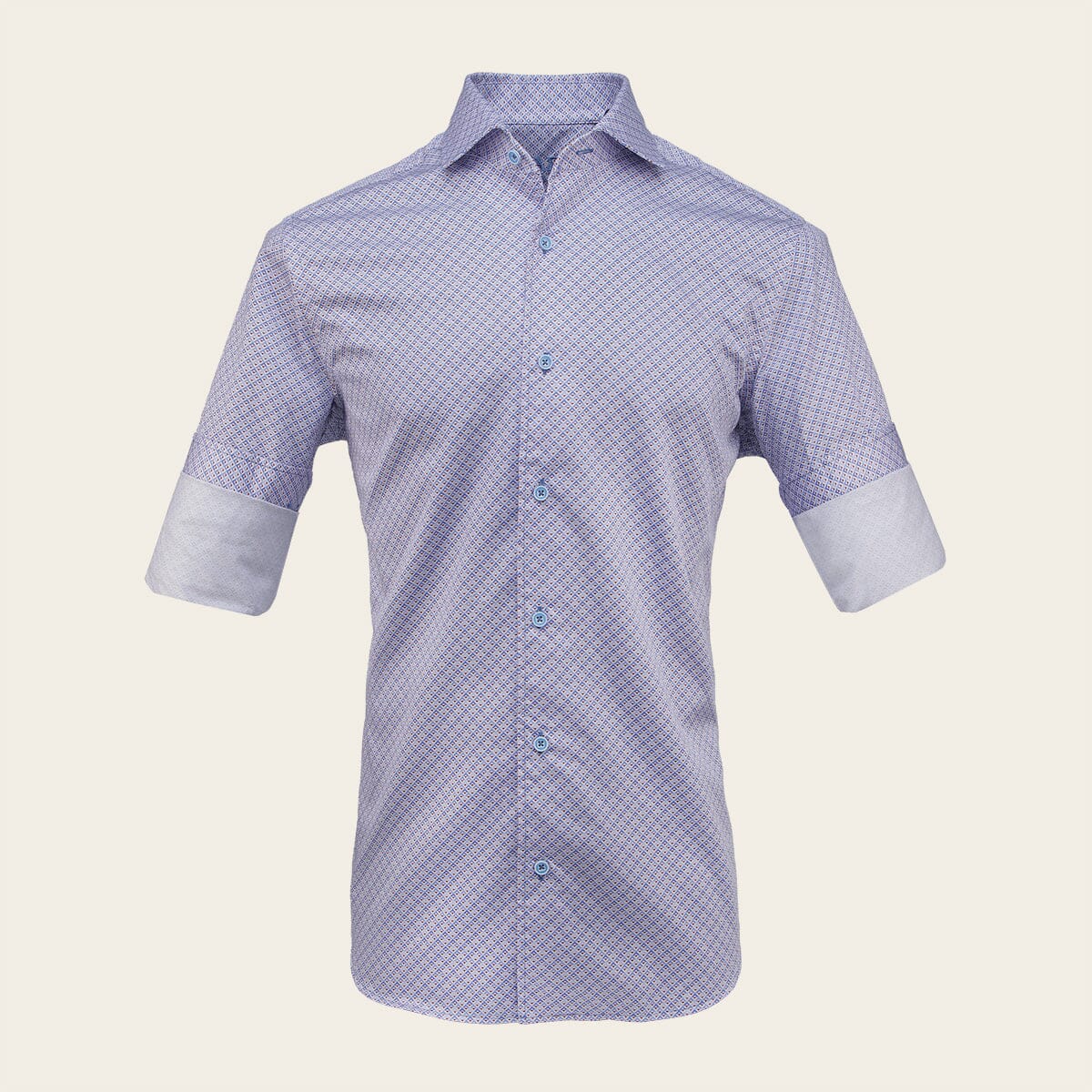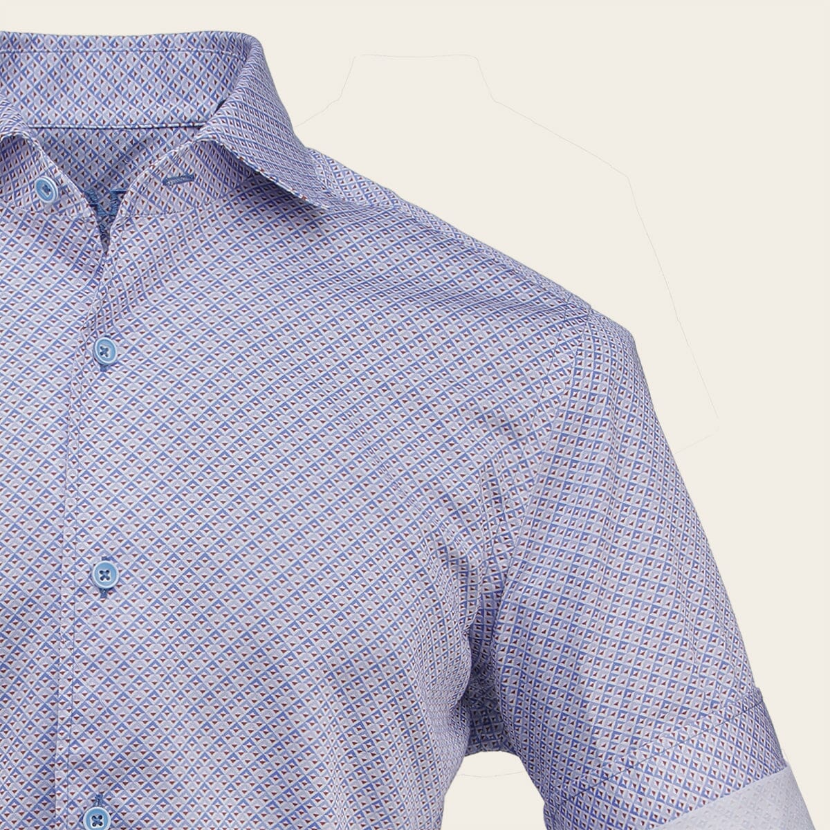 Camisa Cuadra para caballero. Presenta textura geométrica en color azul. Con logotipo Cuadra bordado en la parte interna.