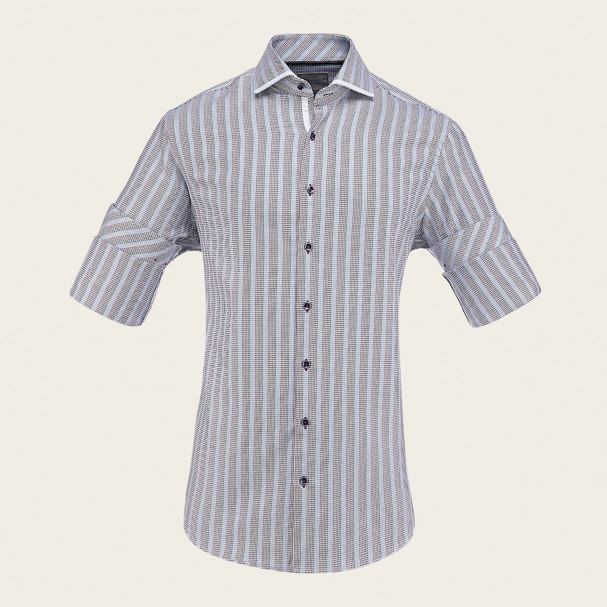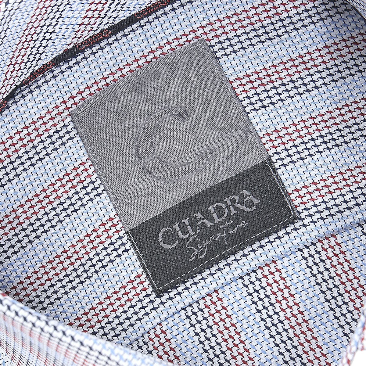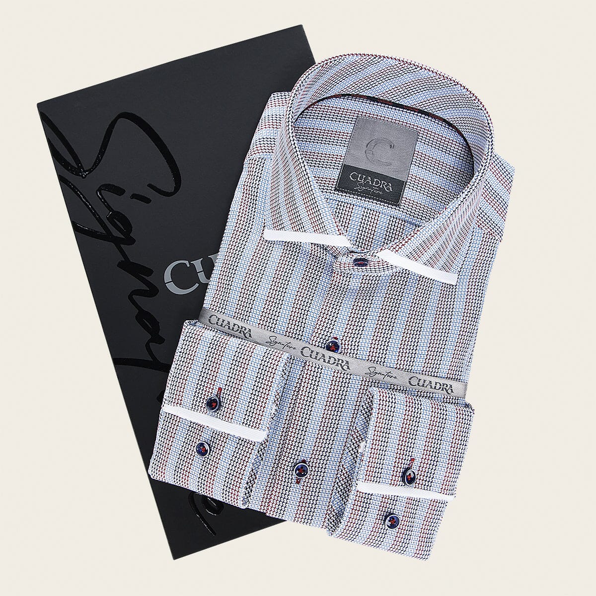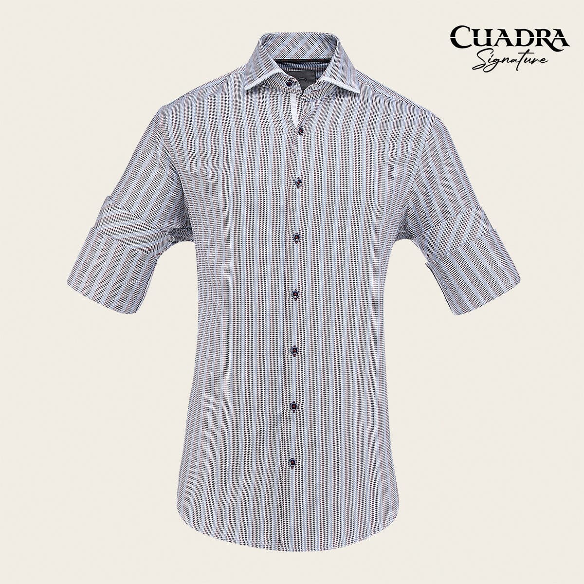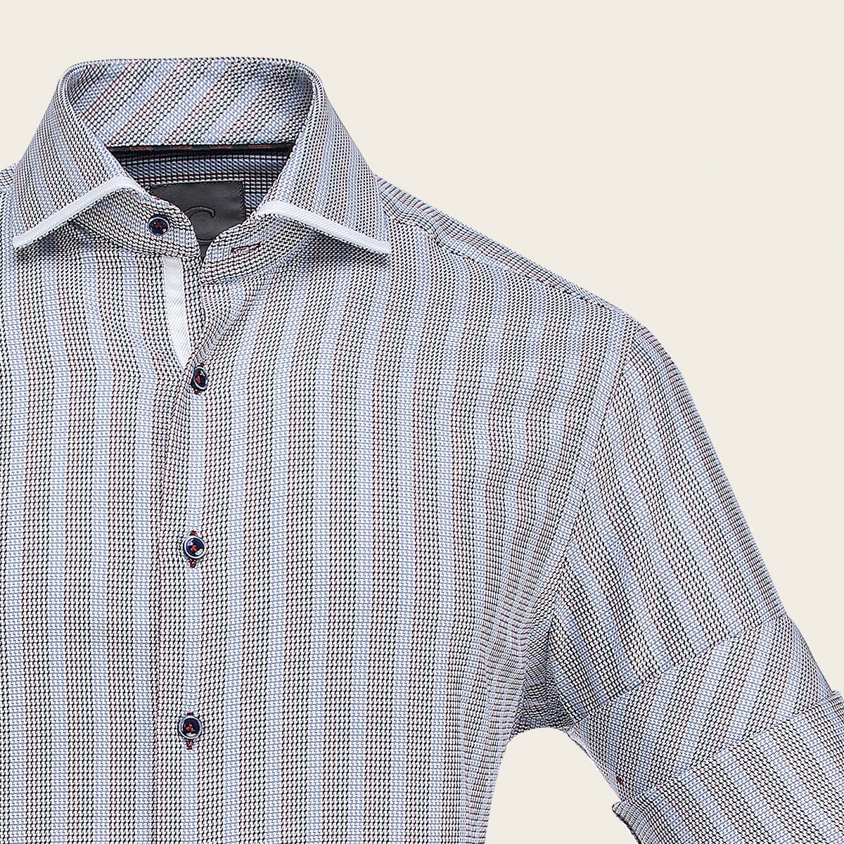 Camisa Cuadra Signature para caballero. Presenta tejido de fibras naturales y algodón egipcio, con estampado en contraste de color y parche interno con el monograma de la marca. Ajustada con botones frontales y en mangas. Cuenta con tirantes removibles debajo del cuello que evitan marcas durante la limpieza y planchado.