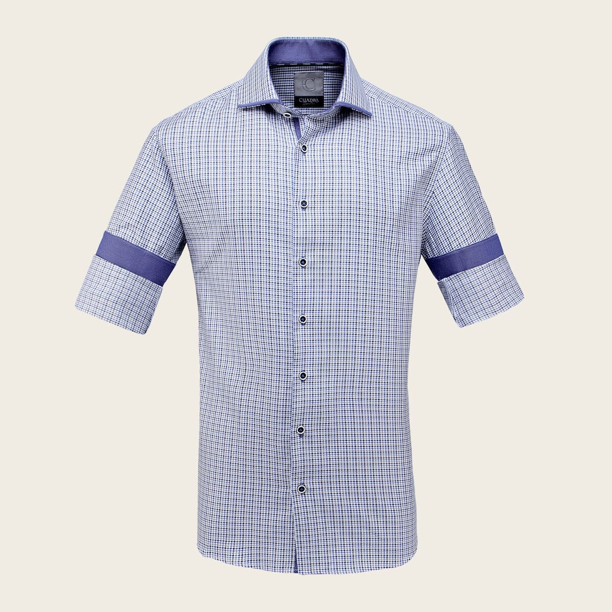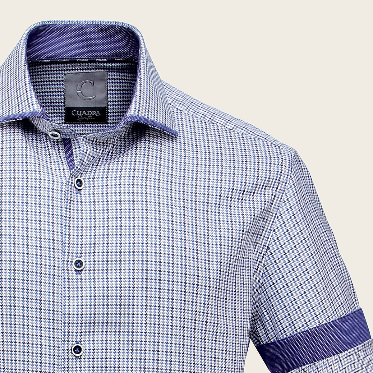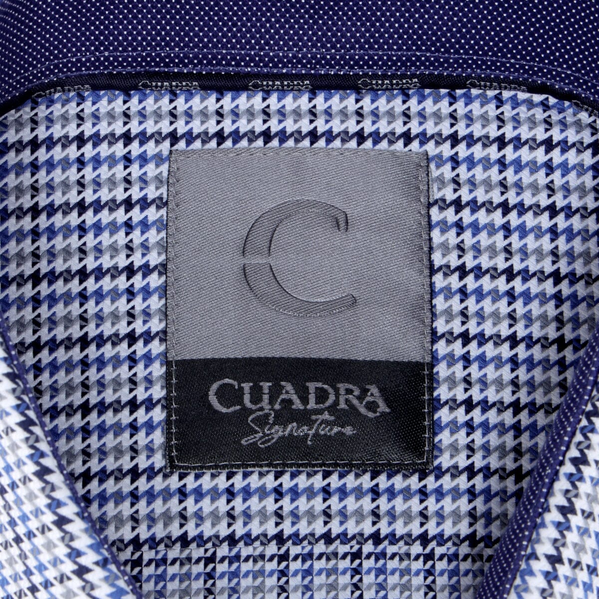 Camisa Cuadra signature para caballero. Presenta tejido de fibras naturales y algodón egipcio, con estampado en contraste de color y parche interno con el monograma de la marca. Ajustada con botones frontales y en mangas. Cuenta con tirantes removibles debajo del cuello que evitan marcas durante la limpieza y planchado.