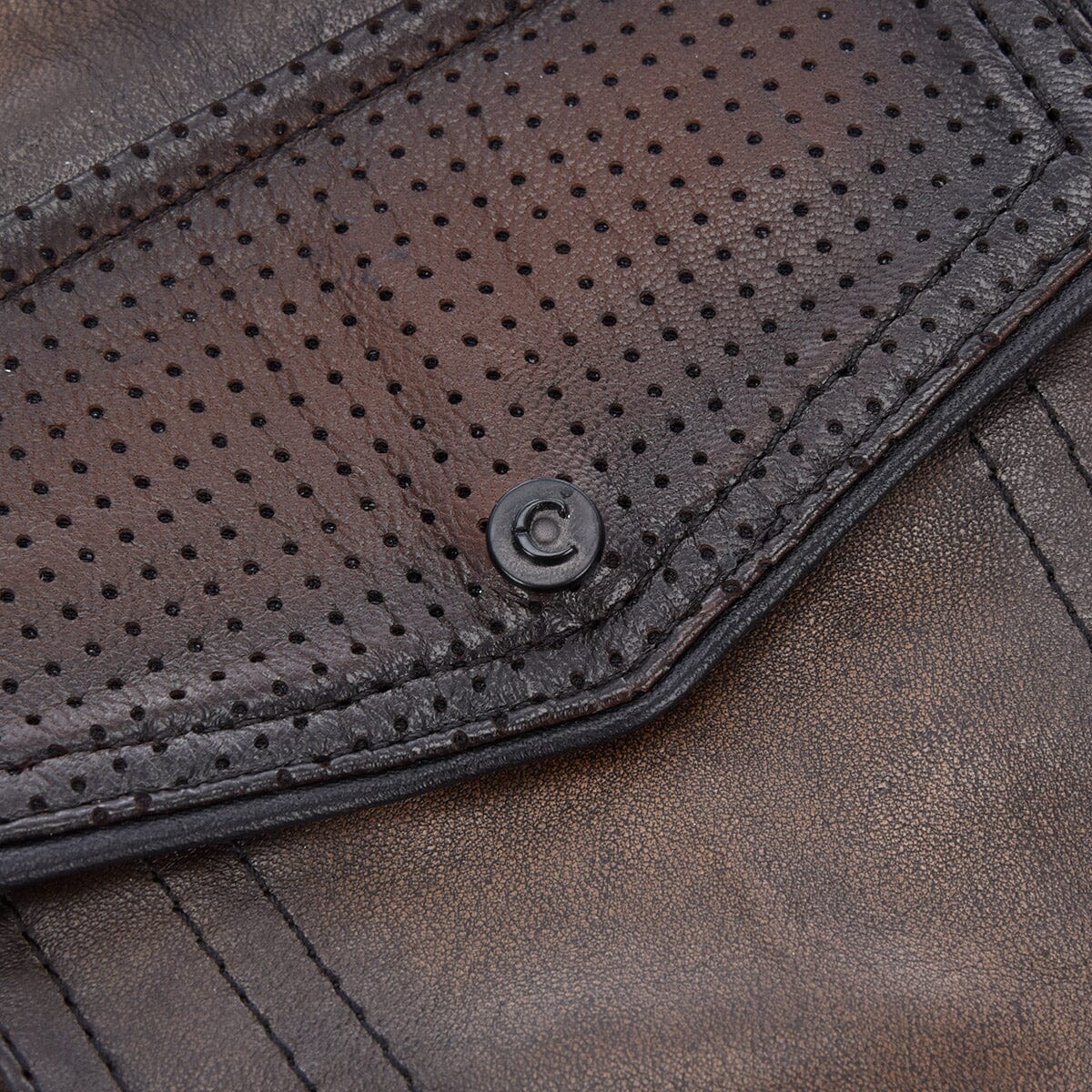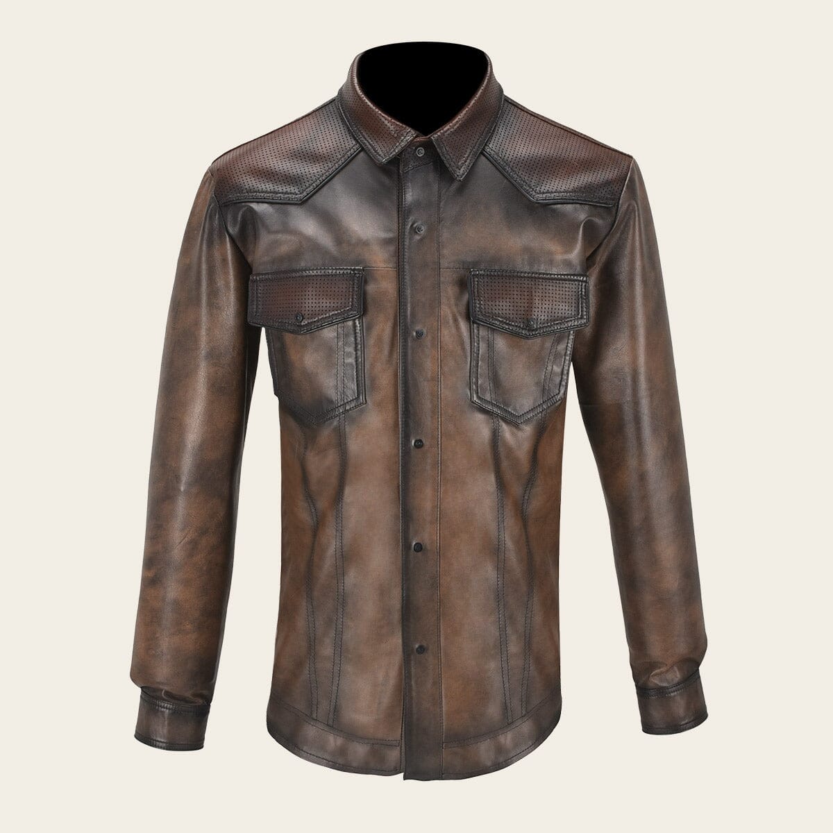 Camisola para caballero en genuina piel de ovino. Presenta fino perforado redondo en hombros, cuello y bolsillos frontales. Cuenta con dos bolsillos frontales ajustados con broche. Ajuste en la parte central delantera y puños con botones personalizados de la marca. Color café
