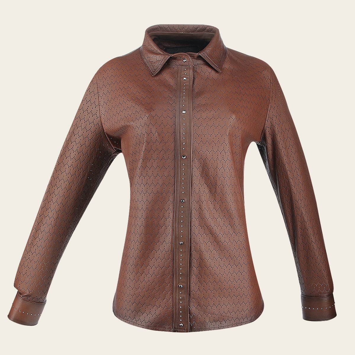 Camisola para dama en piel genuina de ovino, Cuenta con perforado de puntos. No cuenta con forro. Ajuste en la parte central y puños por medio de broches con cristales auténticos. Color café.
