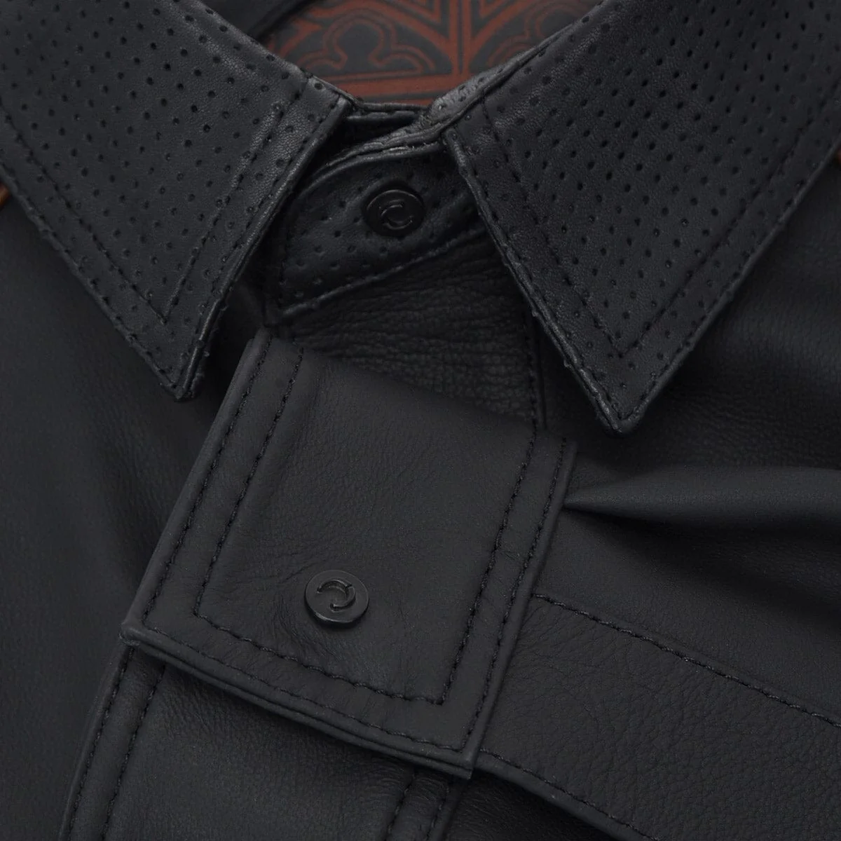 Camisola para caballero en piel genuina de ovino. Cuenta con dos bolsillos frontales asegurados con botón, con perforado en piel y franjas en contraste de color. En hombros y cuello cuenta con aplicación de piel perforada y con bordes en contraste de color. Ajuste por medio de botones.