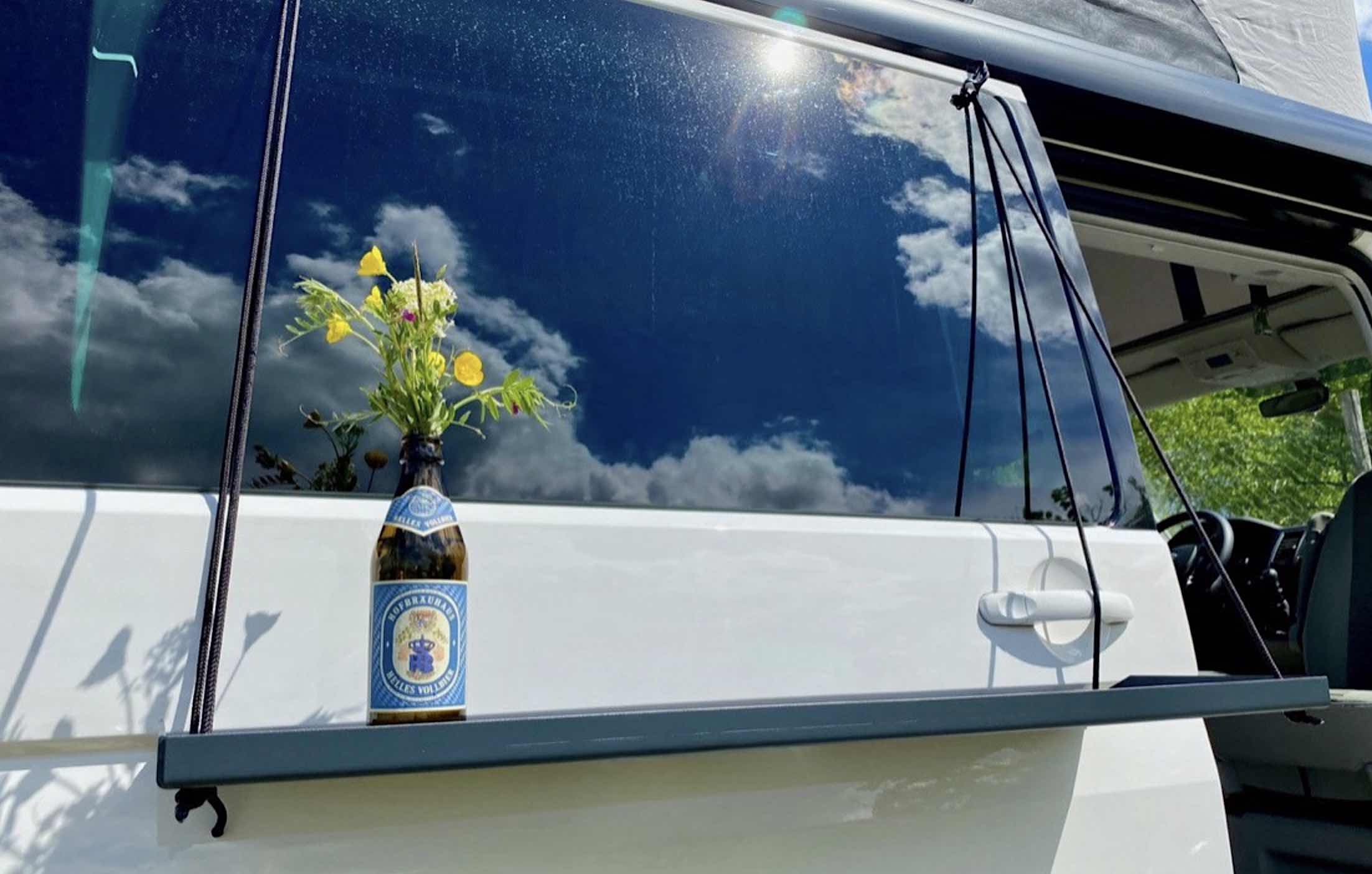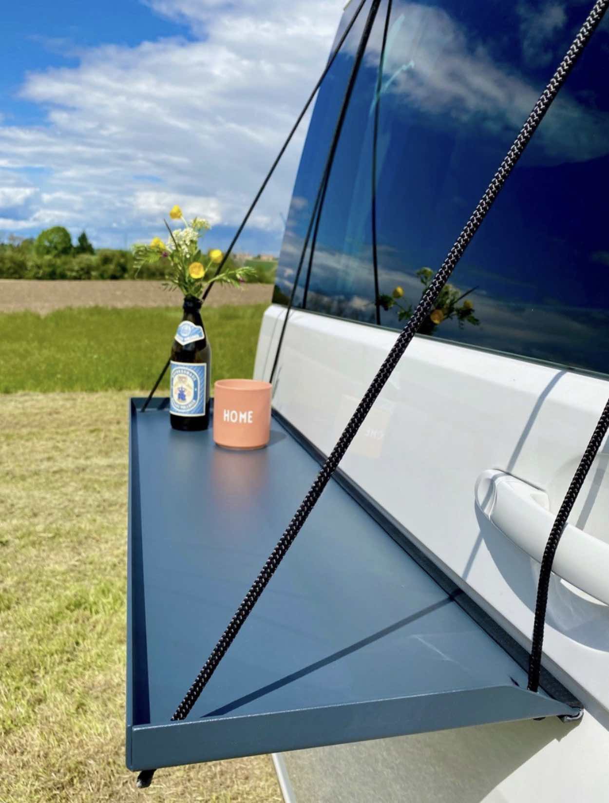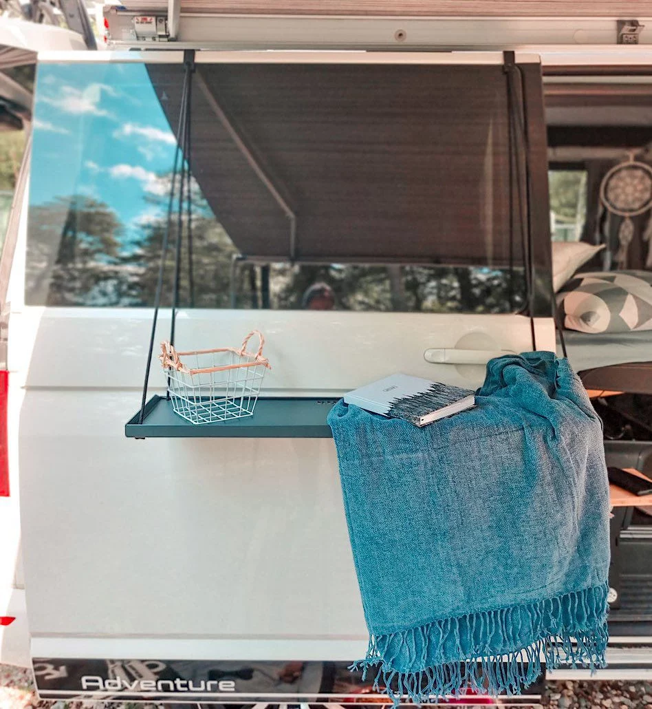 Perfecta para actividades al aire libre, la barra proporciona un espacio funcional y accesible justo al lado de tu camper. Su diseño compacto y robusto se adapta a la puerta corredera sin ocupar espacio adicional y está lista para soportar utensilios de cocina, botellas o accesorios de camping.