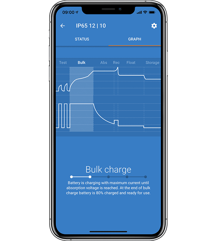 El Blue Smart IP22 está equipado con Bluetooth incorporado, por lo que el estado del cargador y de la batería se puede comprobar en un smartphone, tablet o portátil. Todos los ajustes del cargador se pueden configurar con la aplicación VictronConnect tanto para Android y Iphone.