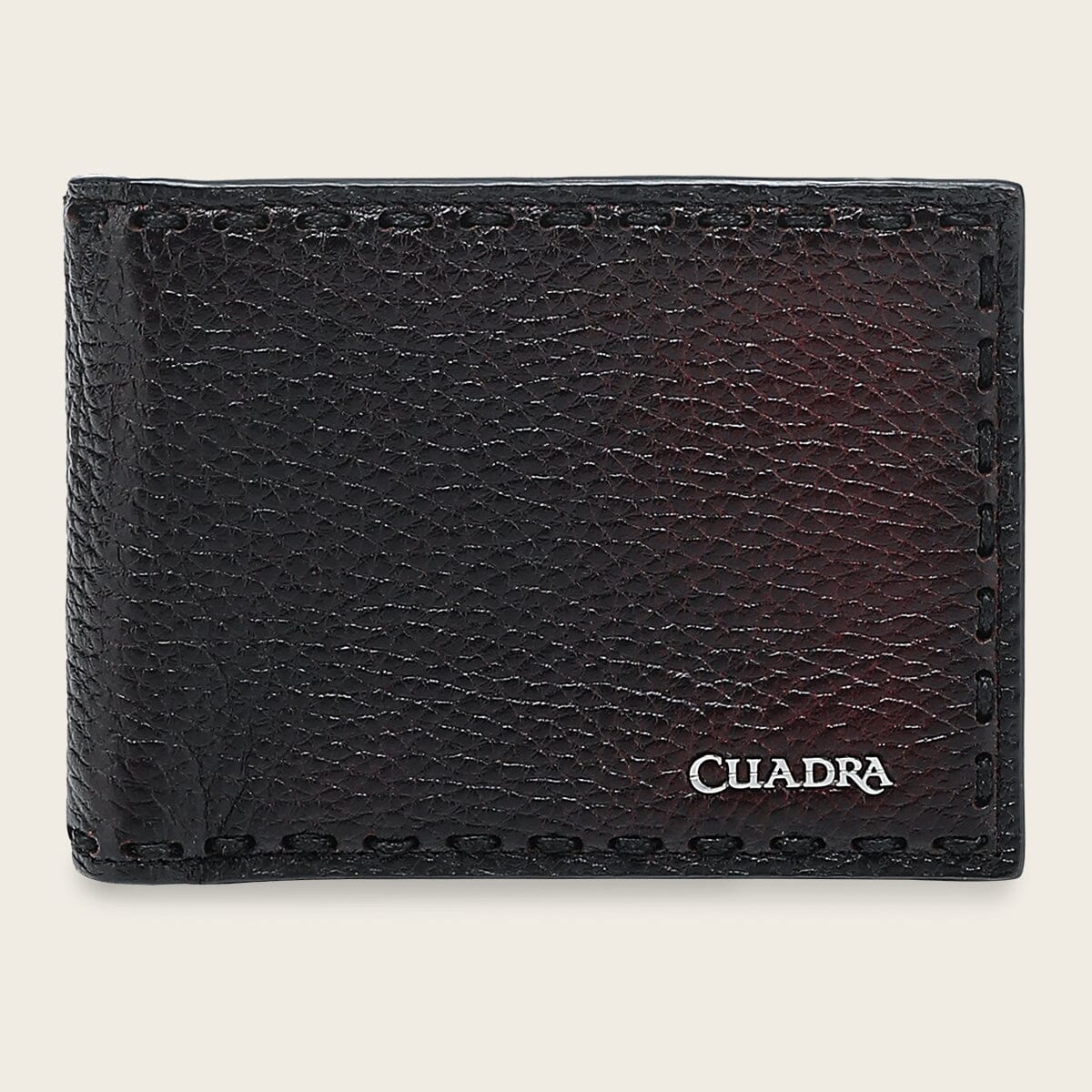 Cartera en piel genuina de venado para caballero. Al frente presenta detalles de tejido artesanal y aplicación metálica del logotipo Cuadra. En su interior cuenta con grabado del logotipo, ocho espacios para tarjetas y dos espacios para efectivo.