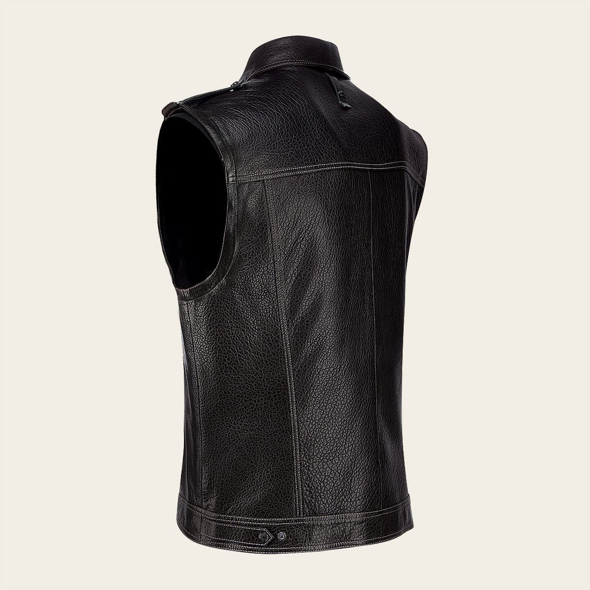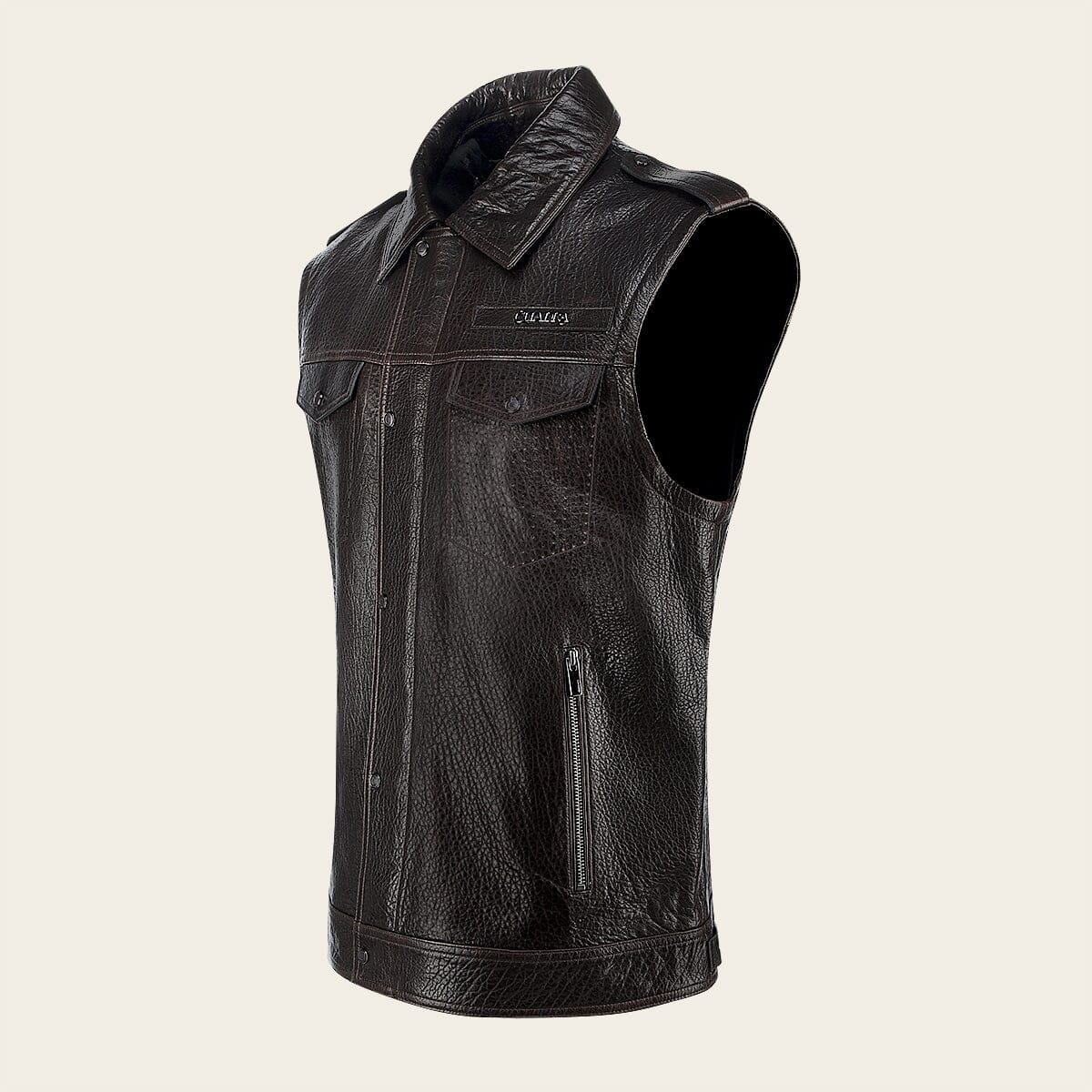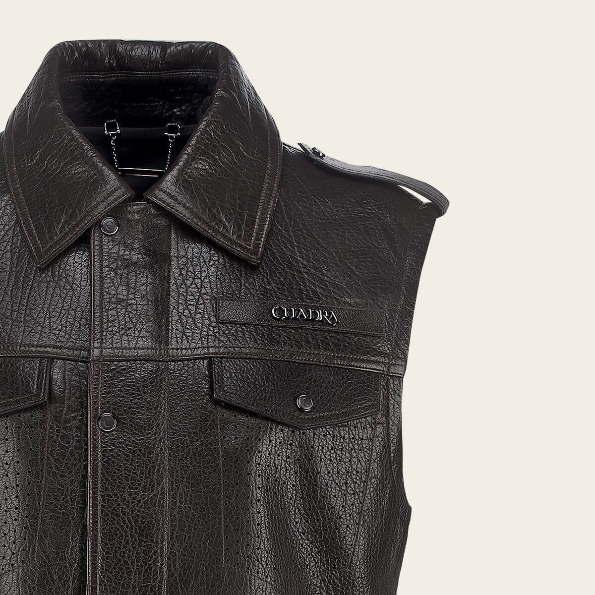 Chaleco para caballero en piel genuina de ovino. Presenta dos bolsillos laterales ajustados con cierre y dos frontales ajustados con broches, con aplicación metálica del logotipo Cuadra en pecho y dos correas en hombros ajustadas con broches. La parte interna con un bolsillo ajustado con cierre. Ajustada con broches de presión al frente.