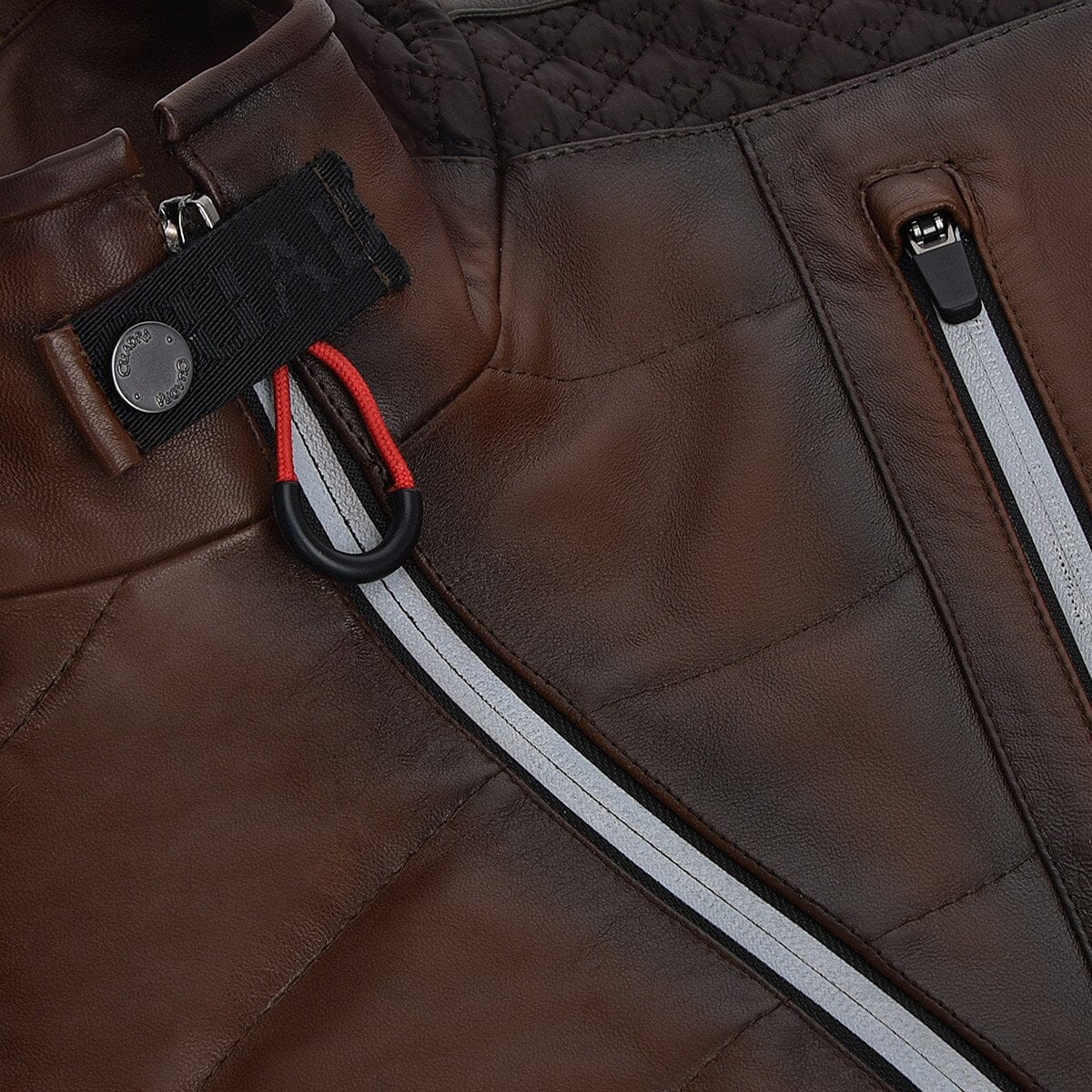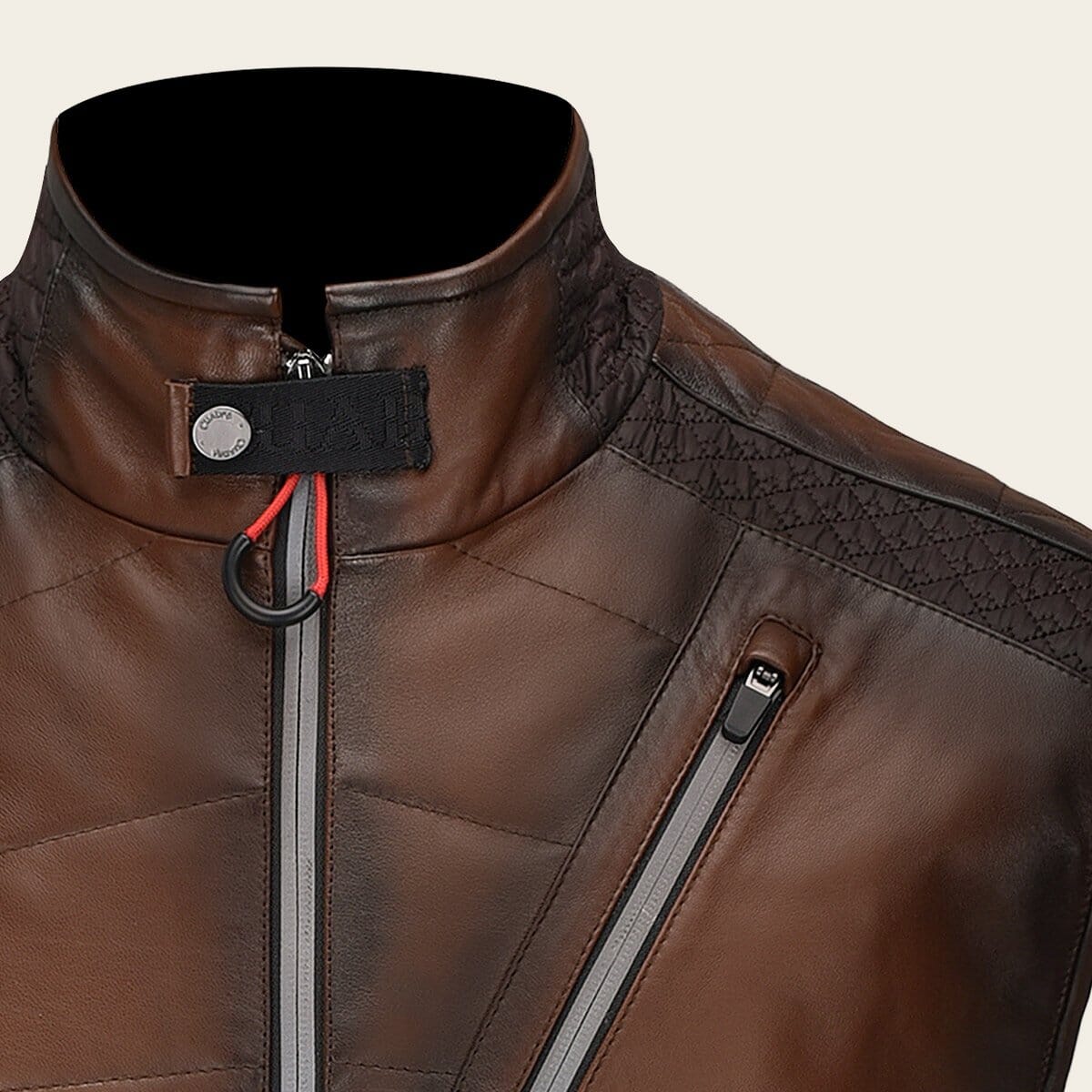 Chaleco para caballero en piel de ovino. Con bordado capitonado y aplicaciones textiles con bordado capitonado en los hombros, espalda y costados. Cierres enmarcados con aplicaciones reflejantes. Cuenta con dos bolsillos laterales, un bolsillo en el pecho asegurado con cierre, un bolsillo extra en la parte trasera y dos bolsillos internos. Ajustado con cierre frontal.