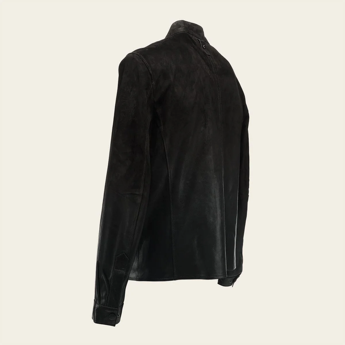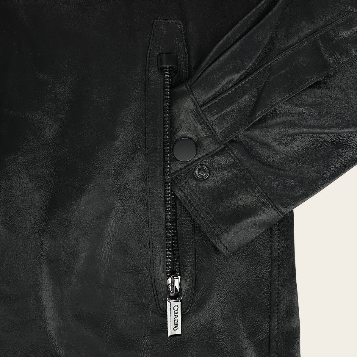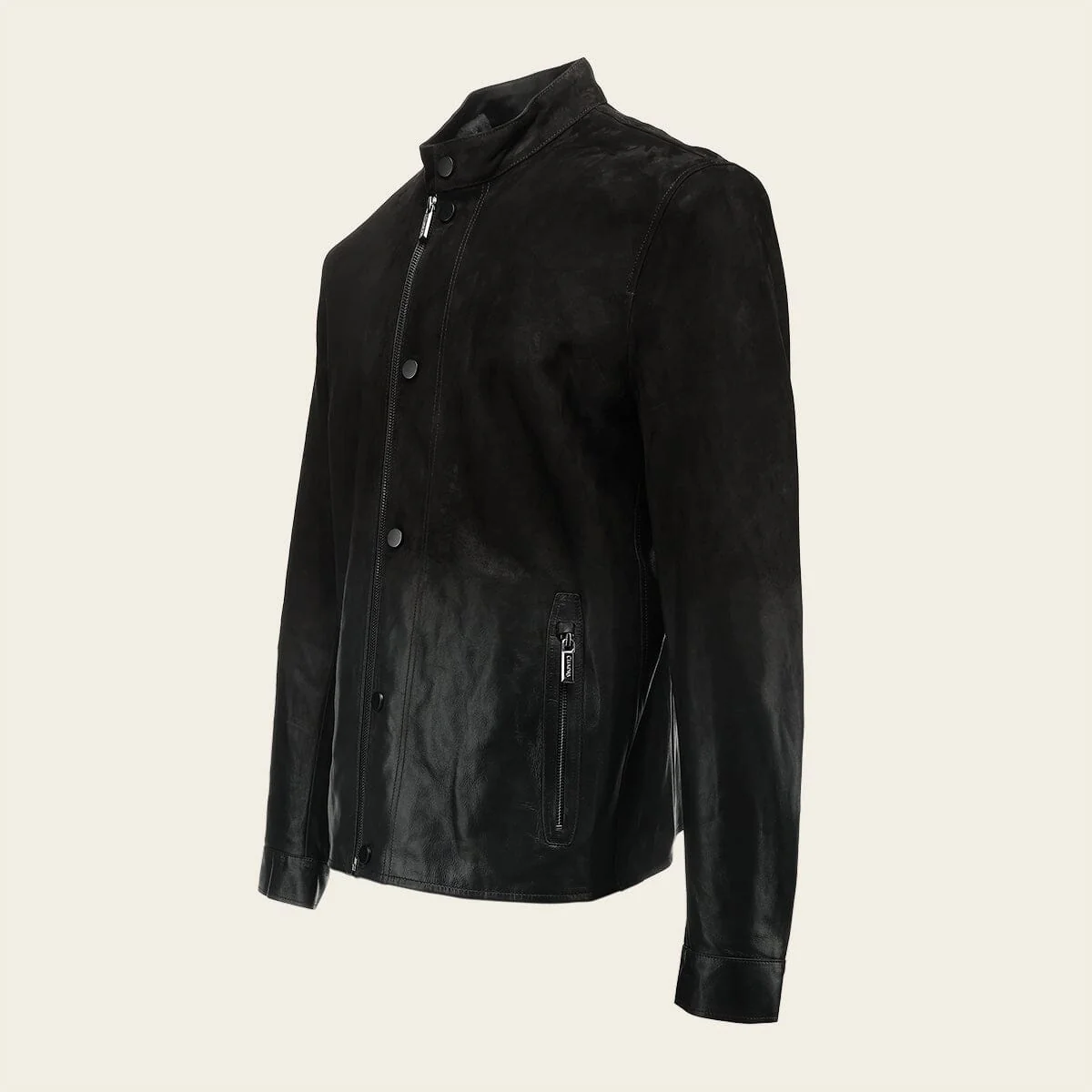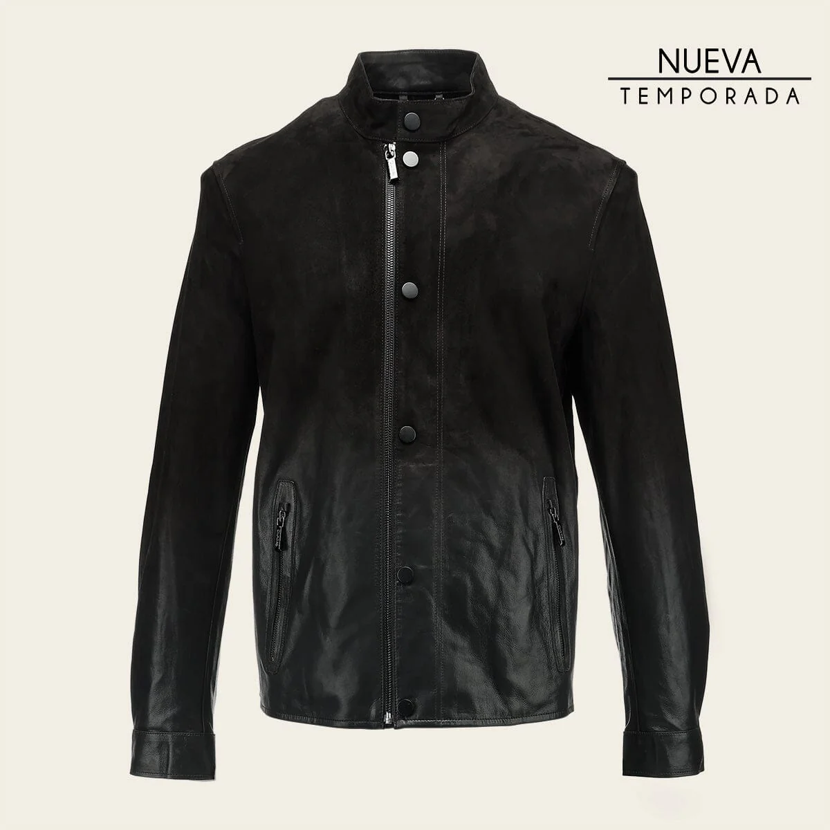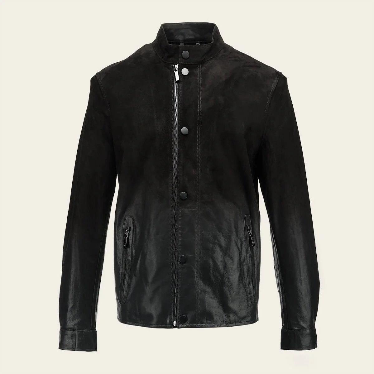 Chamarra para caballero en piel genuina de cordero. Presenta acabado con degradado a nobuk, dos bolsillos laterales con cierre y dos bolsillos internos. Ajustada con cierre frontal y broches al frente y en los puños. Sin forro.