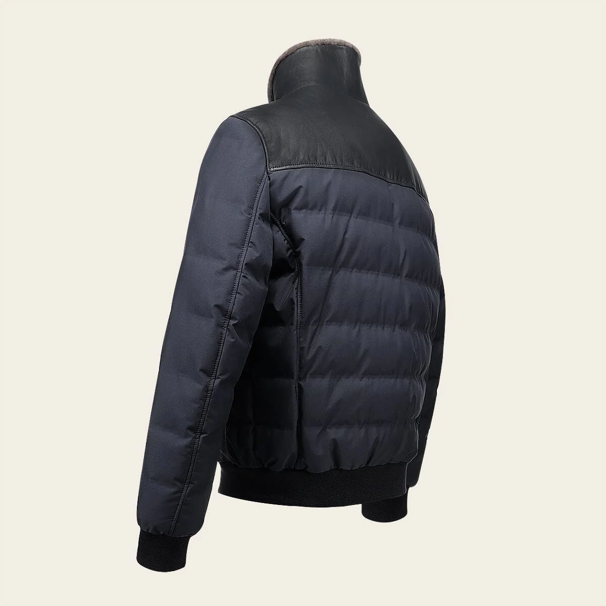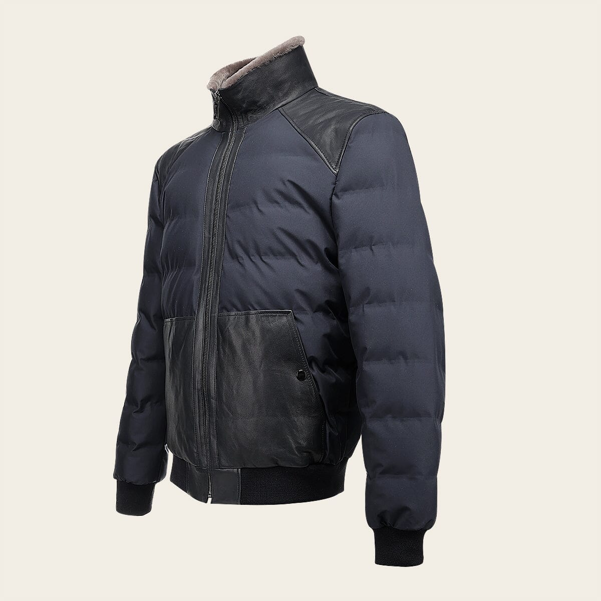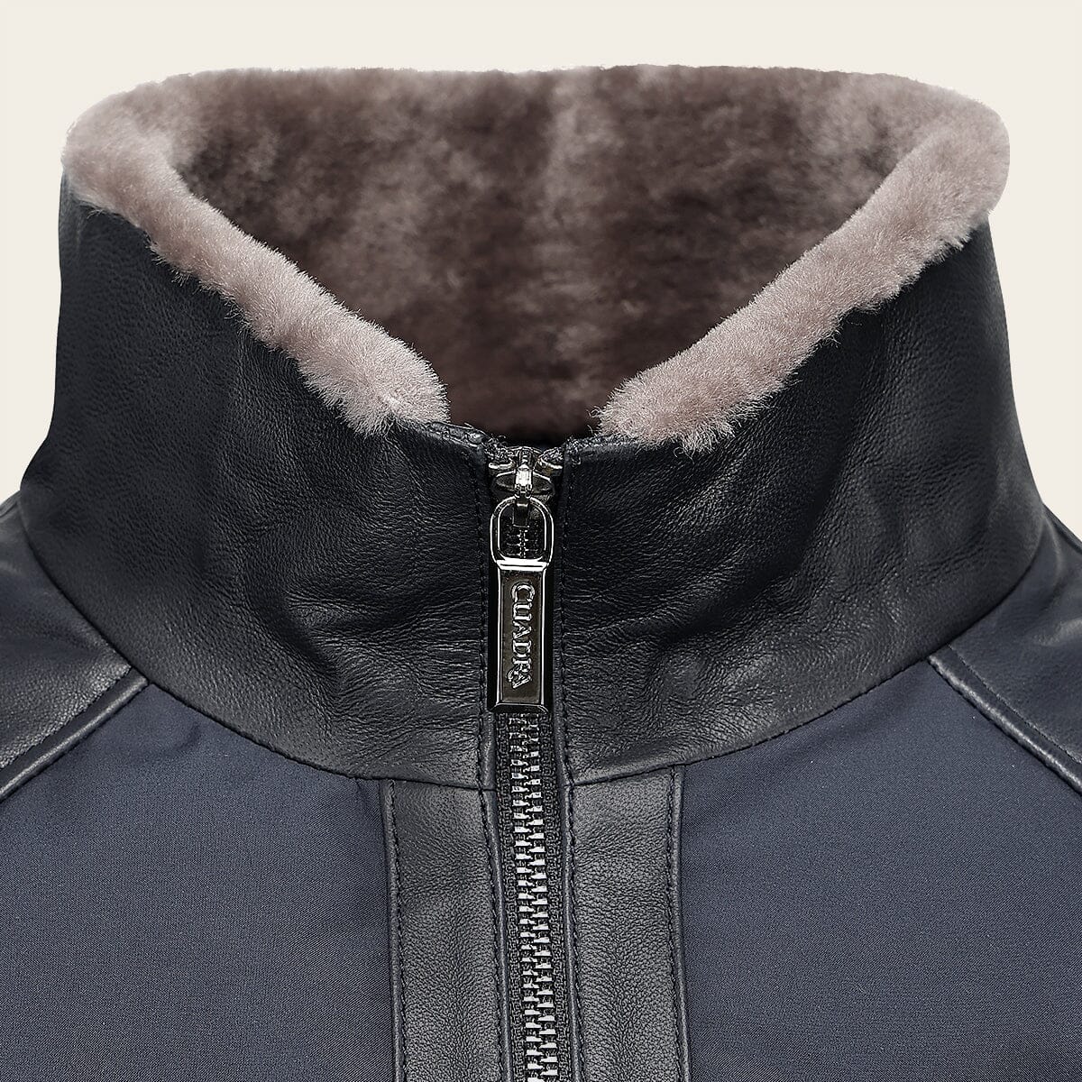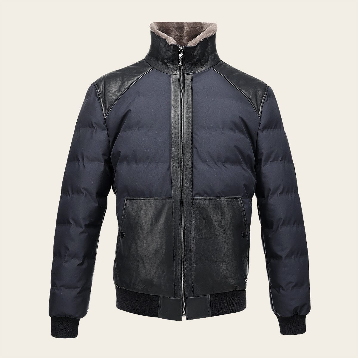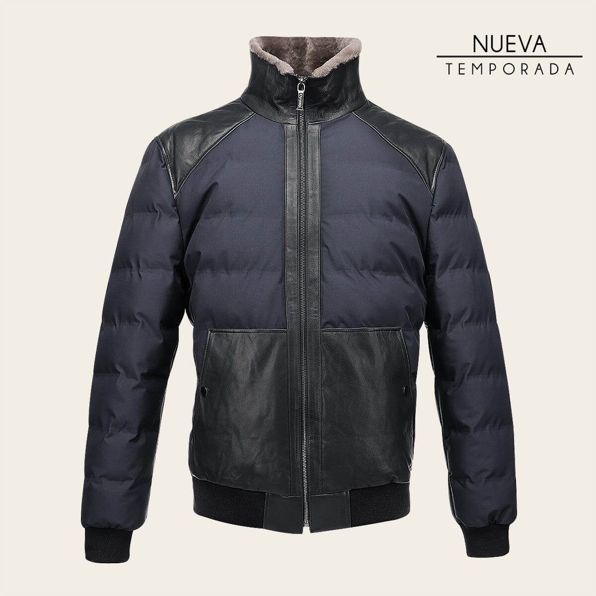 Chamarra para caballero en piel genuina de cordero. Presenta pelo genuino en el cuello, textil, dos bolsillos laterales y elástico en puños y borde inferior. Ajustada con cierre frontal.