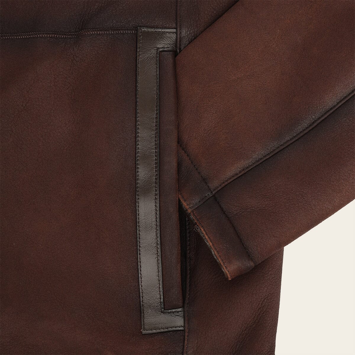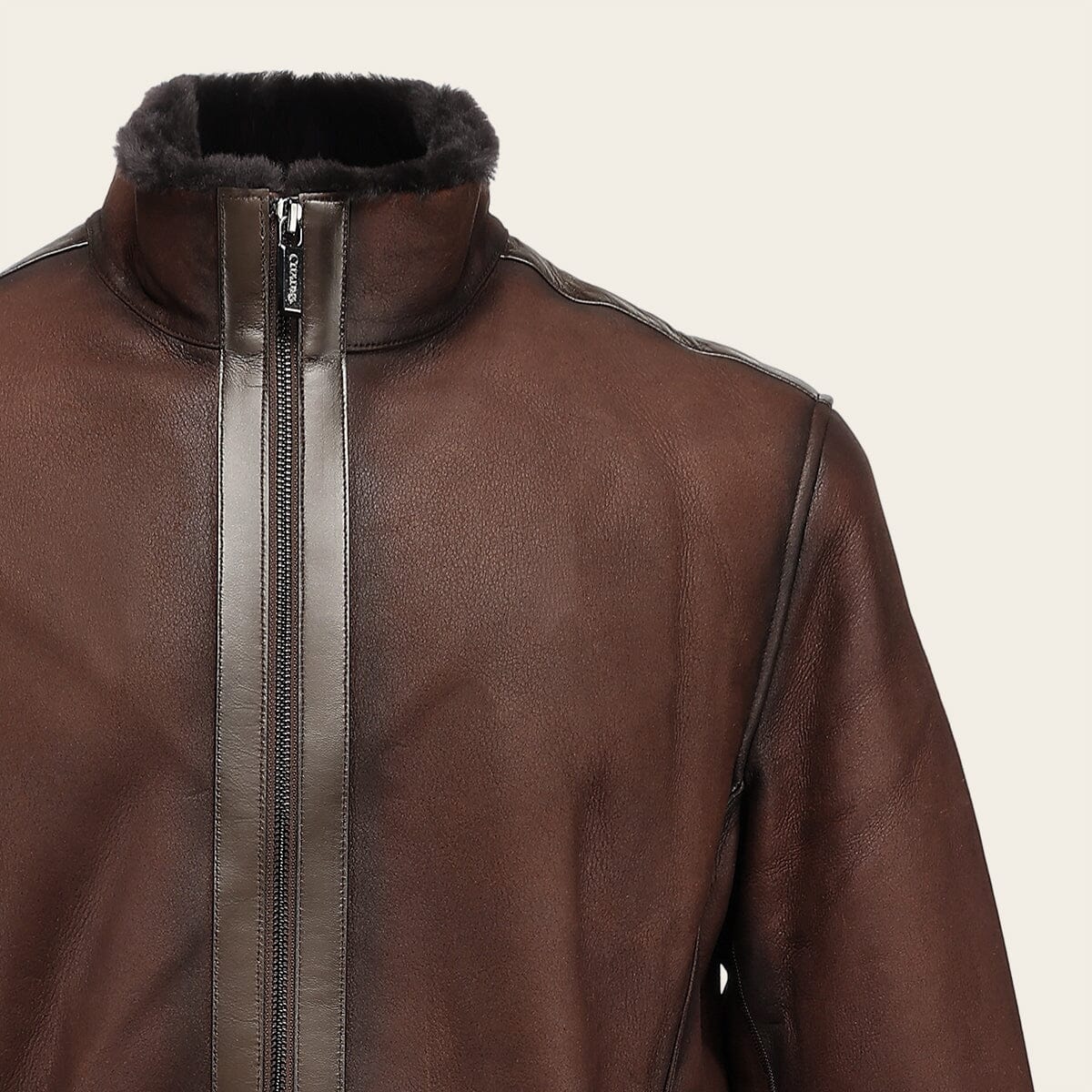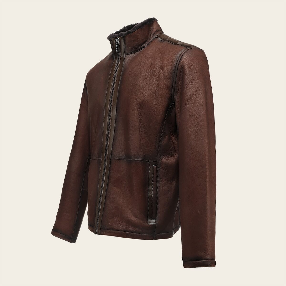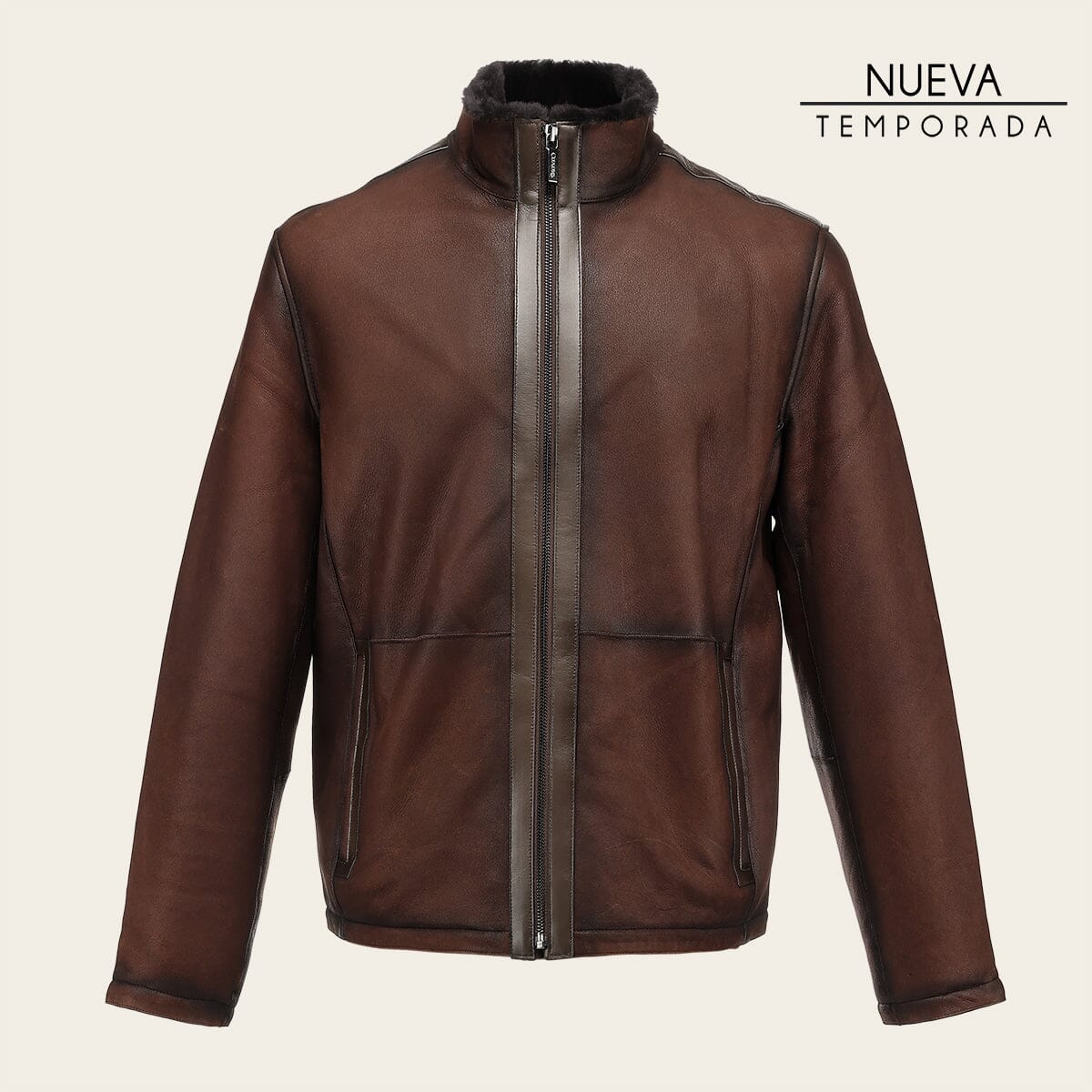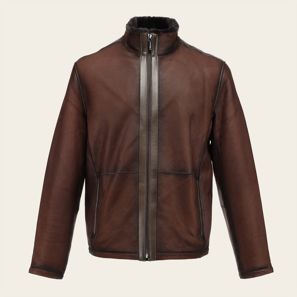 Chamarra para caballero en piel genuina de cordero. Presenta acabado sombreado, dos bolsillos laterales con imán un bolsillo interno. Con pelo genuino en la parte interna. Ajuste frontal con cierre.