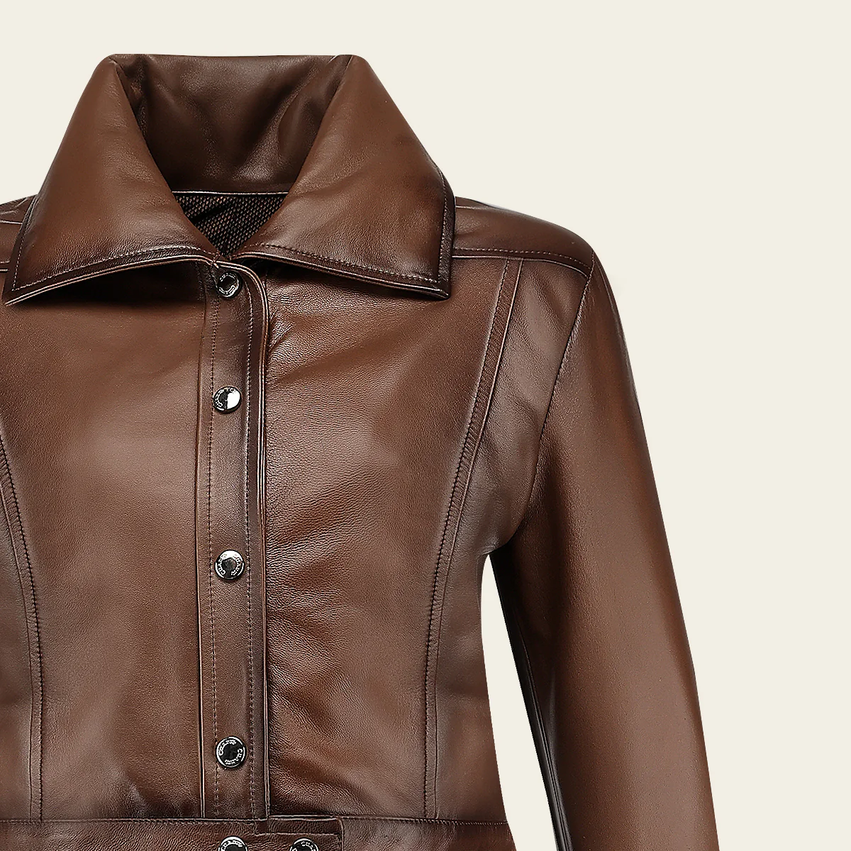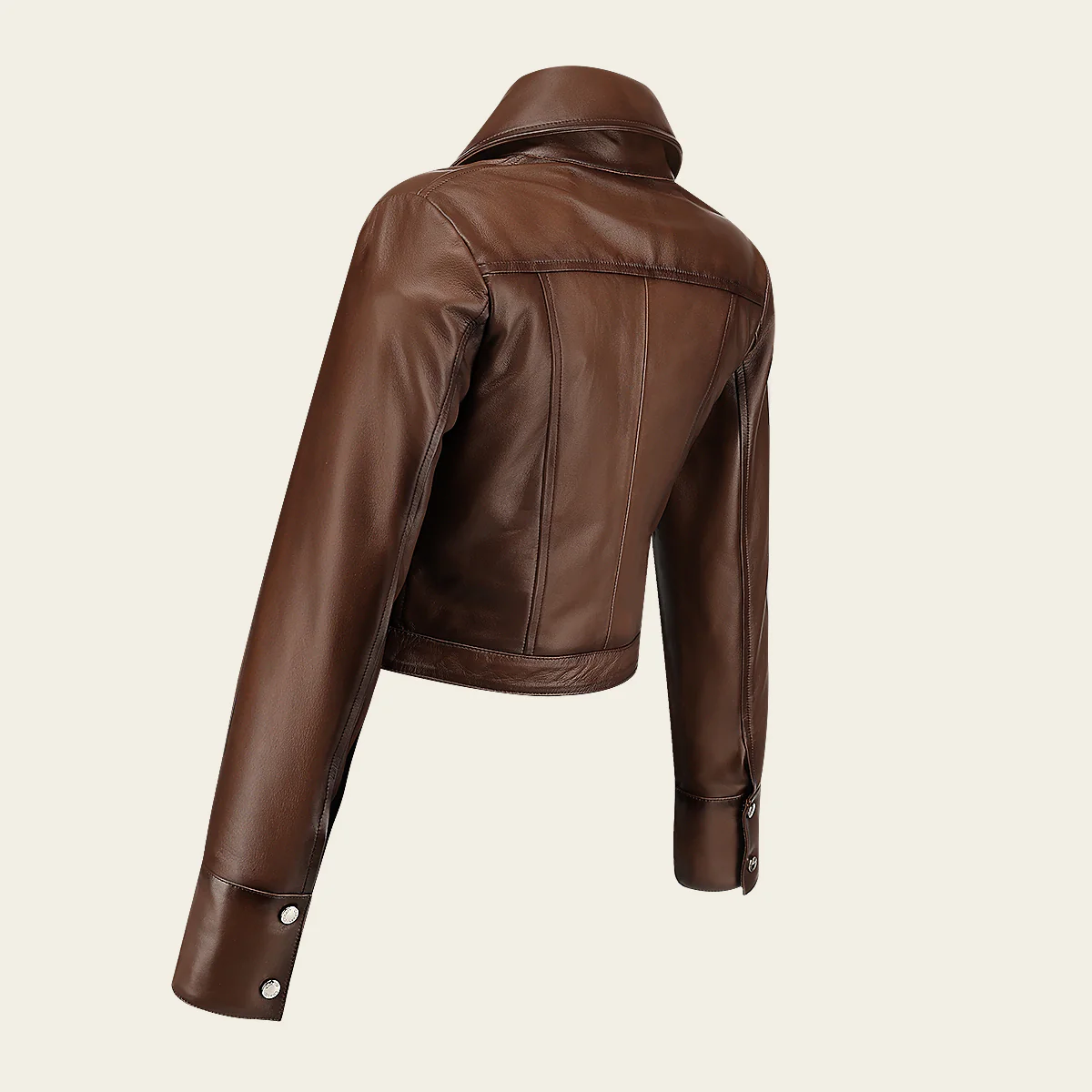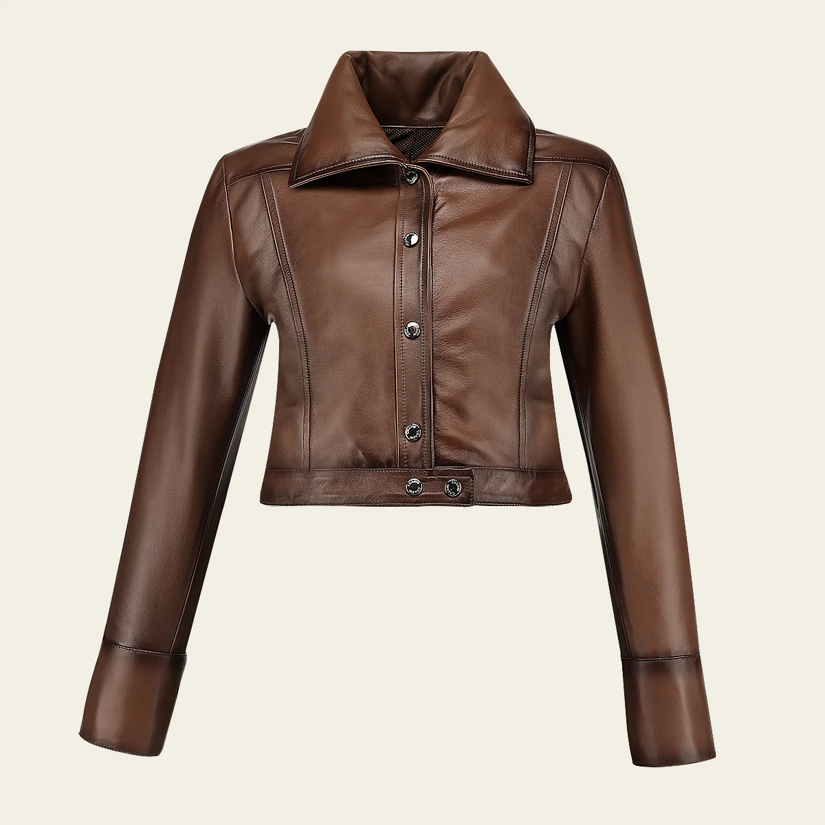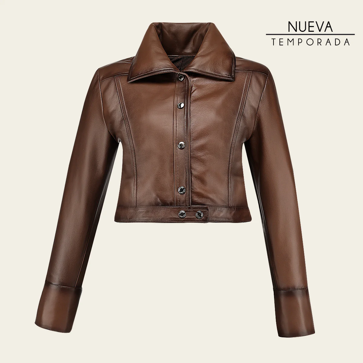 Chamarra para dama en piel genuina de ovino. Presenta cuello camisero y sombreado a mano. Ajustada con broches al frente y en los puños. Sin bolsillos. Con forro ligero.