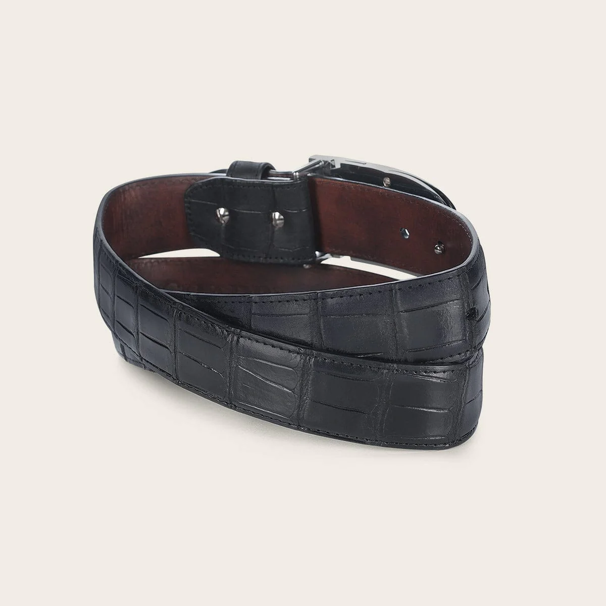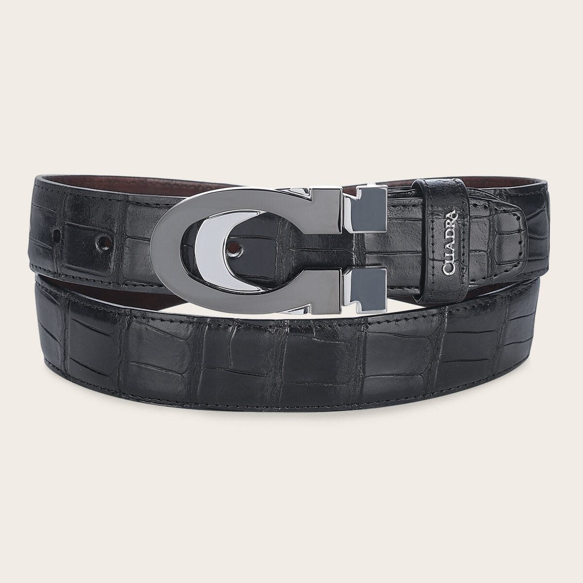 Cinturón casual para caballero en piel genuina de alligator. Presenta aplicación metálica de logotipo Cuadra en la trabilla. Con doble hebilla metálica de monograma Cuadra.