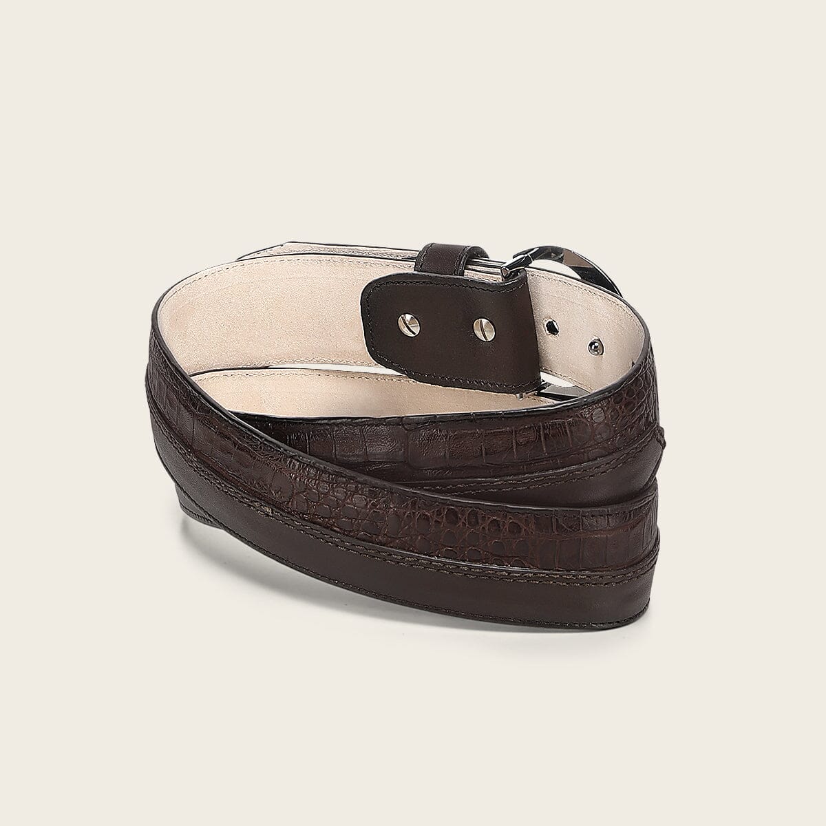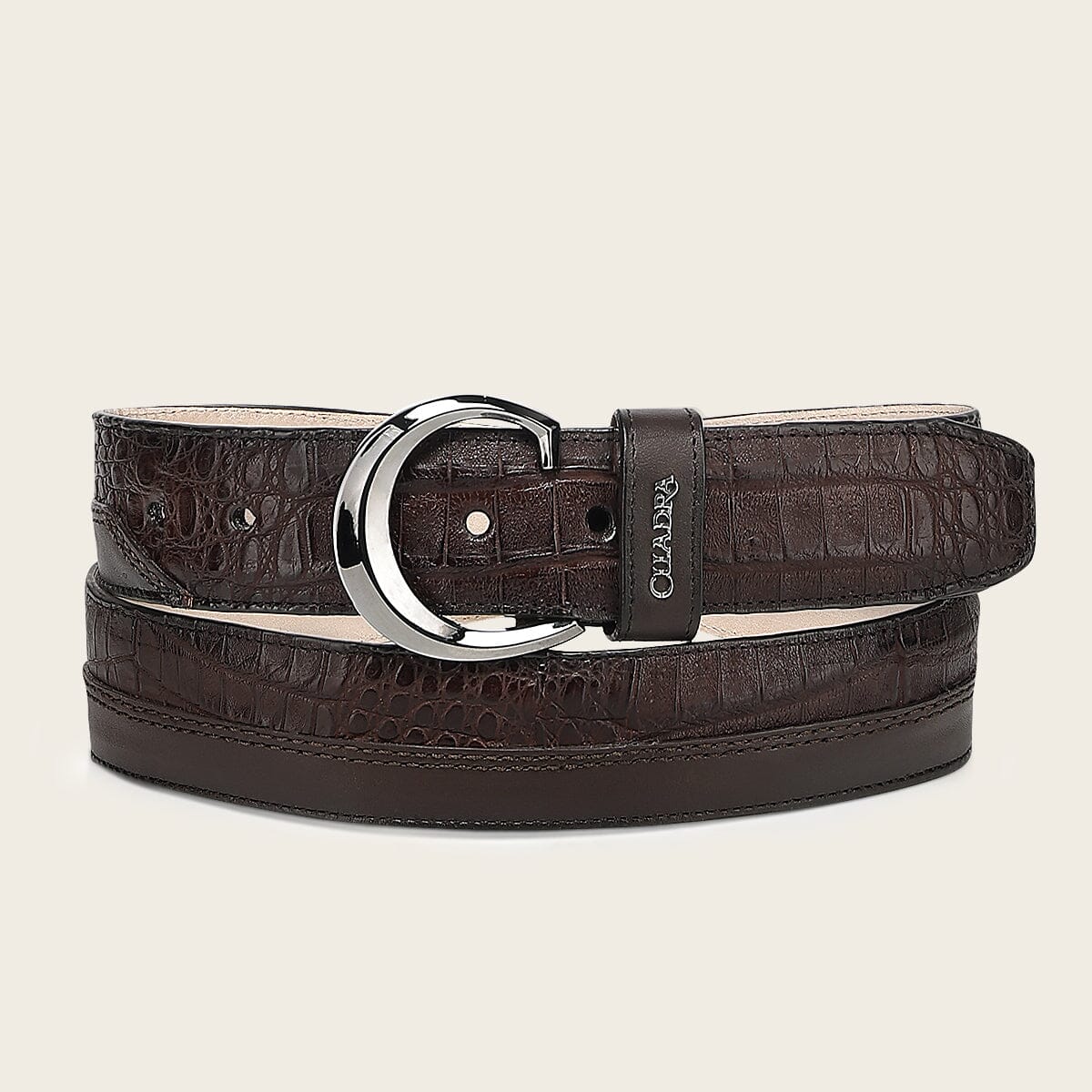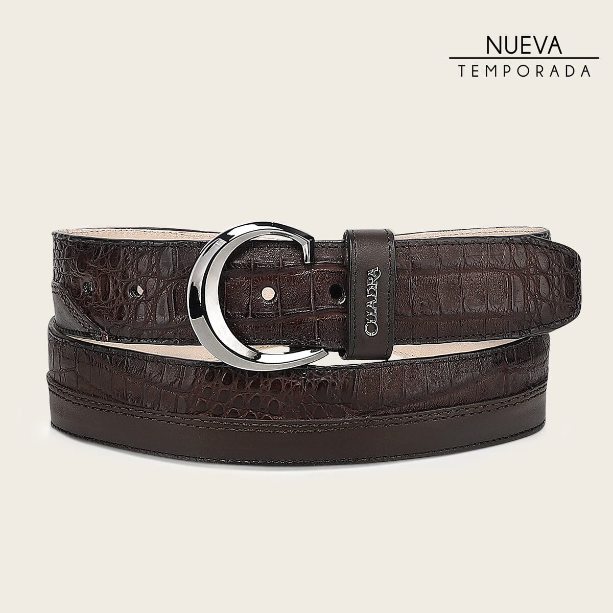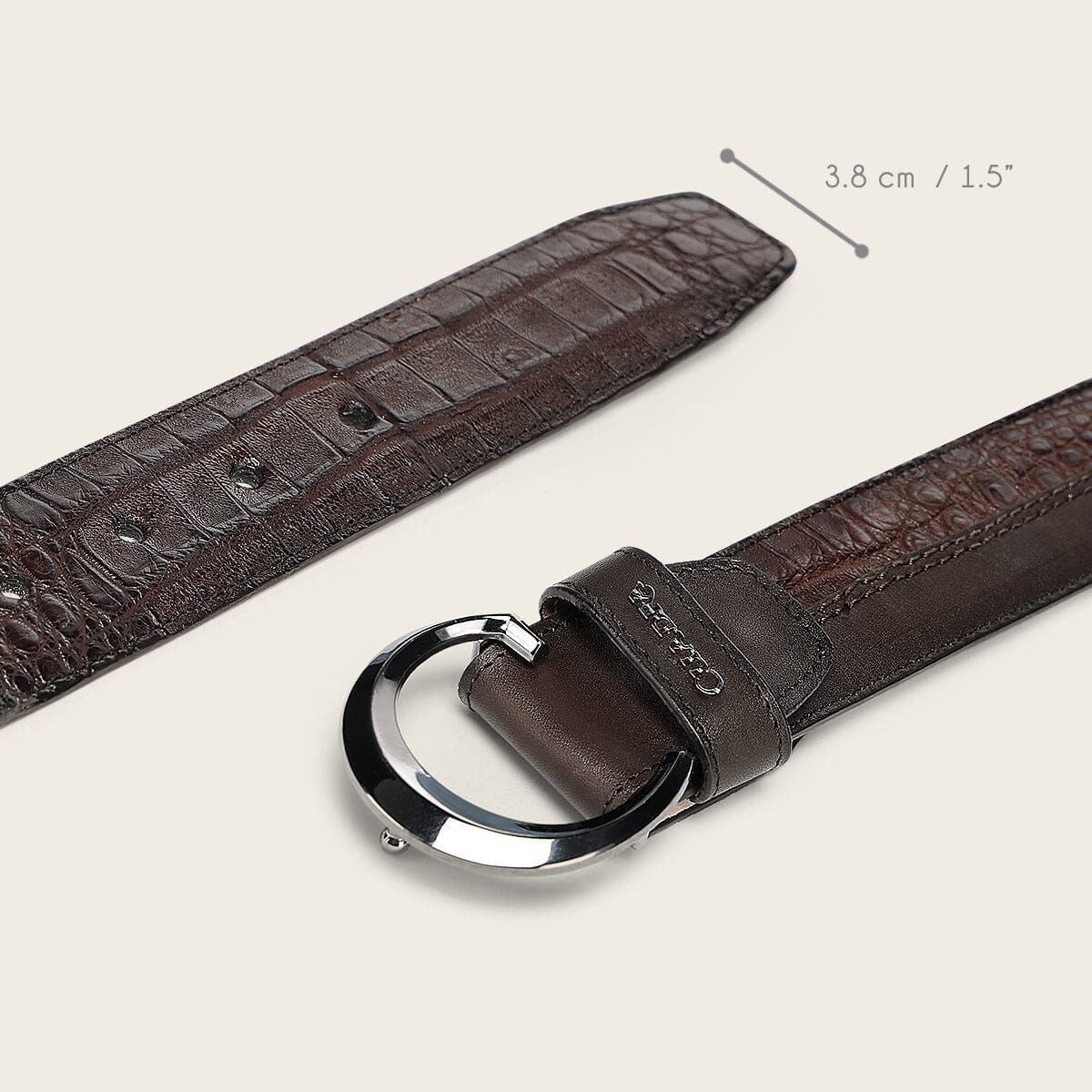 Cinturón casual para caballero en piel genuina de fuscus y piel de bovino. Presenta aplicación metálica de logotipo. Con hebilla metálica de 38 mm del monograma Cuadra. Con forro en piel de bovino.