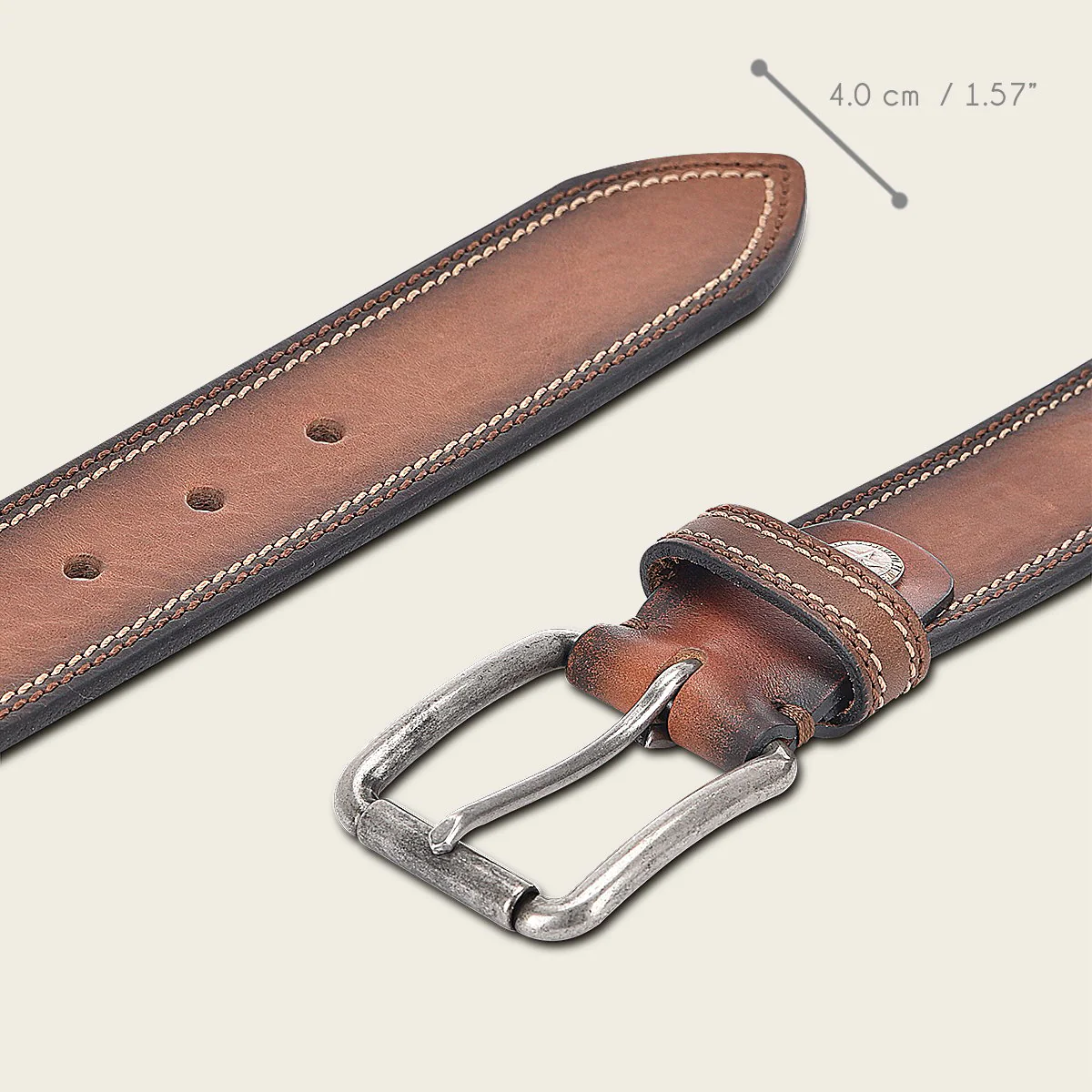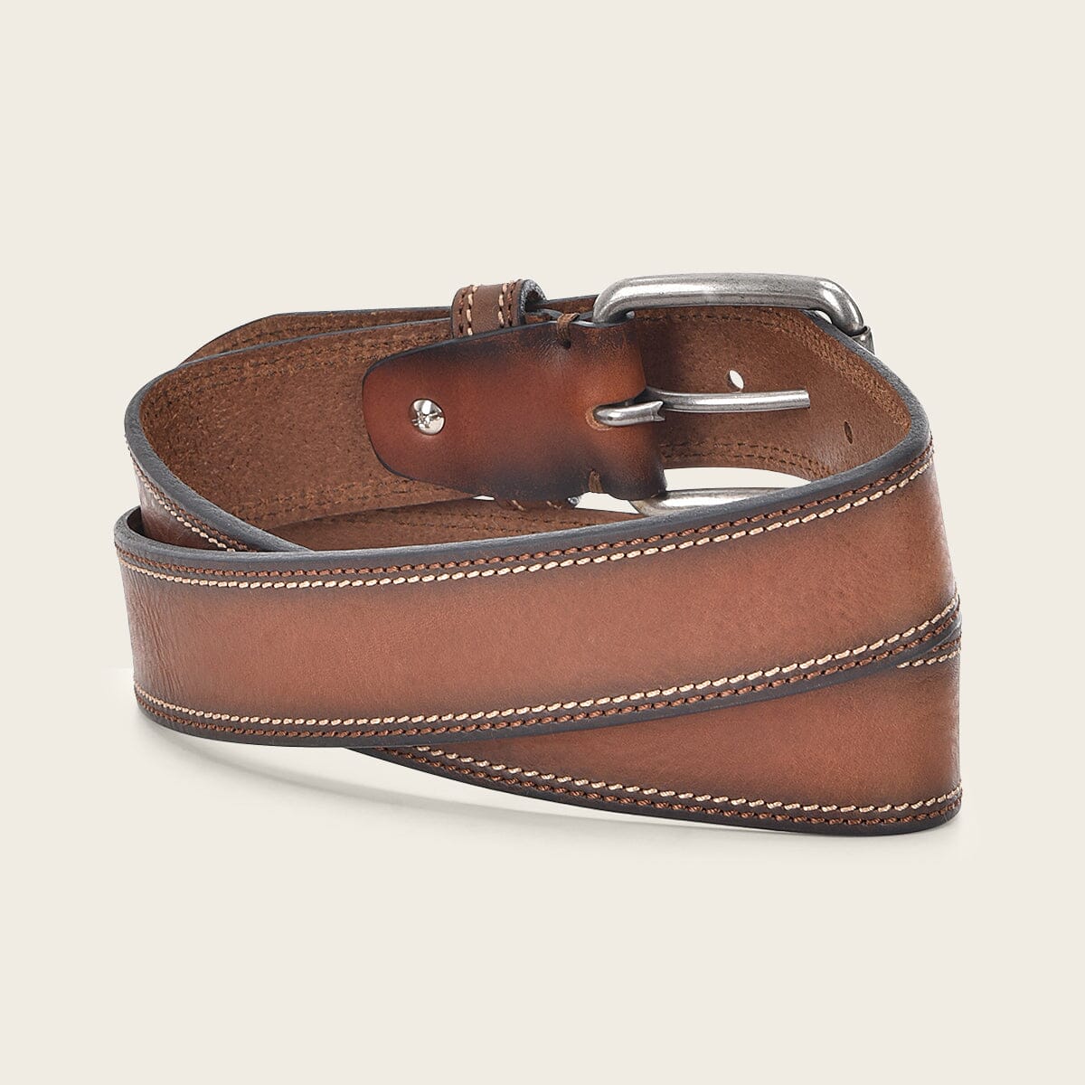 Cinturón casual para caballero en piel de bovino. Con sutil acabado sombreado y bordado en color contrastante en los bordes. Con hebilla metálica.