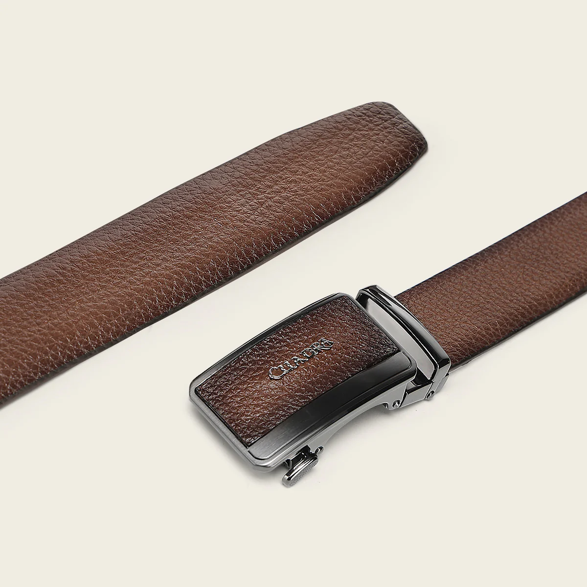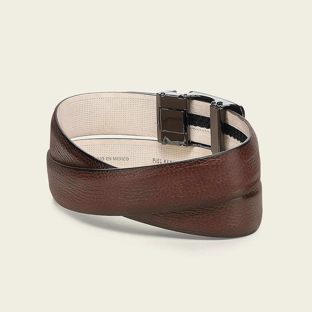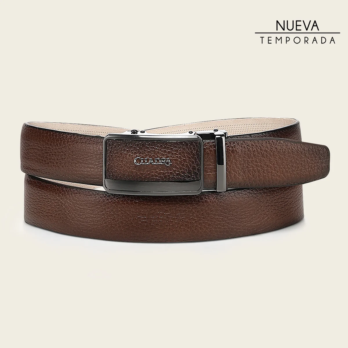 Cinturón de vestir para caballero en piel genuina de venado. Hebilla de trinquete de 38 mm para ajuste personalizado sin agujeros. Aplicación metálica con el logo de Cuadra. Con forro en piel de bovino.