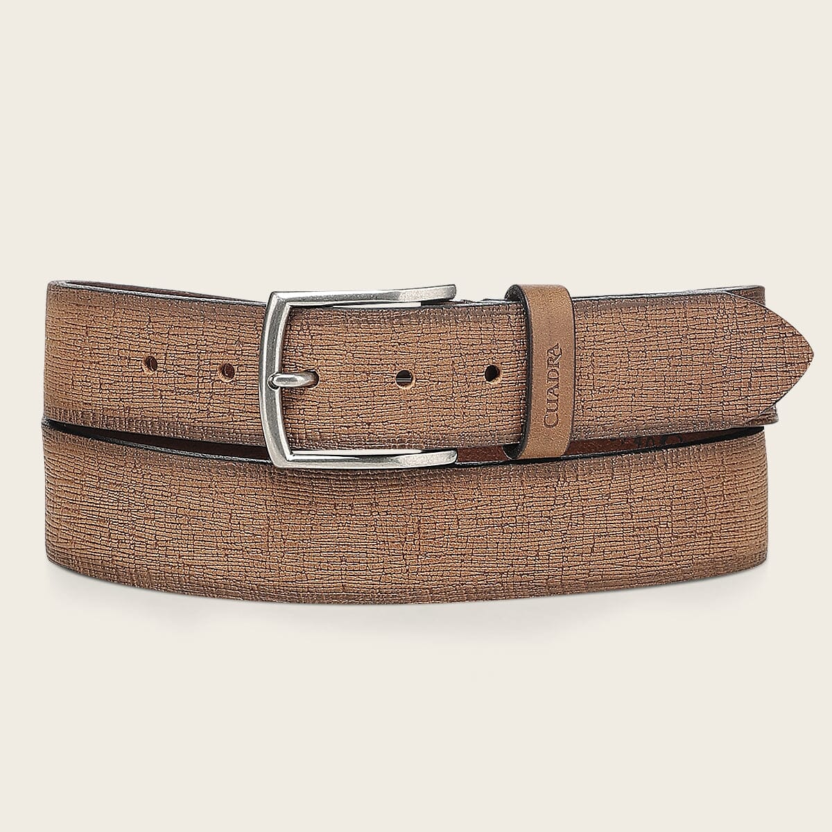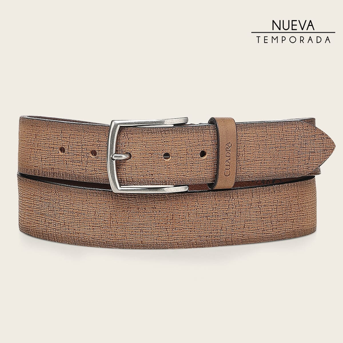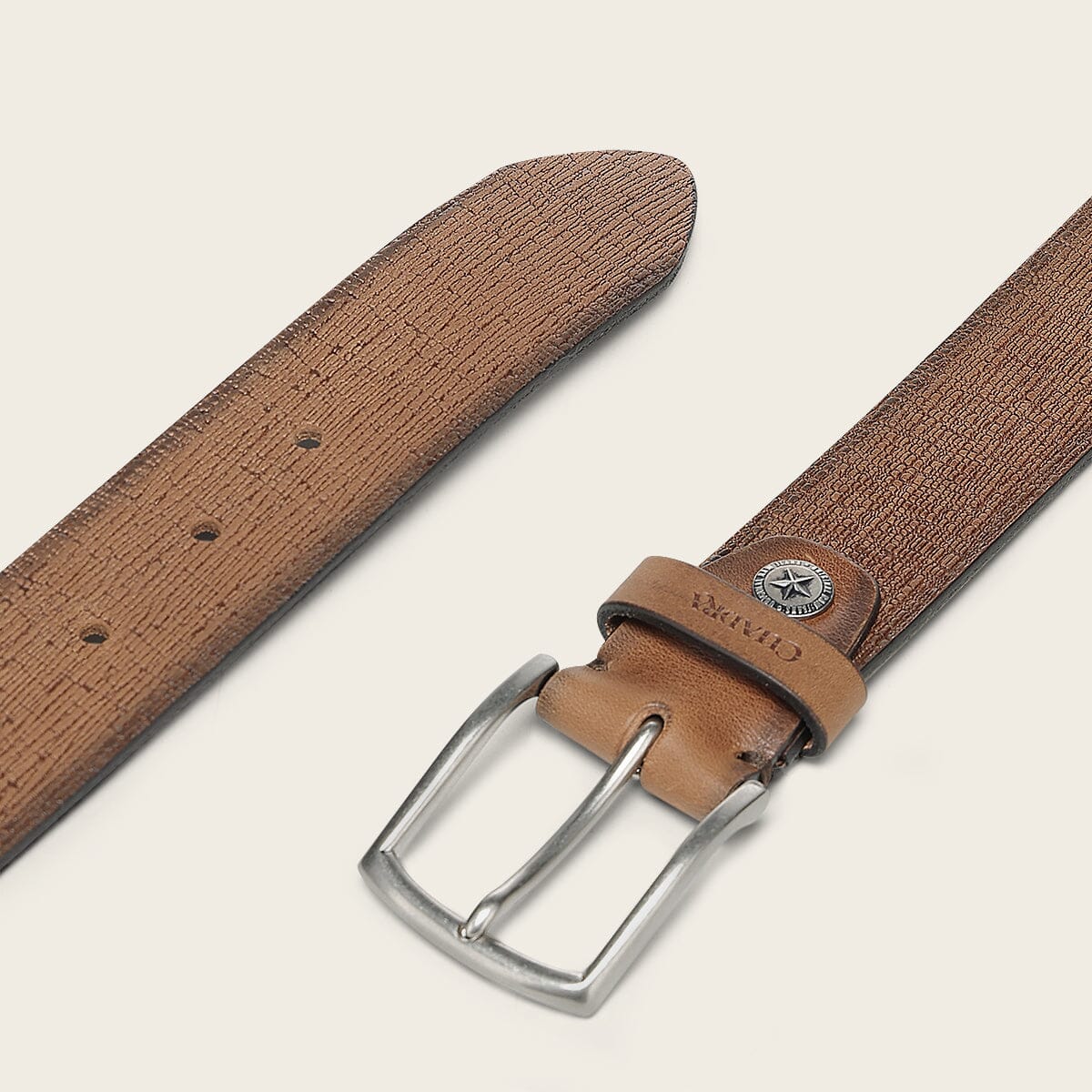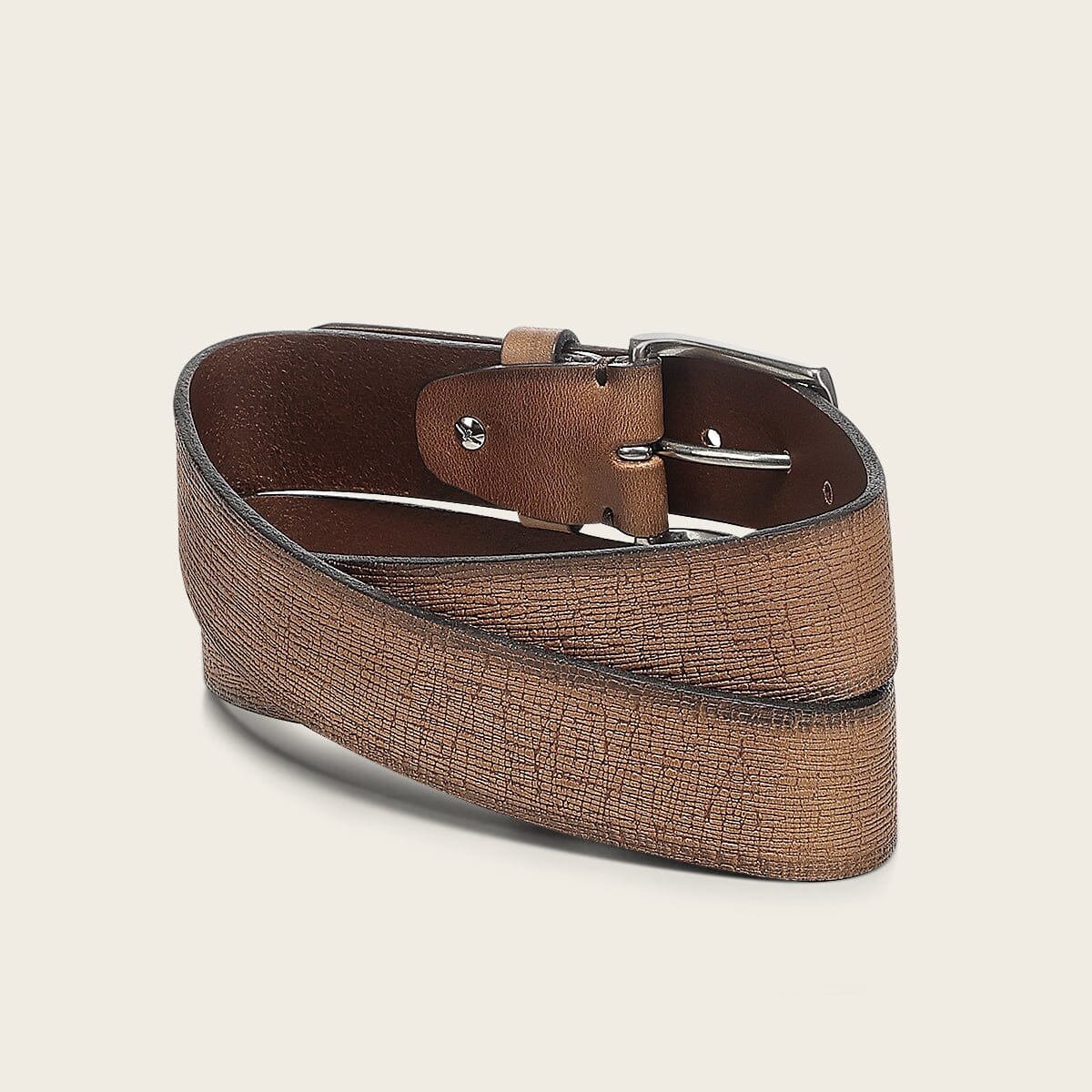 Cinturón de vestir en piel genuina de bovino. Con aplicación metálica en la punta de la tira y hebilla metálica. Sin forro.