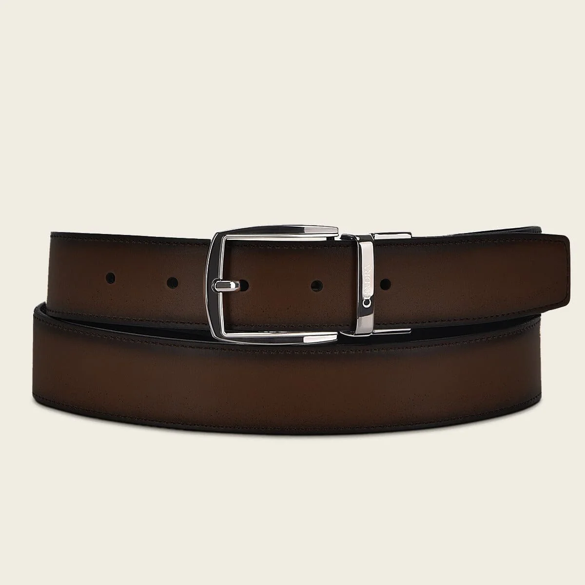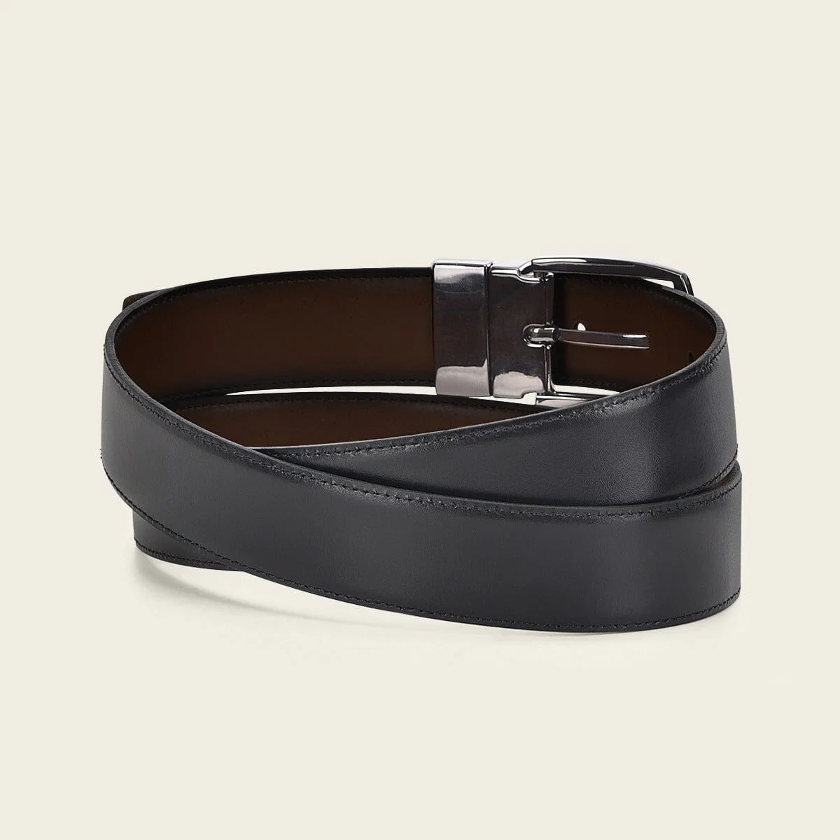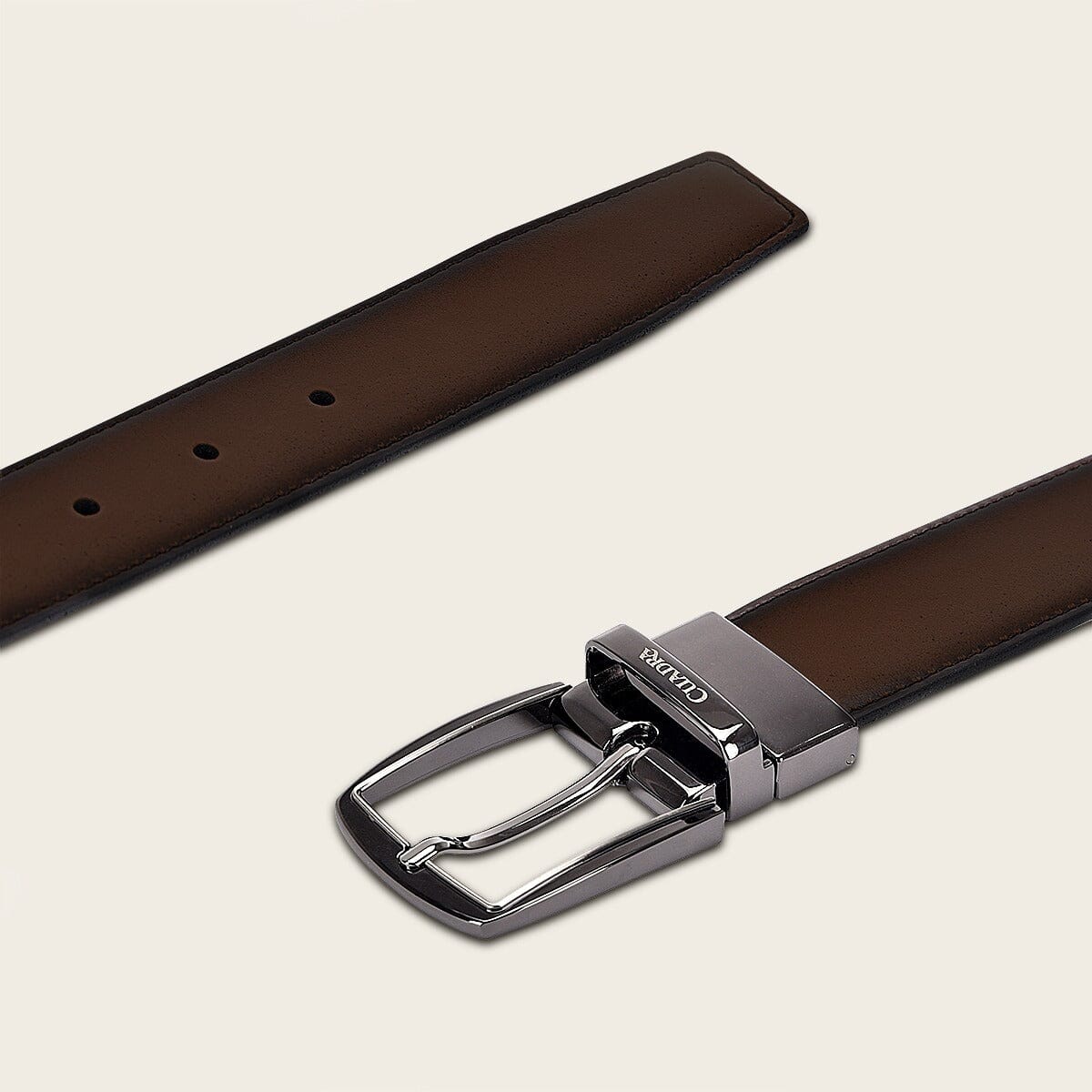 Cinturón reversible de vestir para caballero en piel de bovino color chocolate y negro. Con hebilla metálica reversible con grabado de logotipo Cuadra.