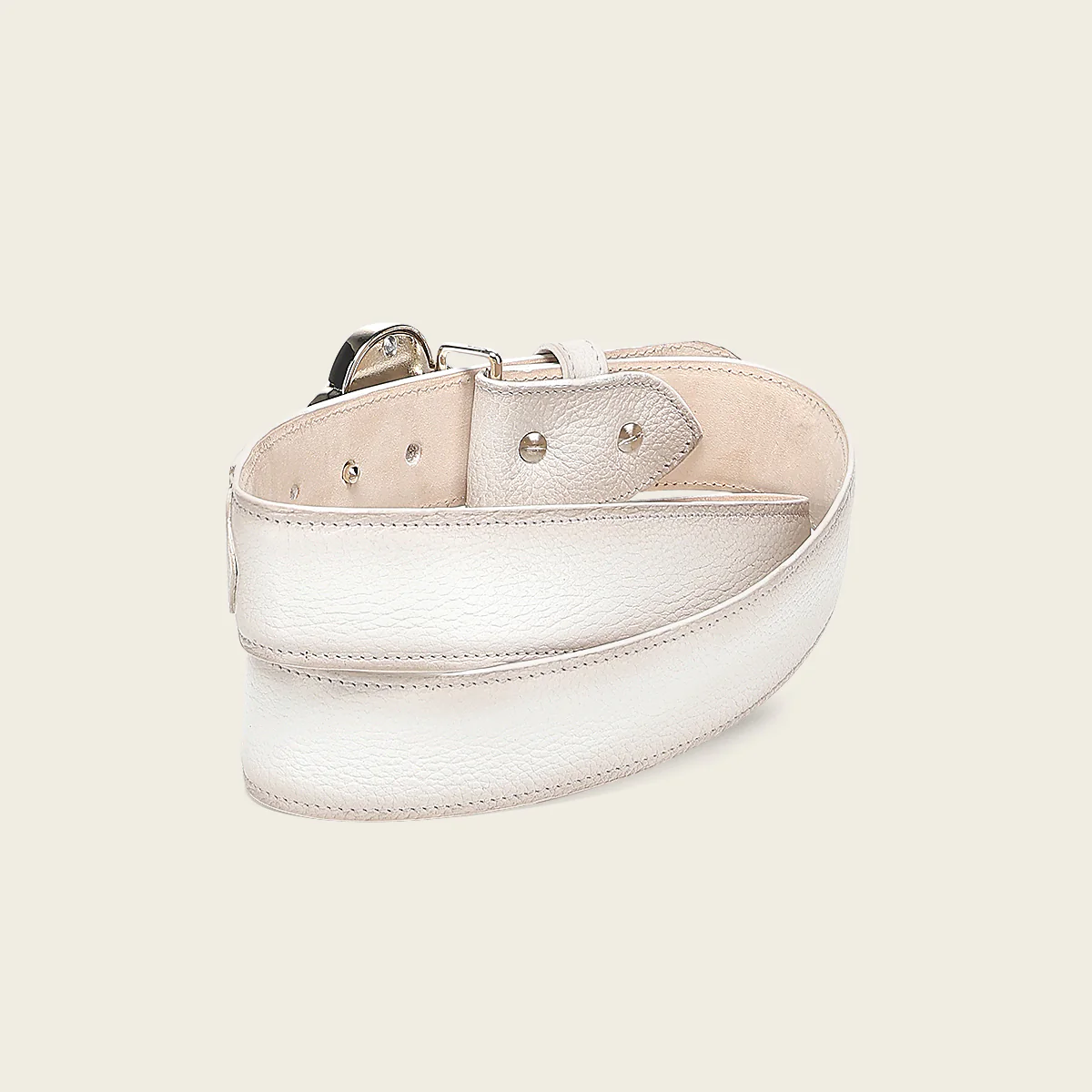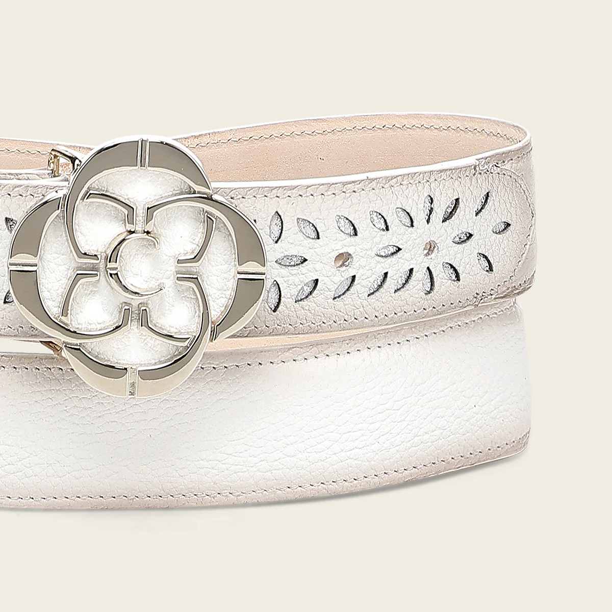 Cinturón para dama en piel genuina de bovino. Presenta perforado láser en motivos orgánicos sobre fondo tipo ante en contraste de textura. Hebilla con monograma Cuadra. Con forro en piel de bovino.