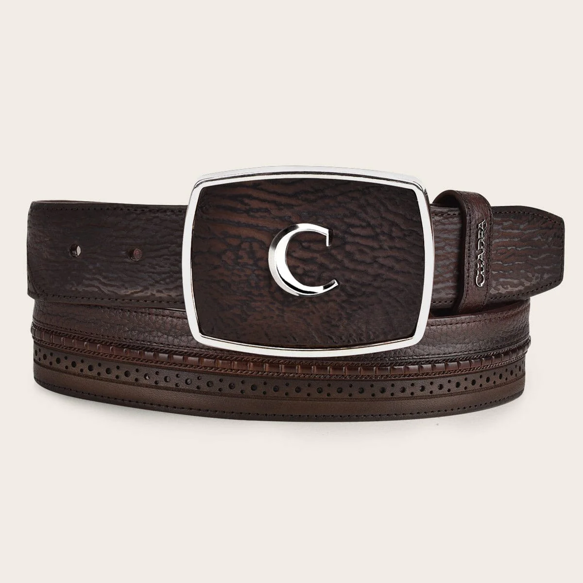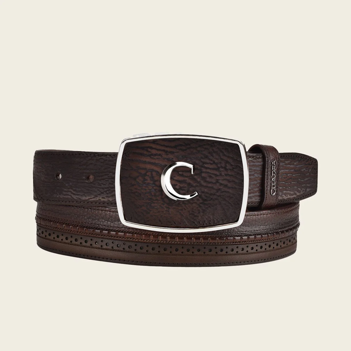 Una de las pieles más finas en un accesorio que complementará tu vestimenta tradicional. Color chocolate.