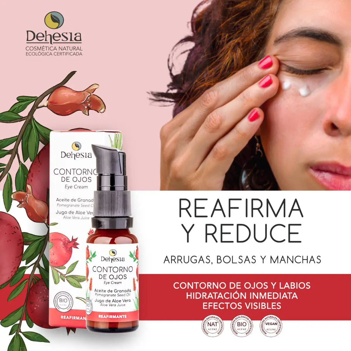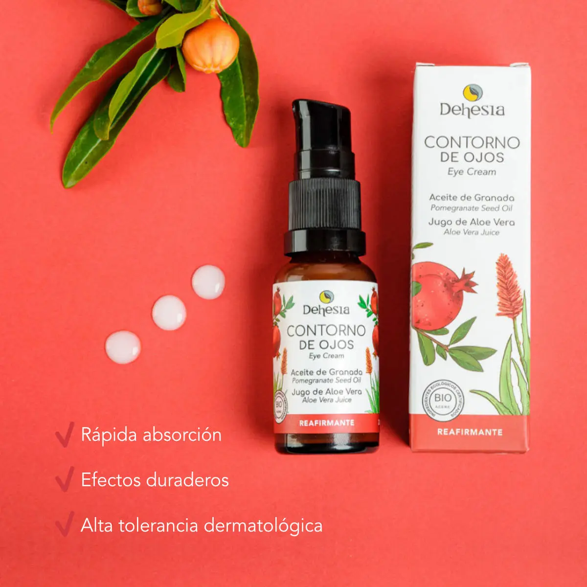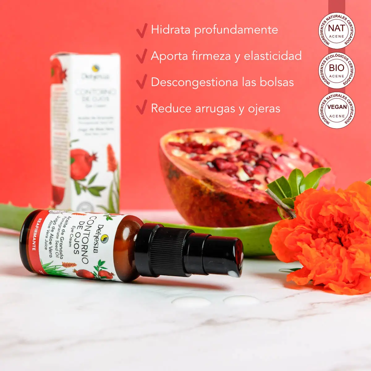 - Conjugamos la cafeína que ayuda a la microcirculación con el compuesto natural Zirhafirm® de eficacia probada por sus propiedades reestructurantes y reafirmantes que refuerzan la estructura interna de la piel. Además sumamos el poder hidratante del ácido hialurónico vegetal, las propiedades calmantes del hidrolato de rosas y la capacidad hidratante del jugo de aloe vera puro que deja una sensación de frescor y alivio inmediato en la piel. Aceite de granada como antioxidante, higo chumbo para descongestionar, romero como regenerador celular y centella asiática para combatir la flacidez y desinflamar la cuenca del ojo.