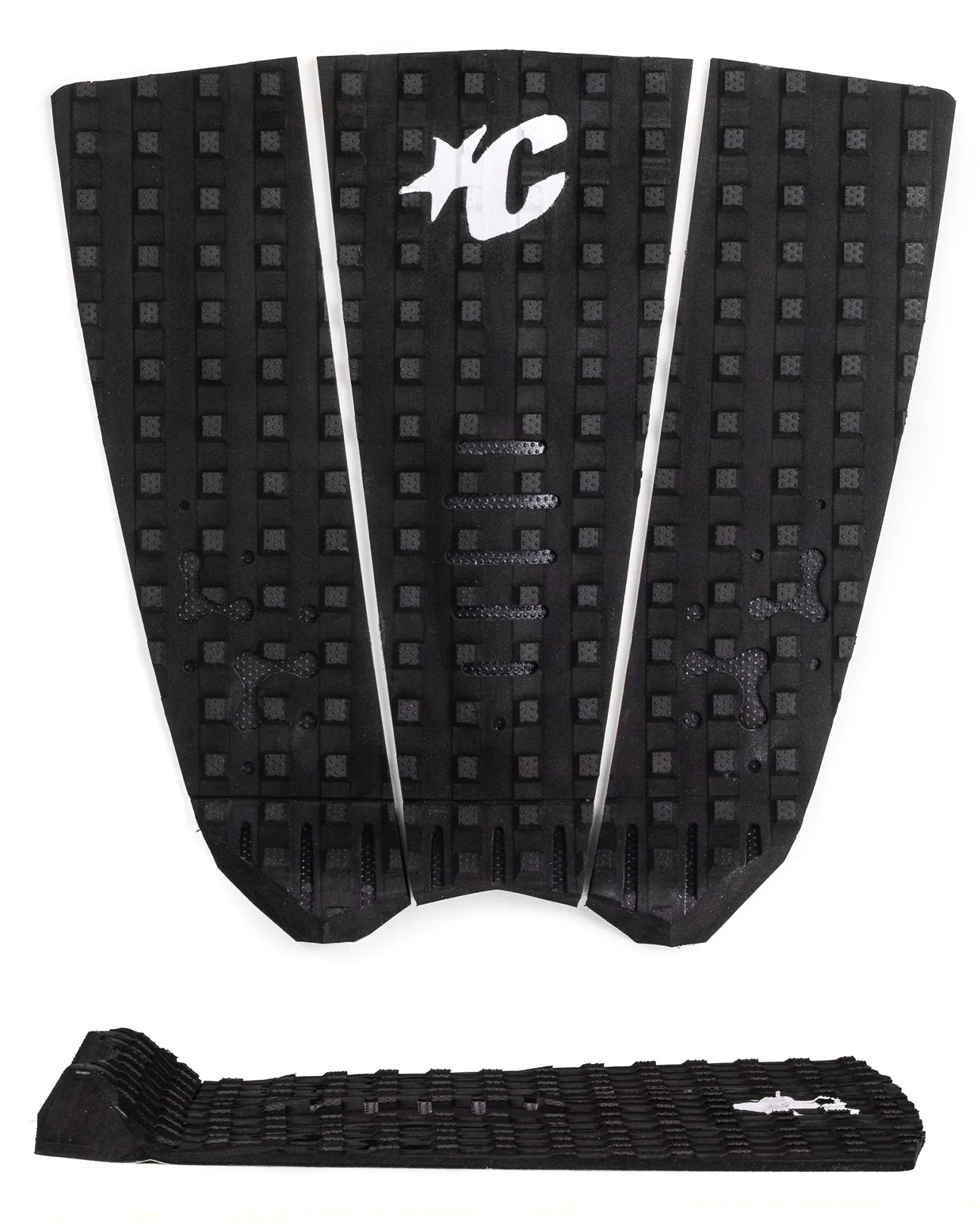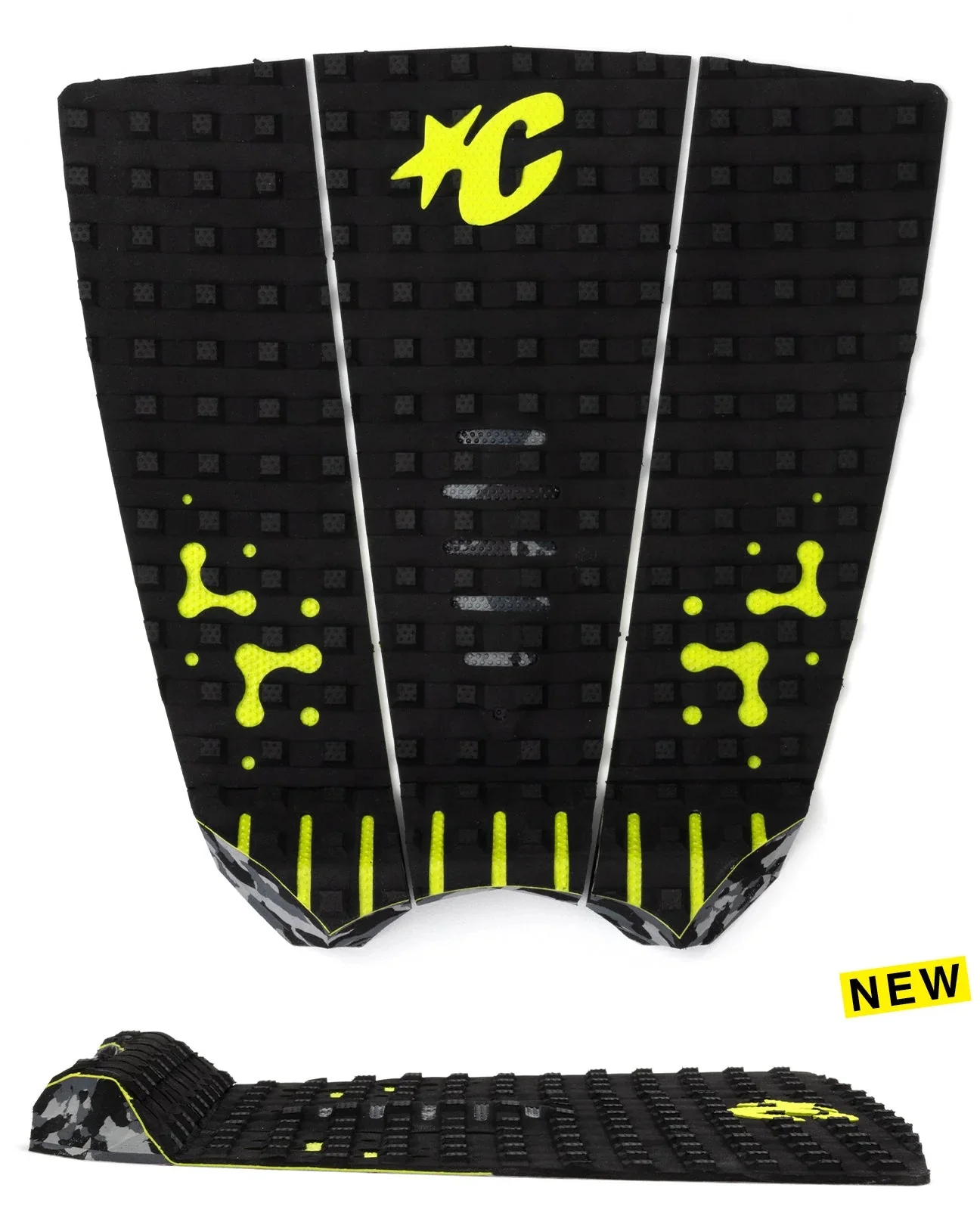 Grip trasero de surf Creatures Mick Fanning Loc-Lite Ecopure, diseño de 3 piezas con patrón Square Loc y acabado THERMO-LITE. Arco central de 7 mm y kick tail de 28 mm. Fabricado con espuma biodegradable EcoPure®, ideal para tablas de alto rendimiento.